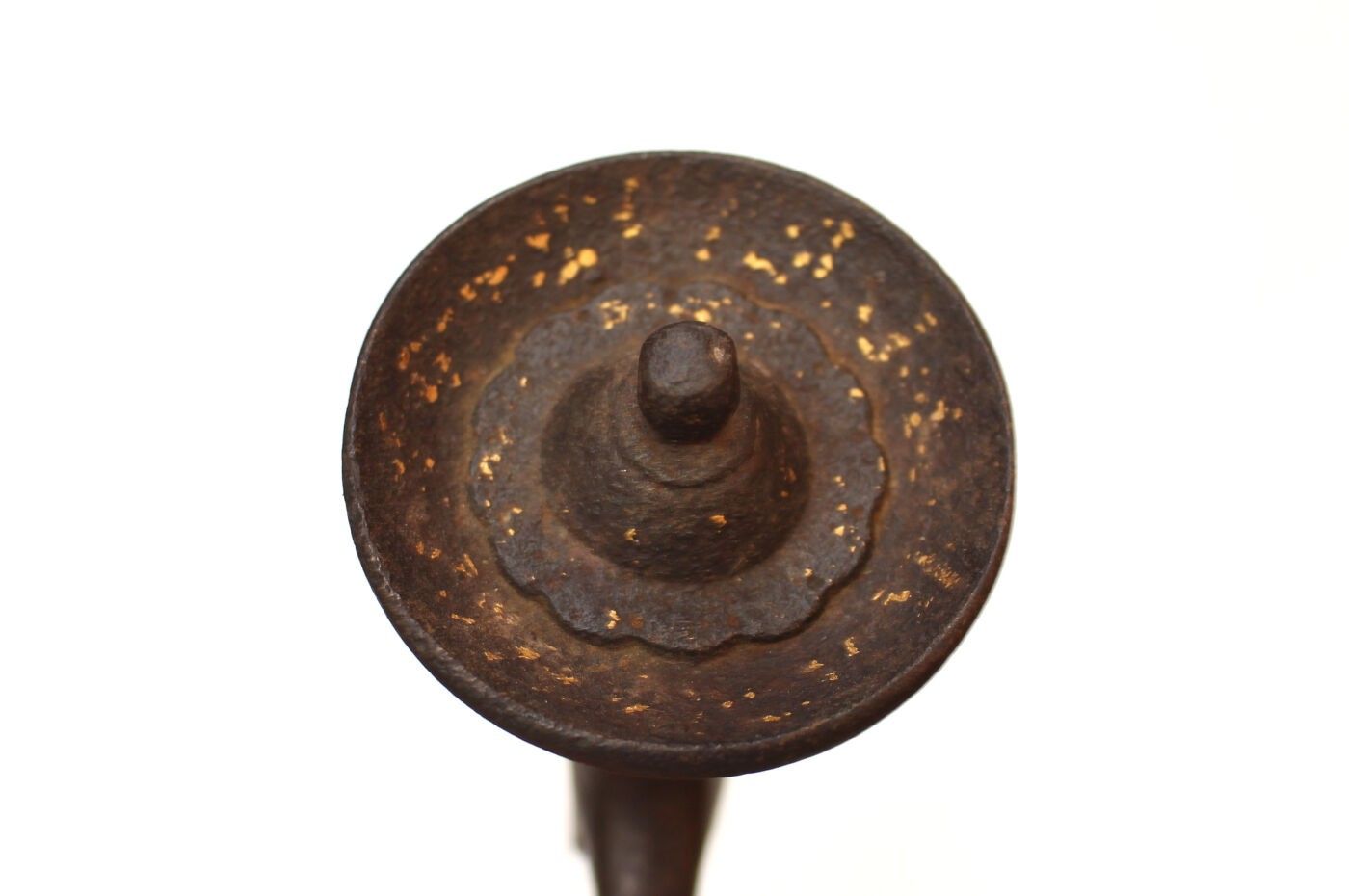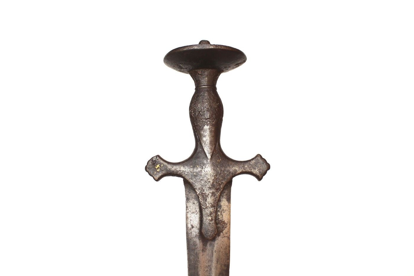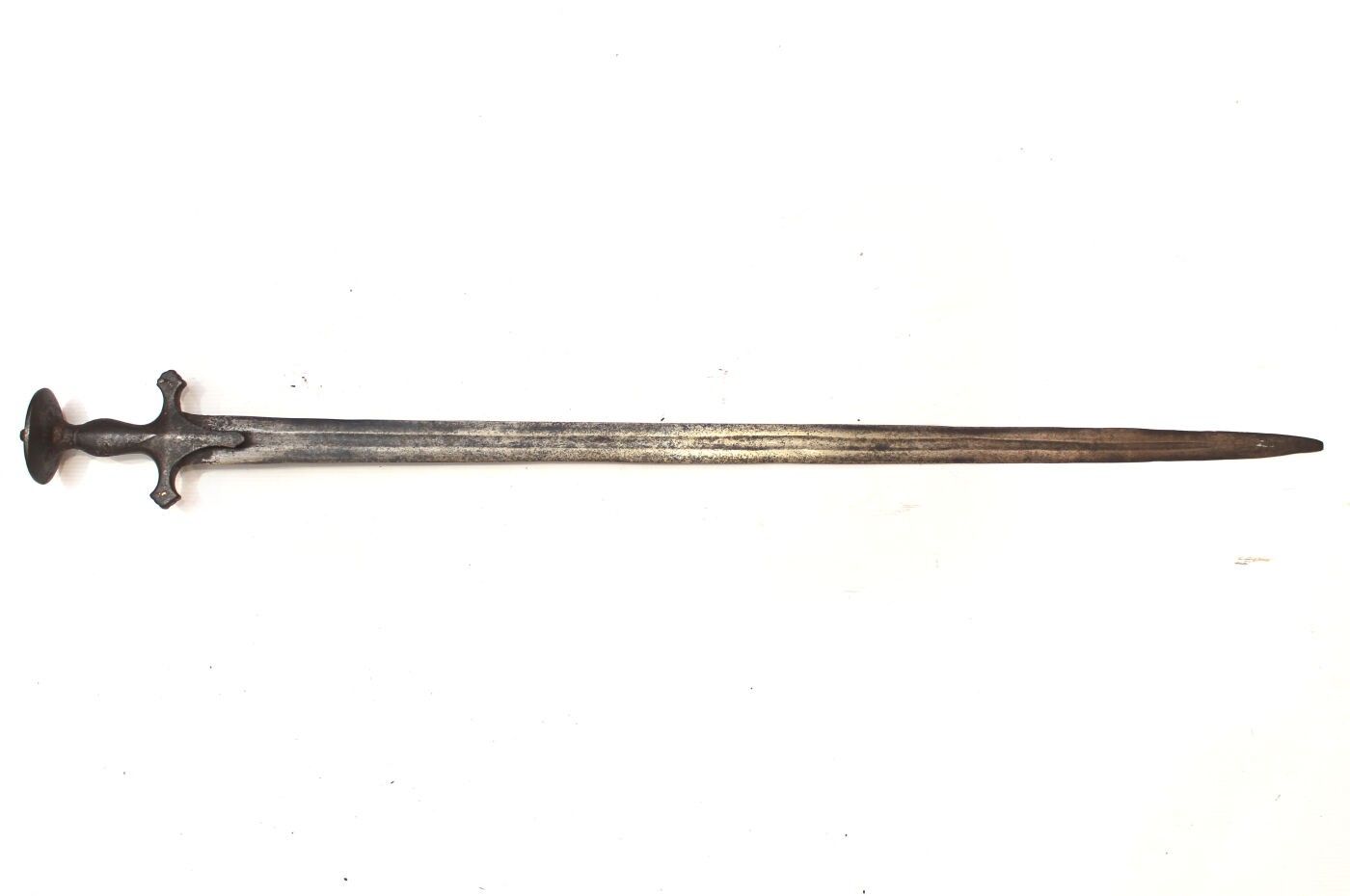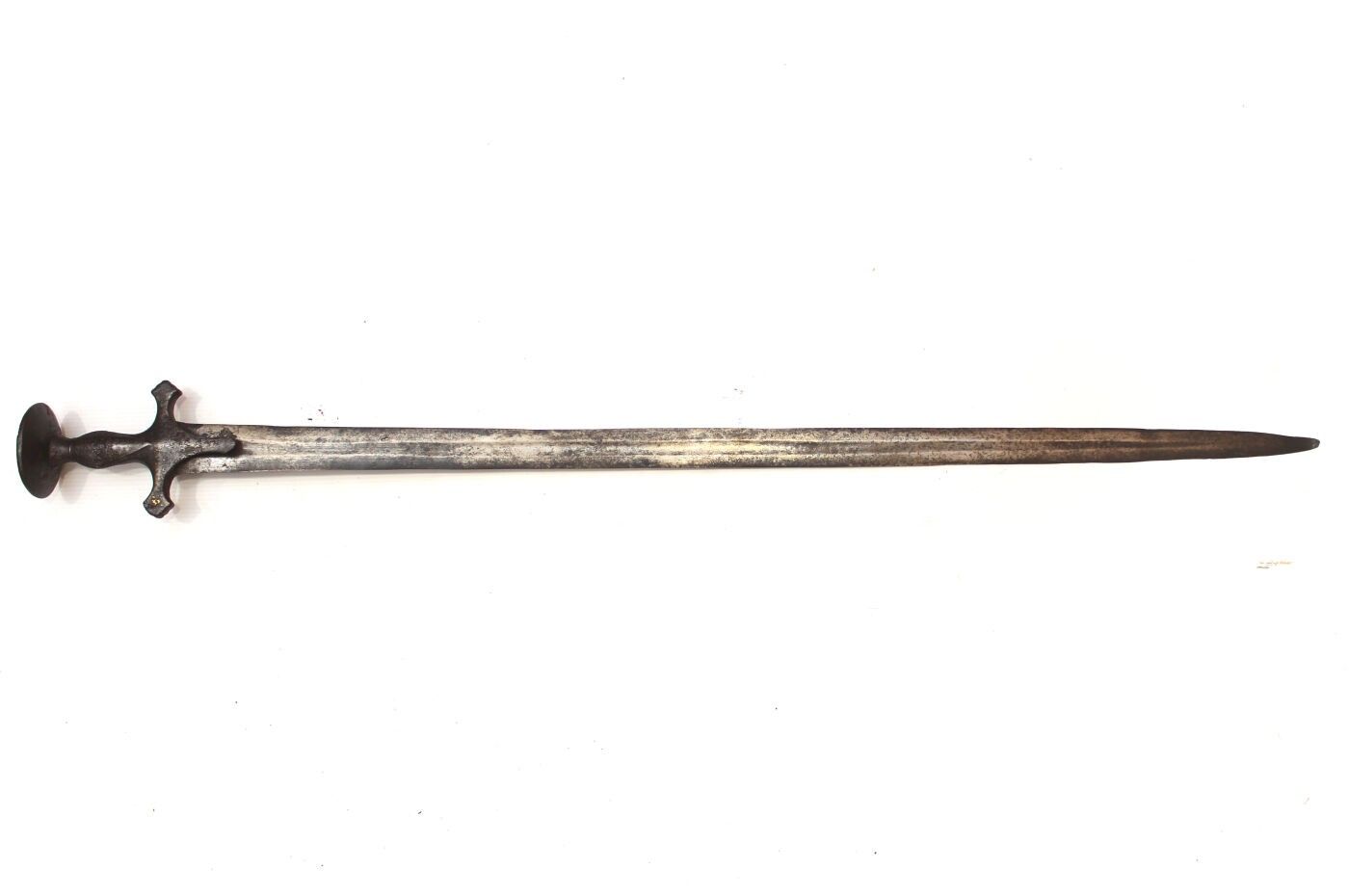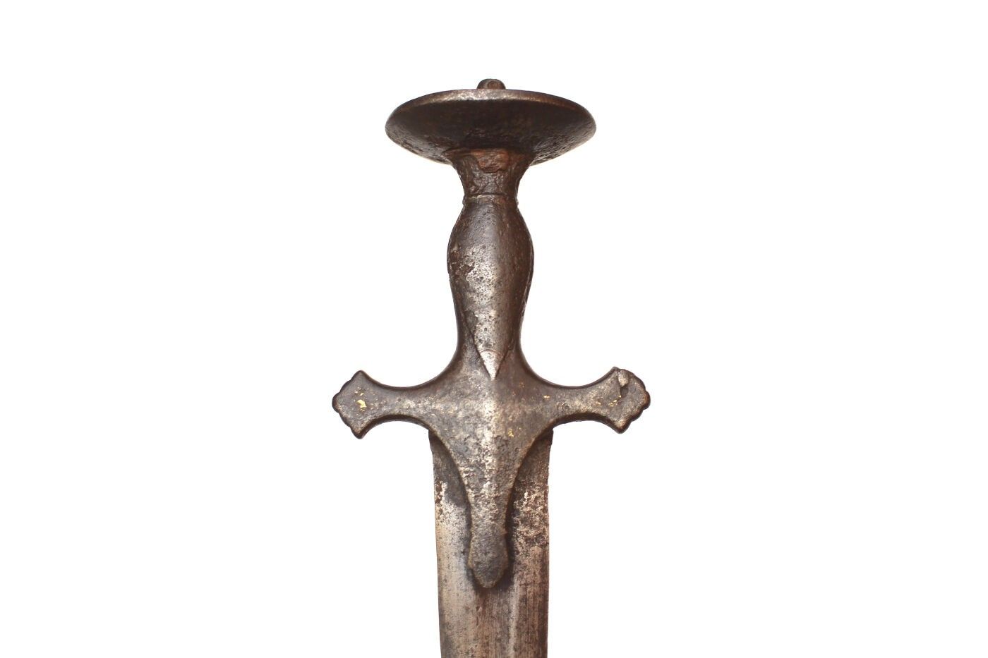 Firangi, India, 18th century. Straight European anterior blade, Mughal-style talwar handle, discoid pommel, extensive pitting and gilding remains. Total length 96 cm, blade 84 cm. Fair condition, black patina, twisted tip, no scabbard.