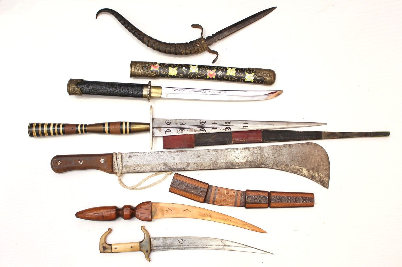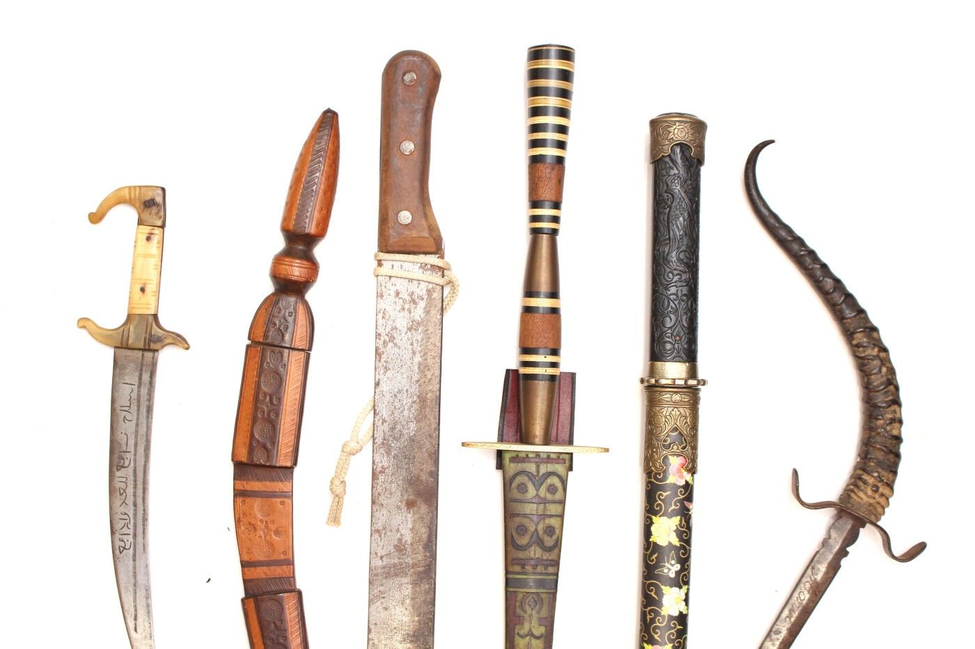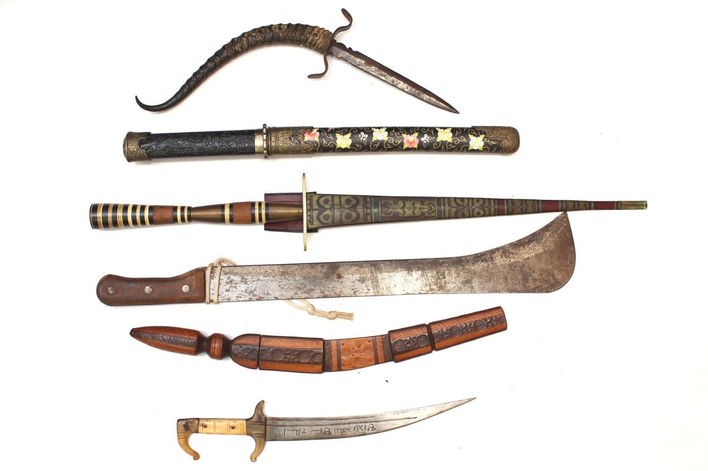 Set of 6 exotic daggers and knives: Dagger with antelope horn handle, blade marked Morocco; decorative knife in the Japanese style; large dagger from Mauritania; machete marked Crocodile Machets made in Ghana for Martindale, length 62 cm, blade 48 cm; Mauritanian knife with copper blade, Tunisian knife marked: this weapon is useful against enemies.
