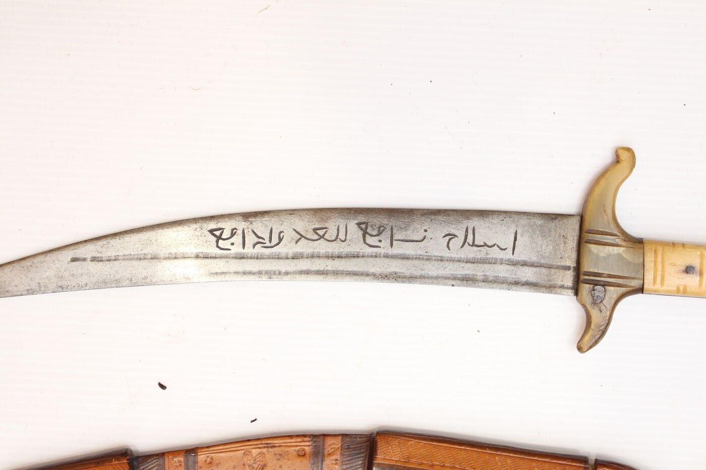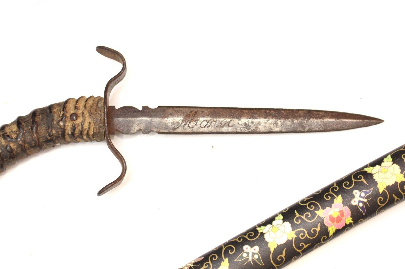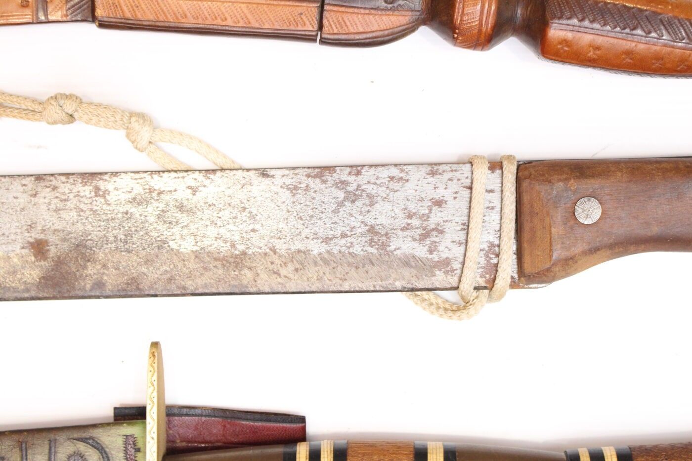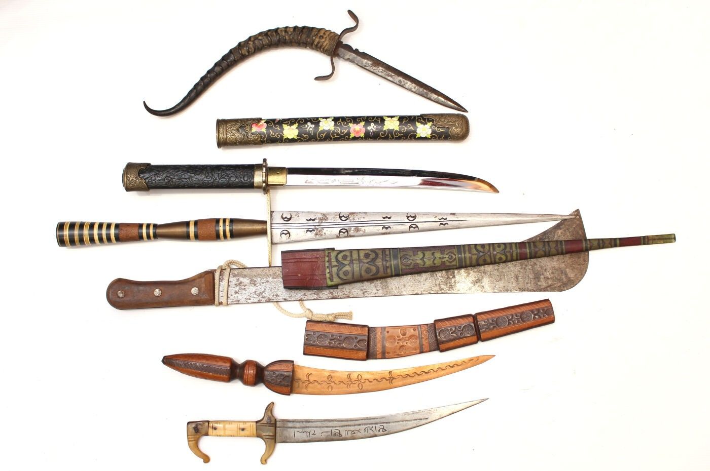 Set of 6 exotic daggers and knives: Dagger with antelope horn handle, blade marked Morocco; decorative knife in the Japanese style; large dagger from Mauritania; machete marked Crocodile Machets made in Ghana for Martindale, length 62 cm, blade 48 cm; Mauritanian knife with copper blade, Tunisian knife marked: this weapon is useful against enemies.