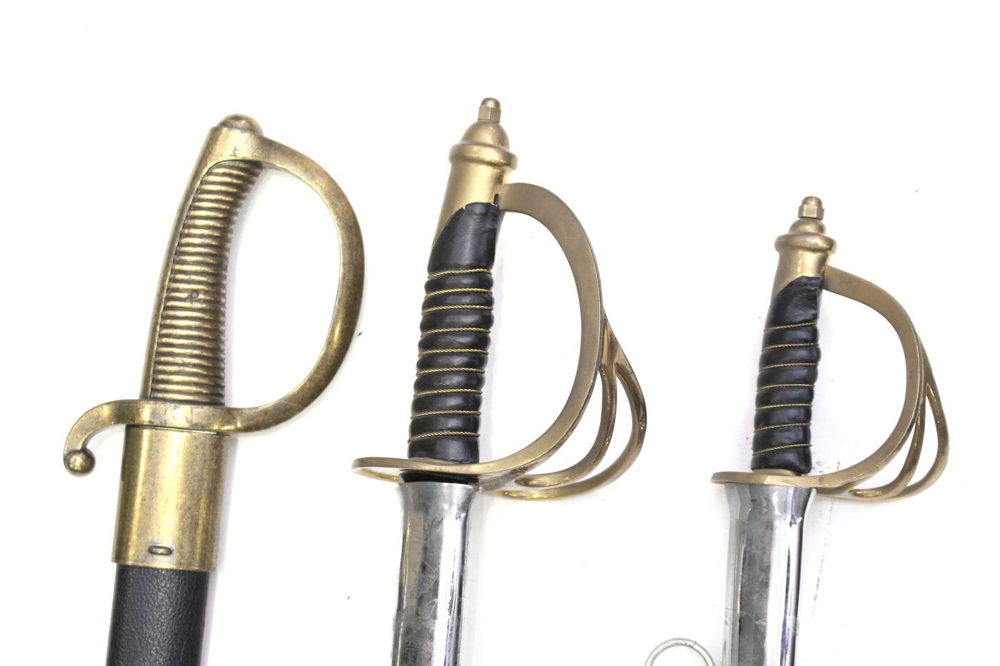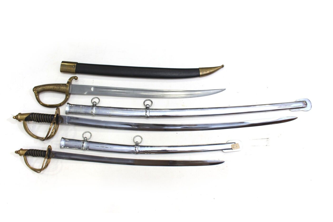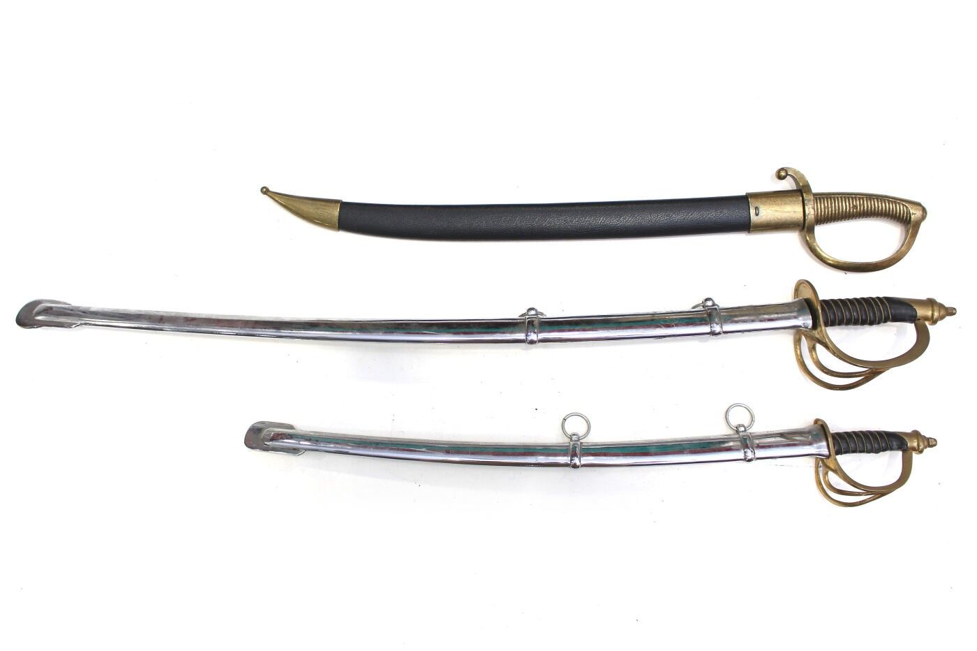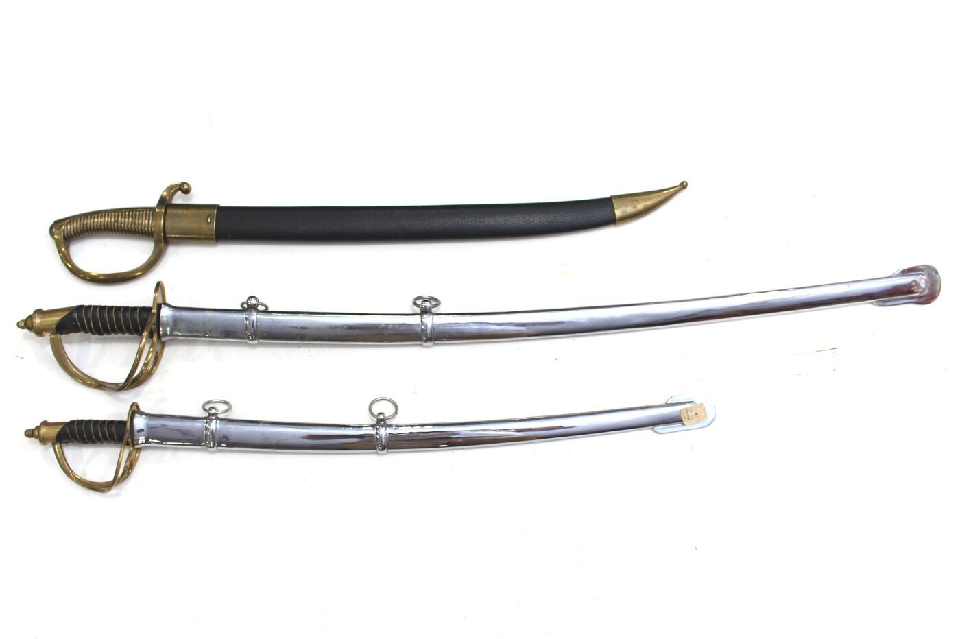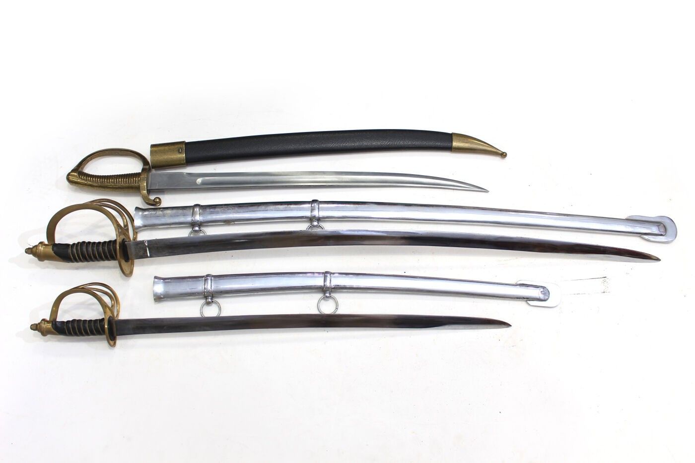 Set of 3 decorative reproductions of sabres, modern work. An infantry lighter model year XI, a cavalry sabre and its reduction. Lengths 107 cm, 67 cm and 67 cm. Good condition.