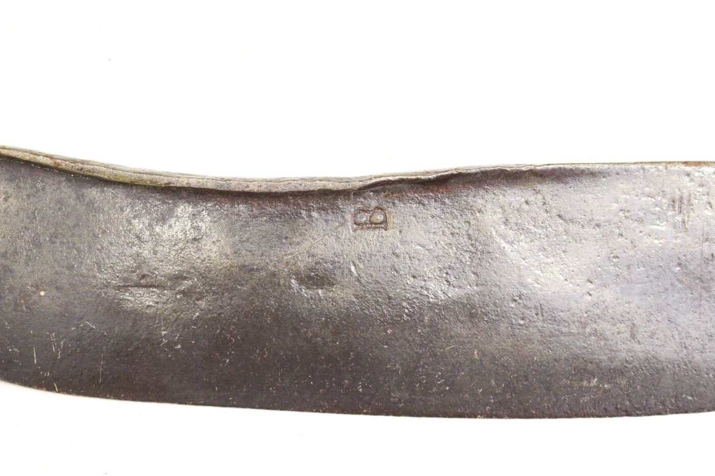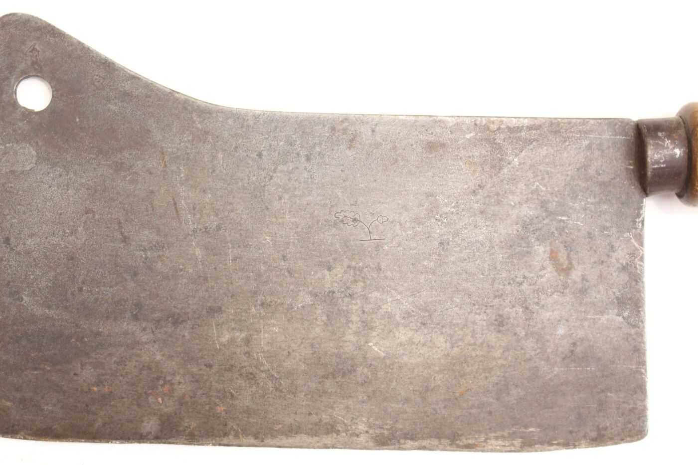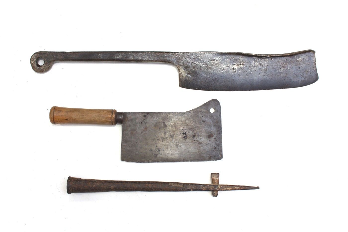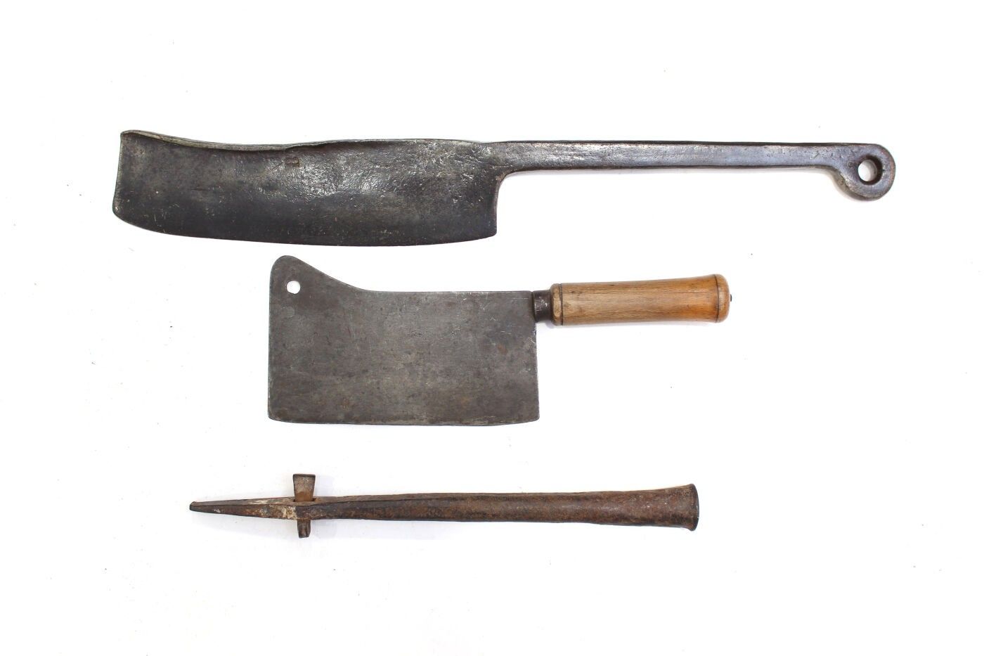Set of 3 pieces comprising two cleavers and a steel chisel with a guard. One cleaver stamped B, 57 cm, the other stamped with an oak leaf and acorn, 33 cm.