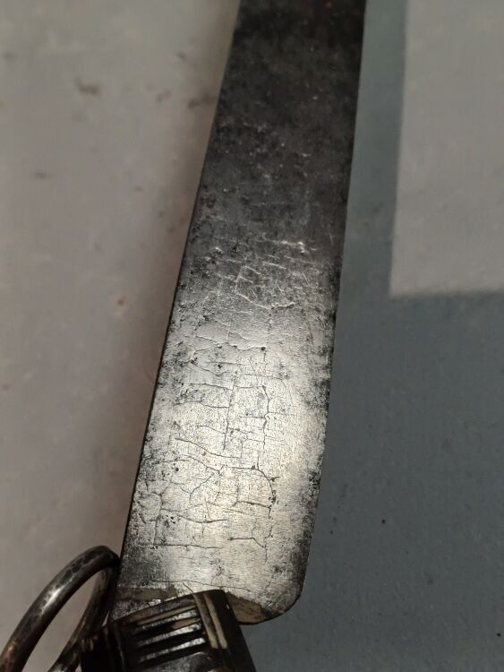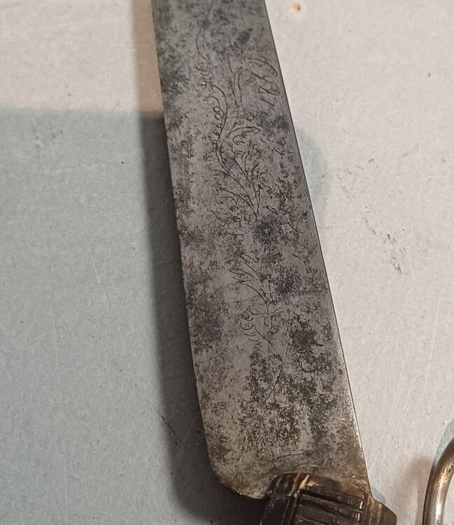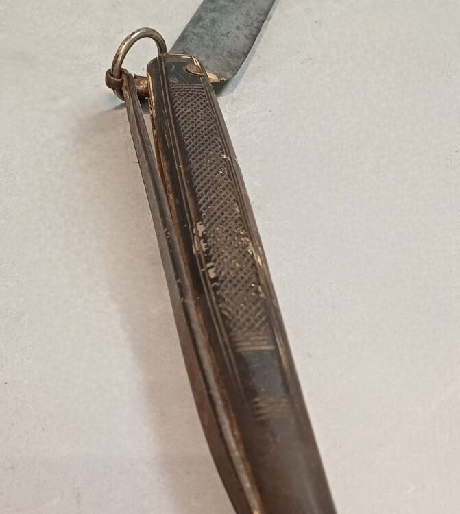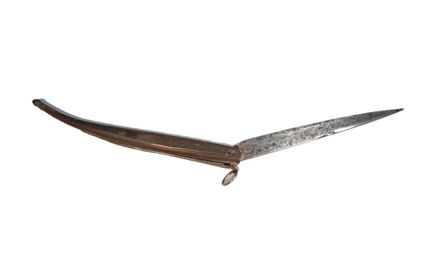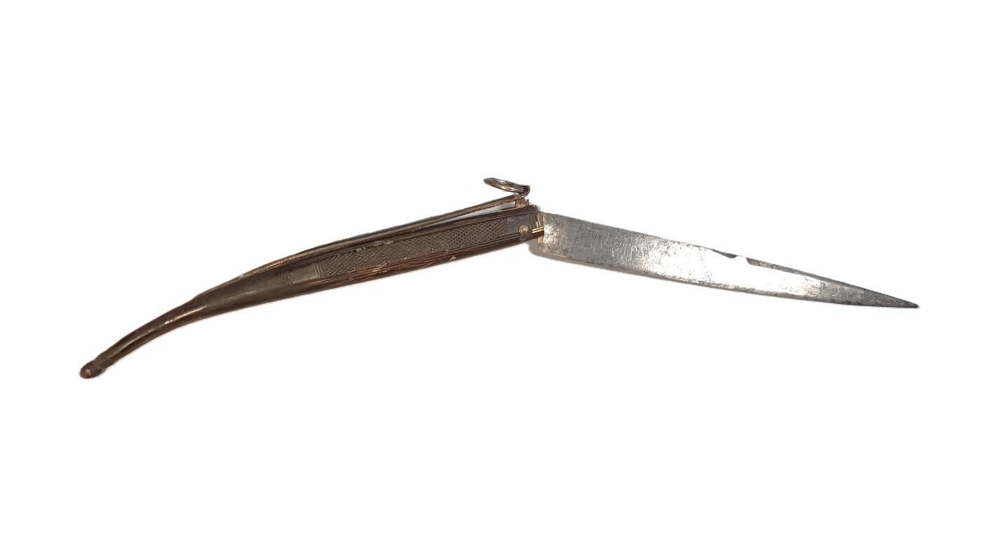 Navaja, large Spanish folding knife, dated 1869. Solid horn frame engraved with squares, steel blade engraved with foliage and dated 1869, maker's mark illegible. Length open 52 cm, closed 28 cm. Fairly good condition.