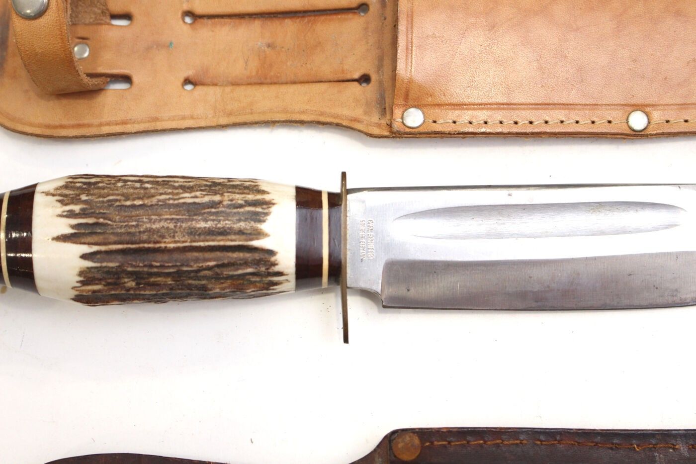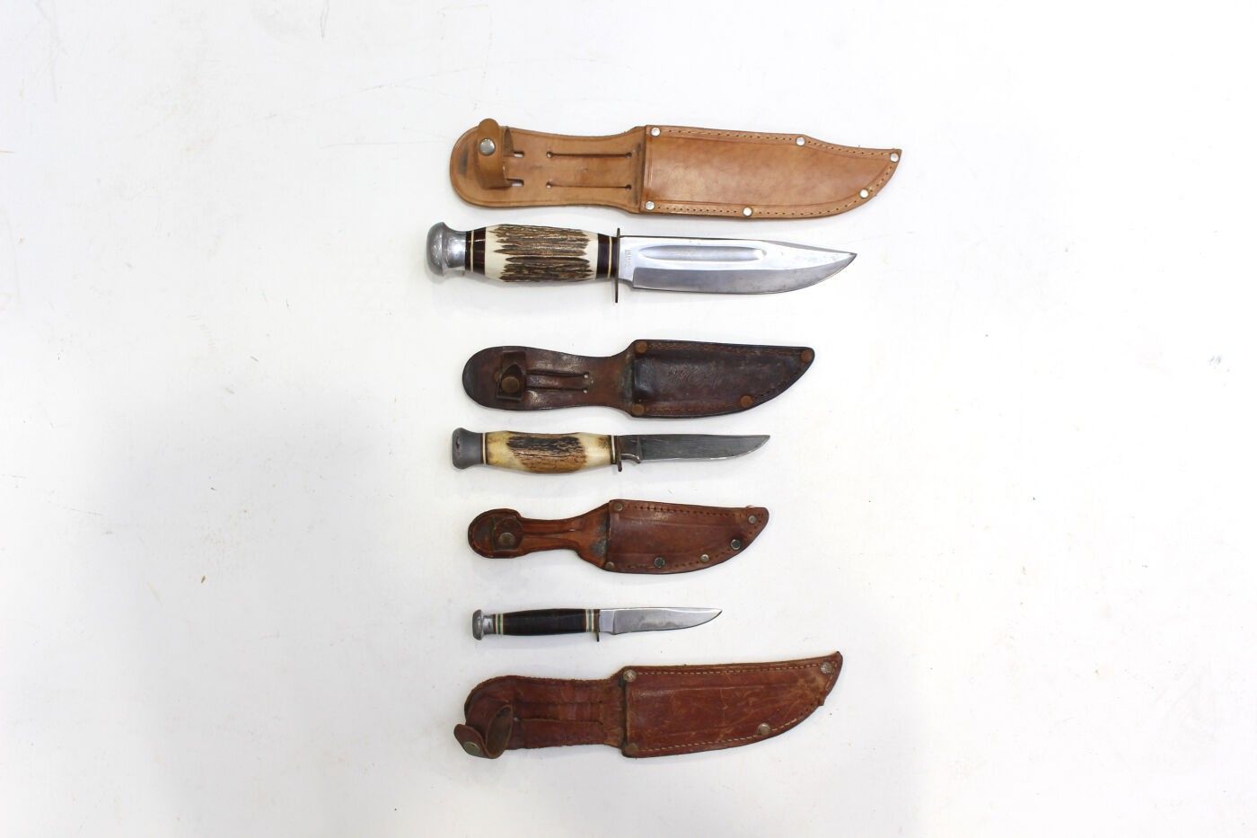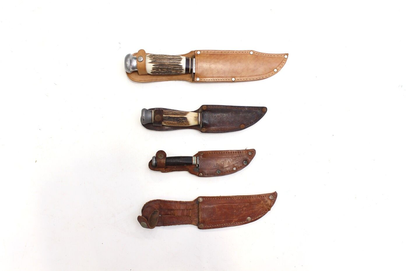 Set of 4 pieces: 3 hunting knives and one sheath. Blades by Carl Schlieper, Solingen Germany and Sabatier Jeune, made in France, antler and wood handles, leather sheaths. The largest 30 cm, blade 15.5 cm, the smallest 19 cm, blade 8 cm. Used condition.