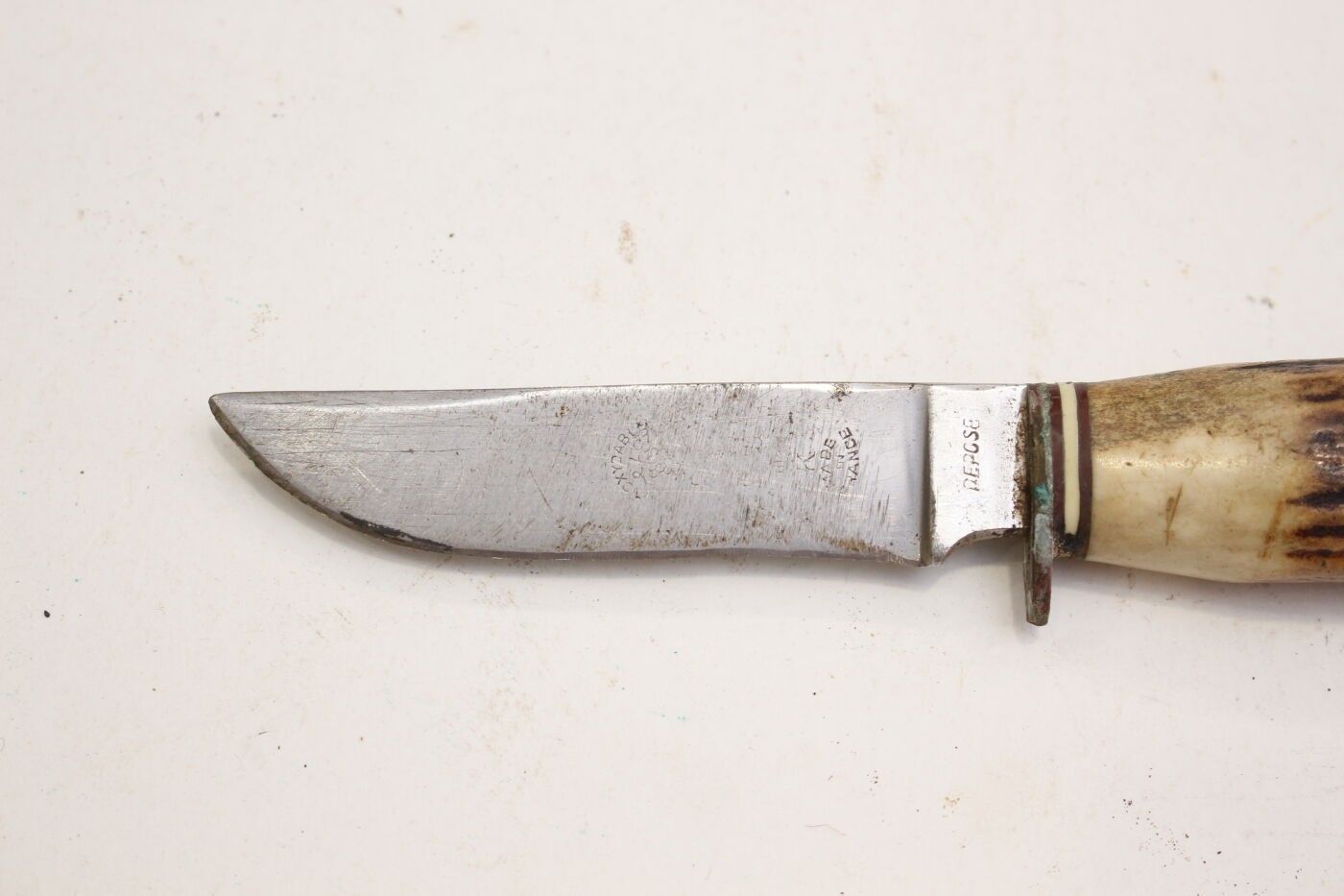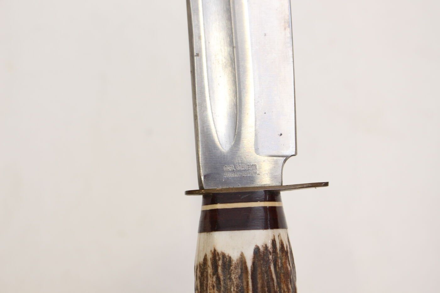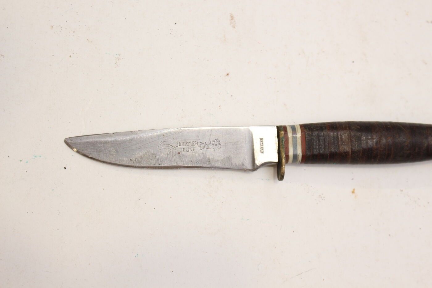 Set of 4 pieces: 3 hunting knives and one sheath. Blades by Carl Schlieper, Solingen Germany and Sabatier Jeune, made in France, antler and wood handles, leather sheaths. The largest 30 cm, blade 15.5 cm, the smallest 19 cm, blade 8 cm. Used condition.