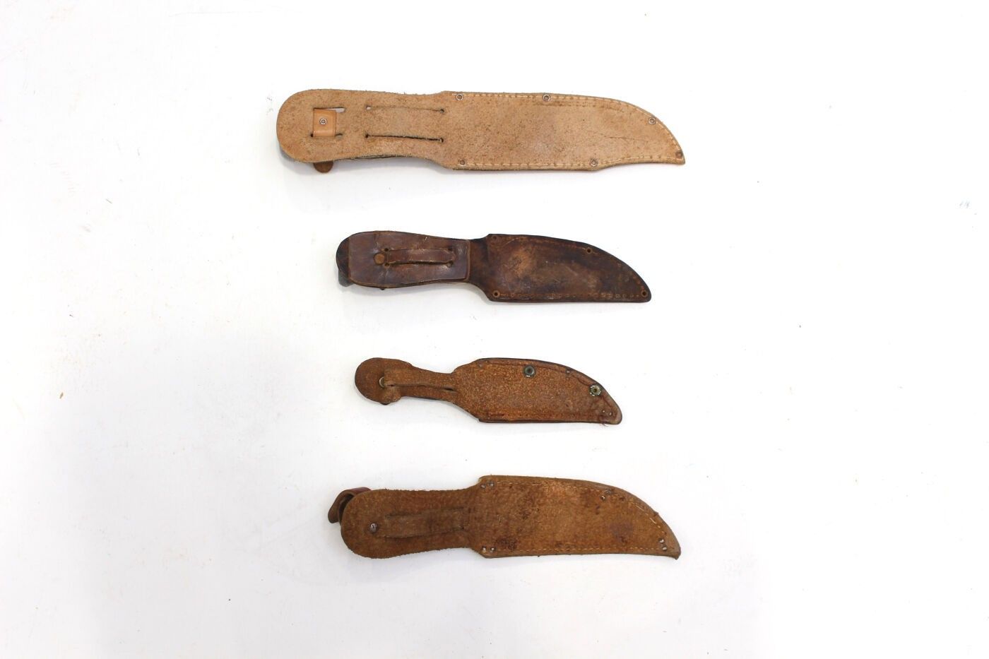 Set of 4 pieces: 3 hunting knives and one sheath.