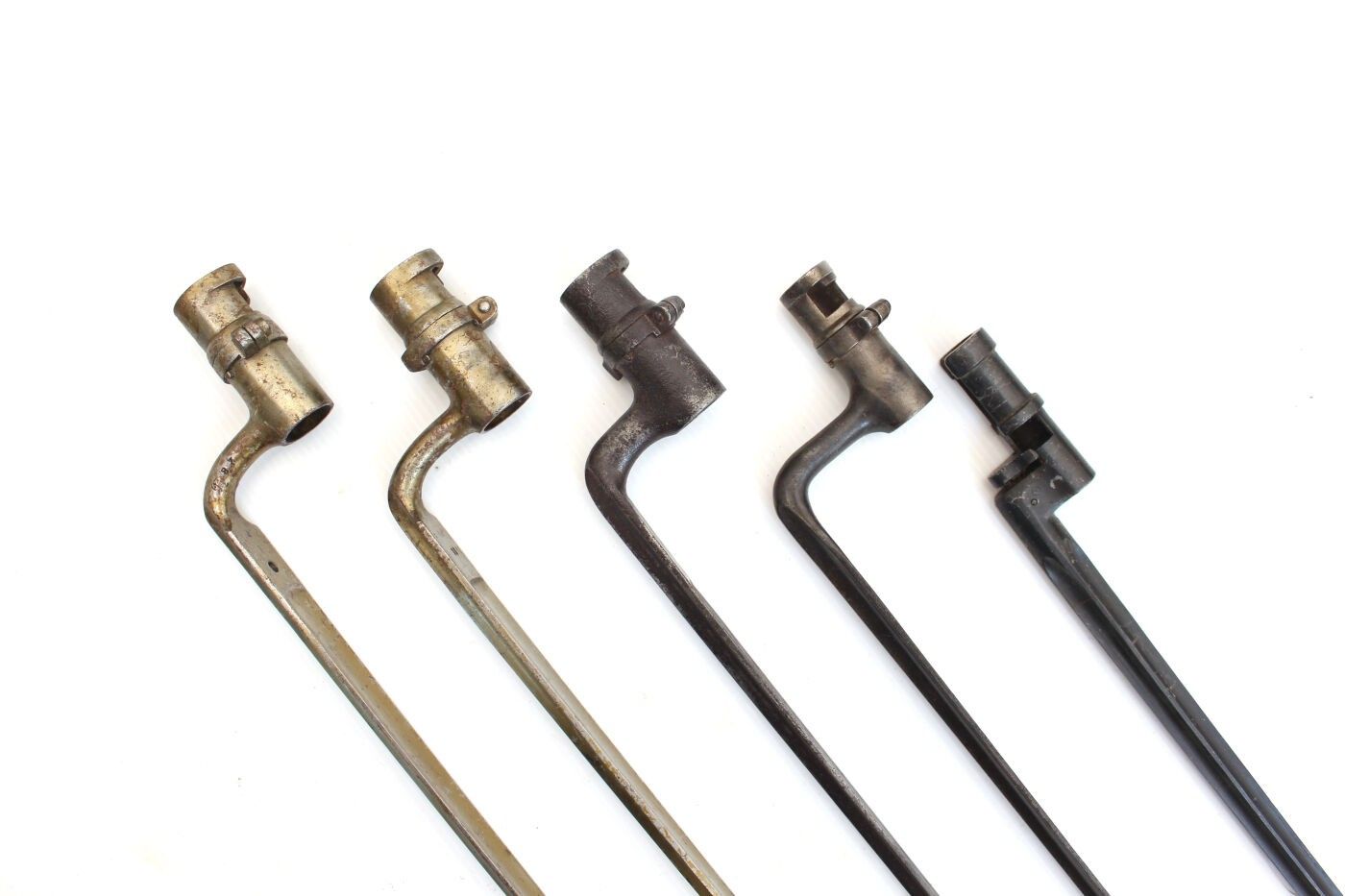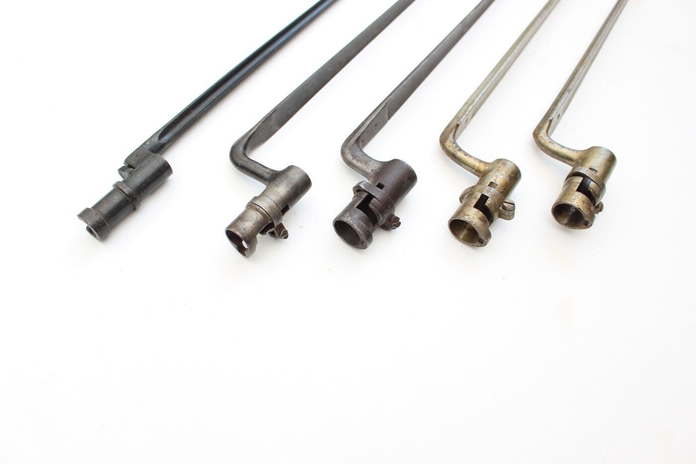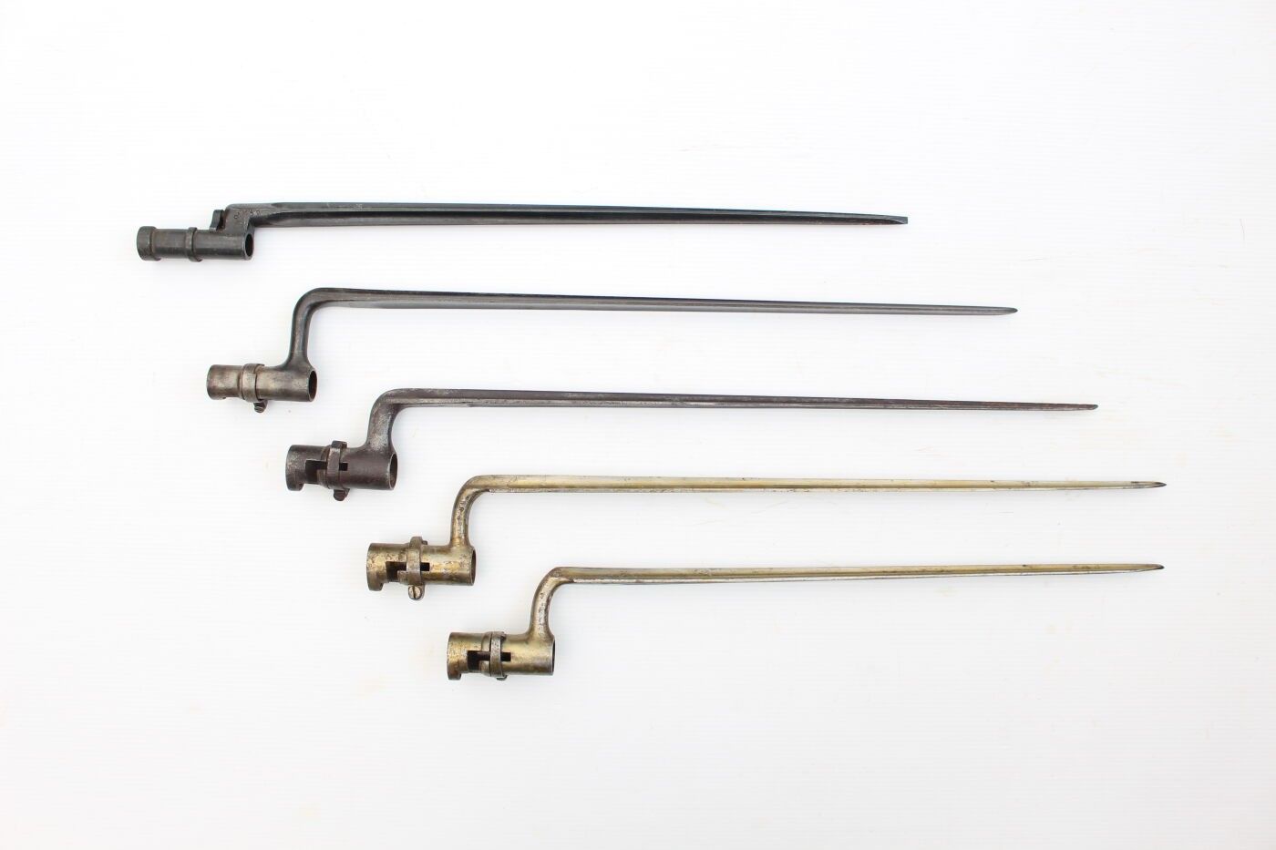 Set of 5 bayonets, French and foreign, 19th century, with rings. Model An IX (1805), hallmarked 29, 48 cm, blade 40 cm; model 1822 hallmarked 59, 53 cm, blade 45 cm; model de marine, 53 cm, blade 46 cm; model 1882 US de marine for Lee rifle, hallmarked US, 53 cm, blade 46 cm; model 1891/1930 Russian, hallmarked 2723, 50 cm, blade 41 cm.