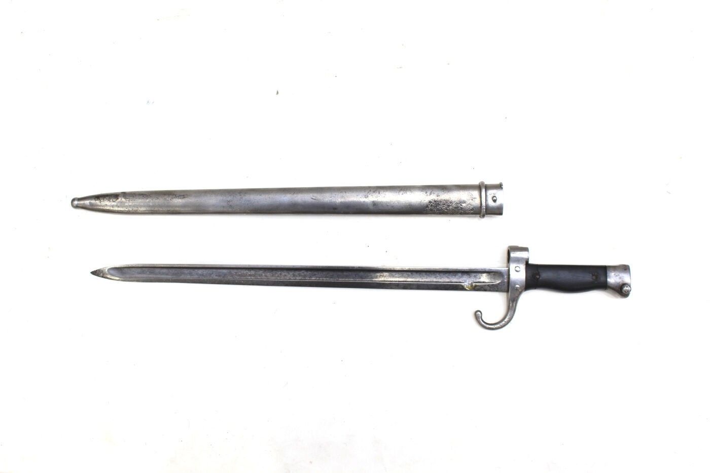 Model 1892 bayonet for Berthier rifle, France, Third Republic. Marks of control difficult to read, numbered 26361, number on the scabbard illegible. Total length 52.5 cm, blade 40 cm. Fair condition, cleaned, plates cracked.