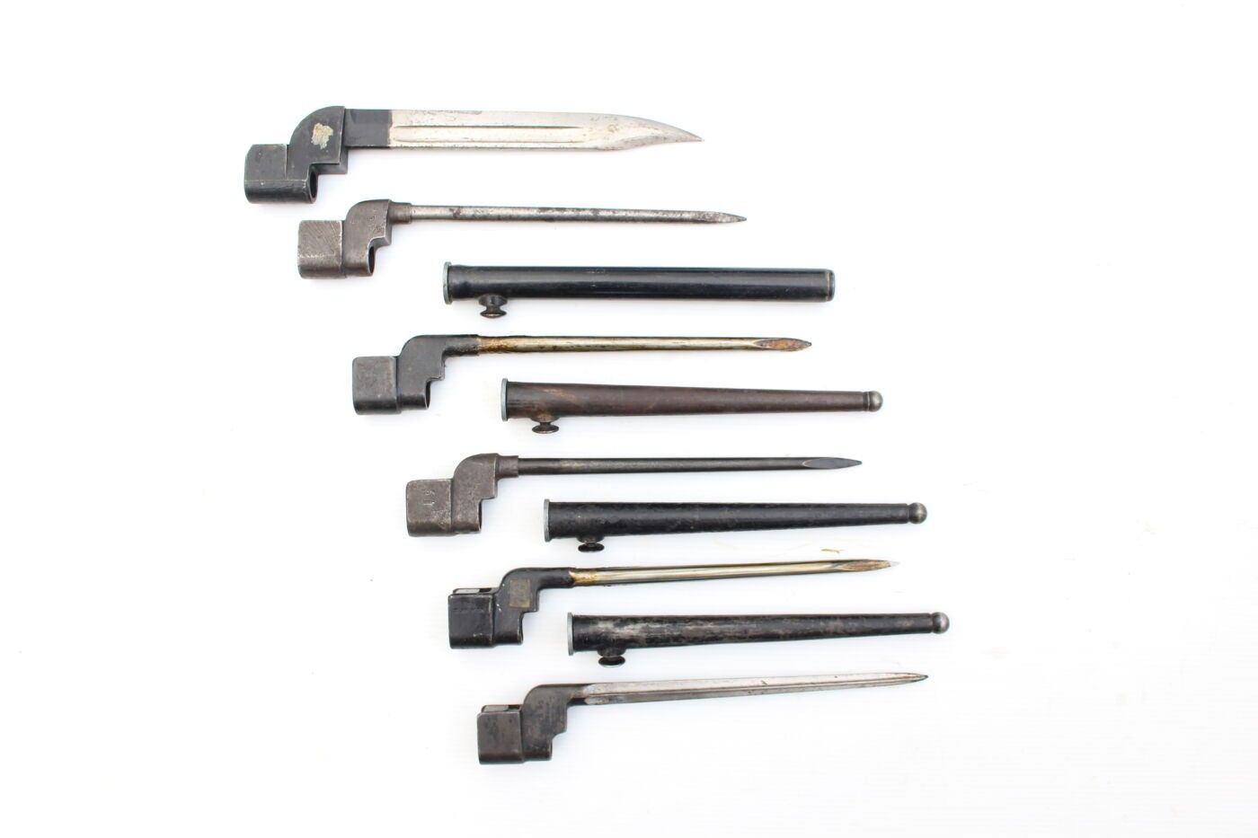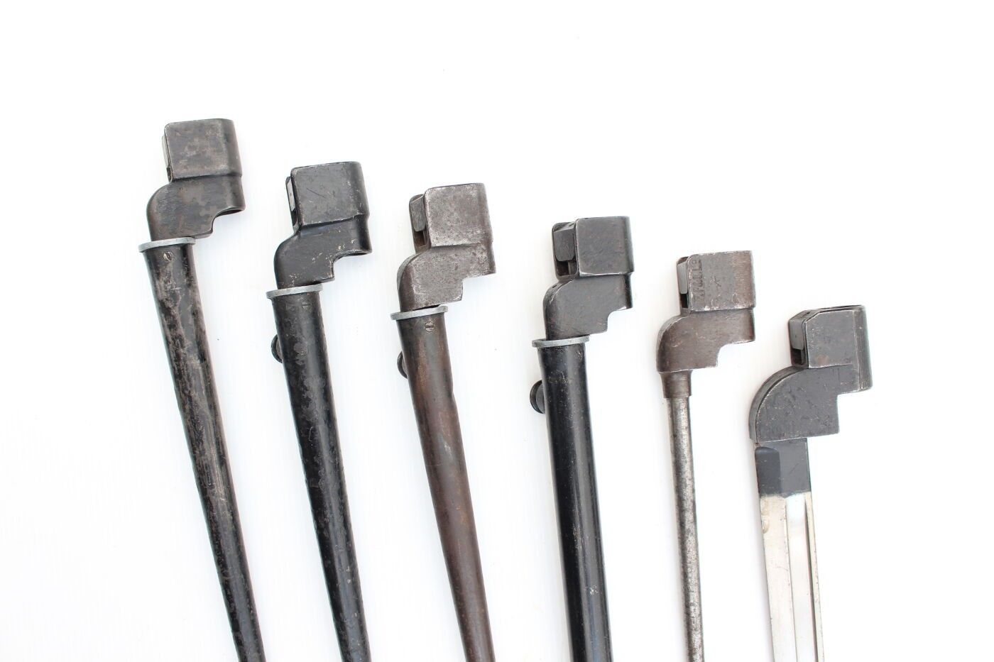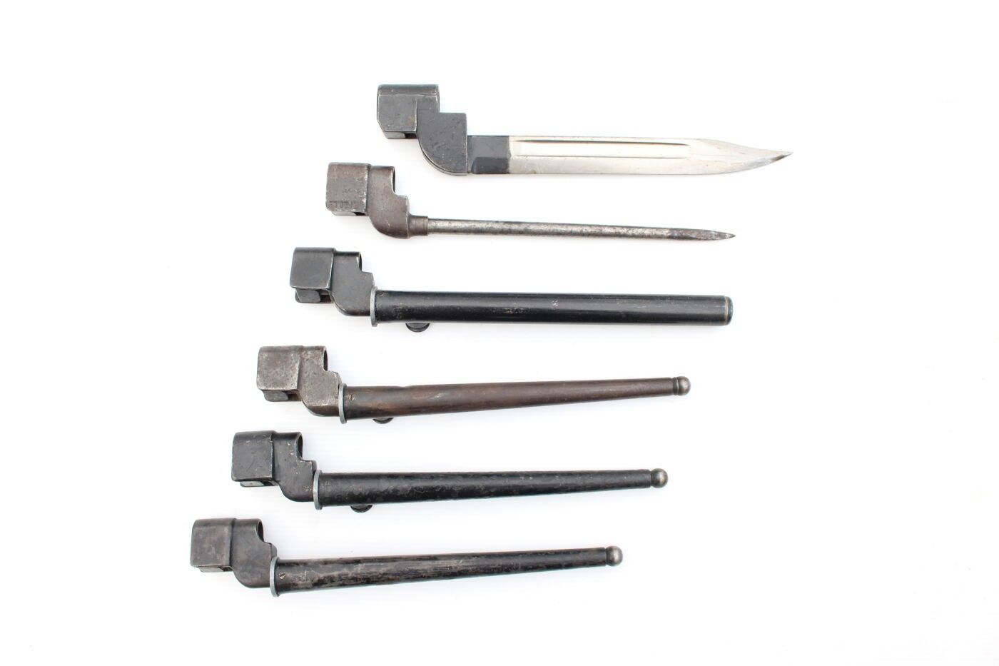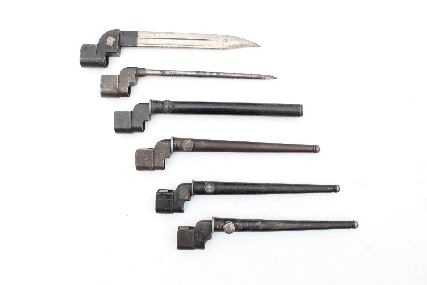Set of 6 nail bayonets, United Kingdom, 20th century. Model n°4 MK I and four n°4 MK II, one without scabbard; one n°9 MK I with bowie blade, 26 cm, blades 20 cm.