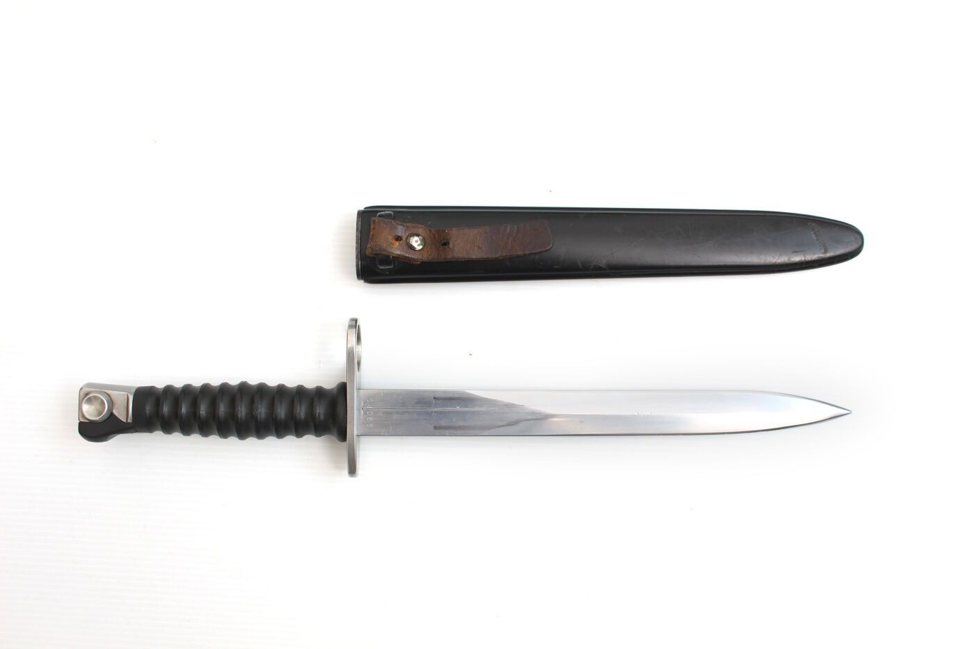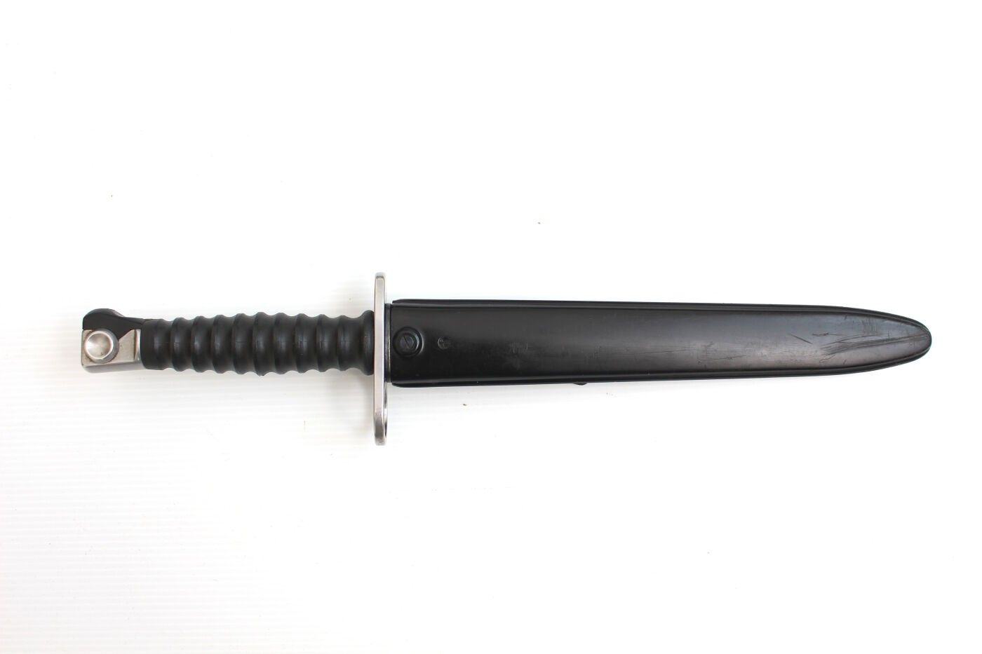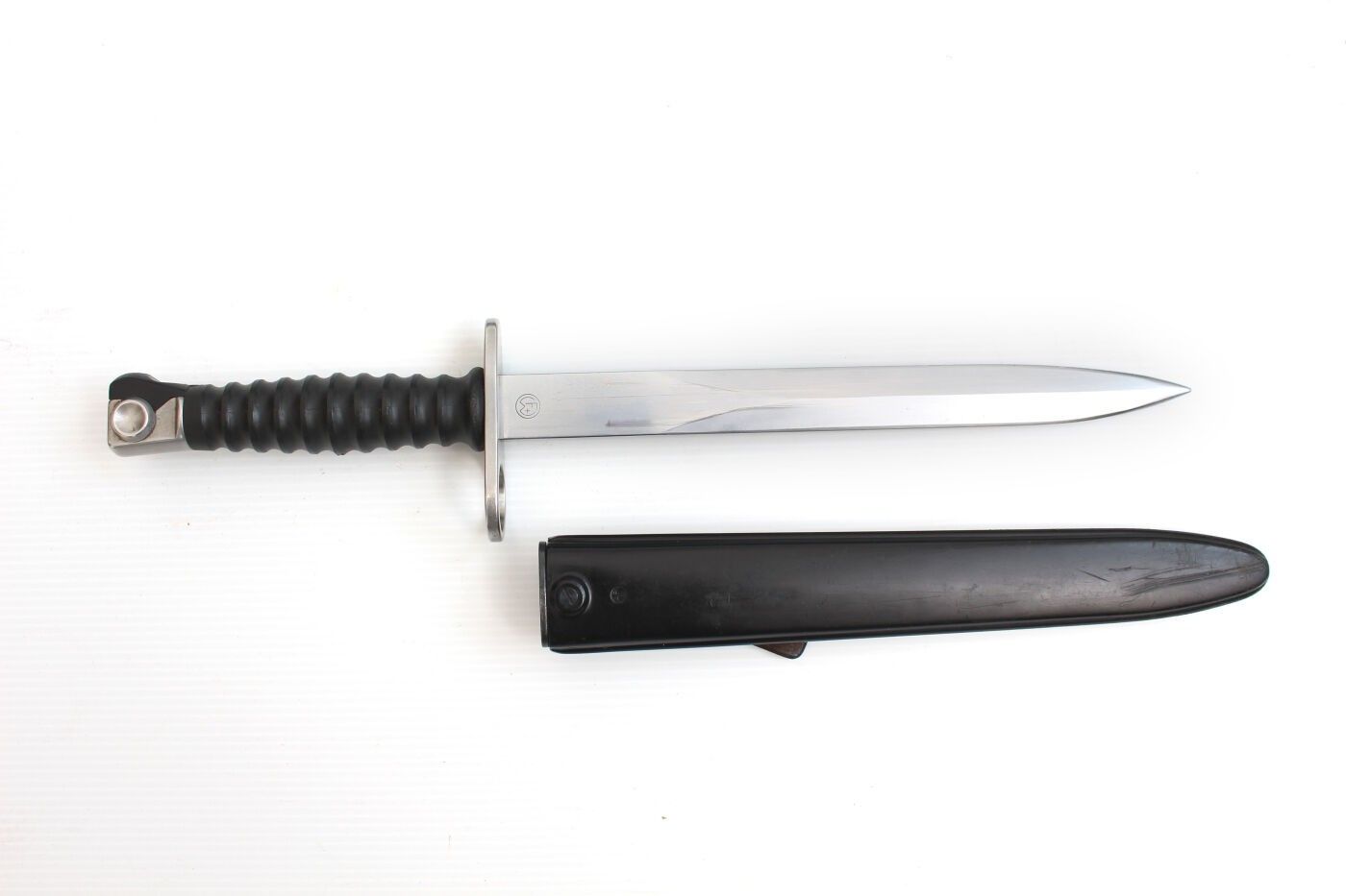 Swiss bayonet model 1957. Plastic handle, blade marked W 14063 and F+W (maker), scabbard marked APN. Overall length 38 cm, blade 24 cm. Good condition.