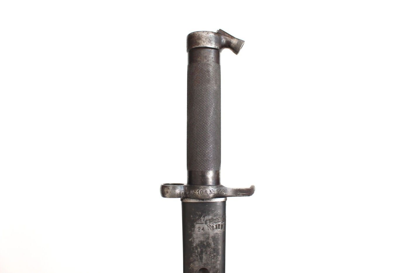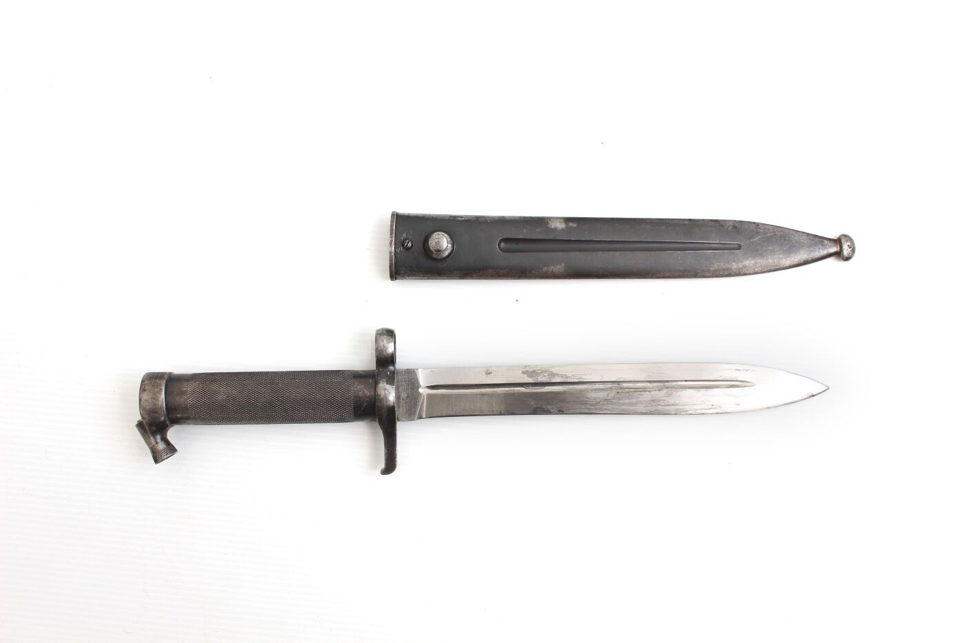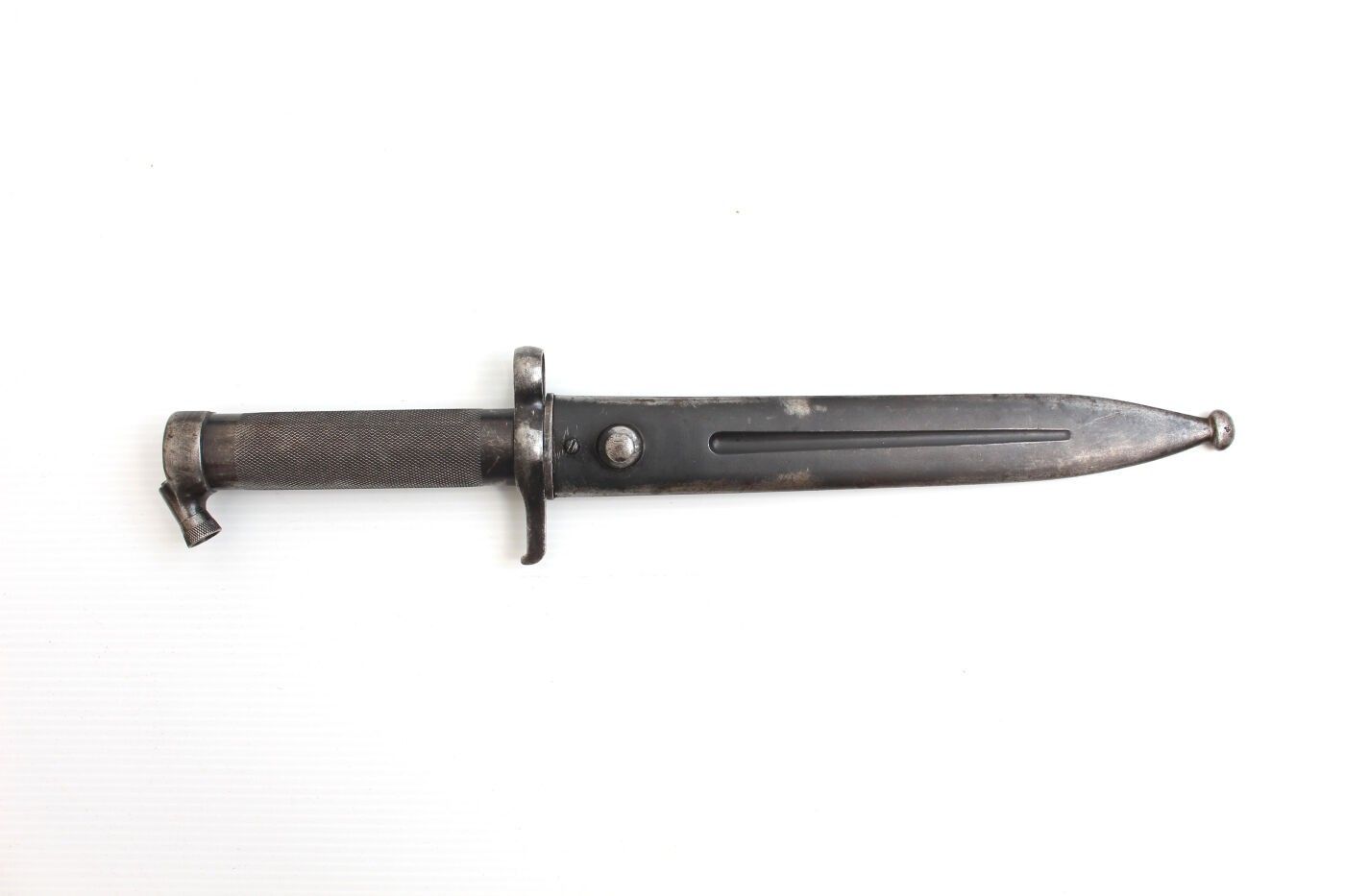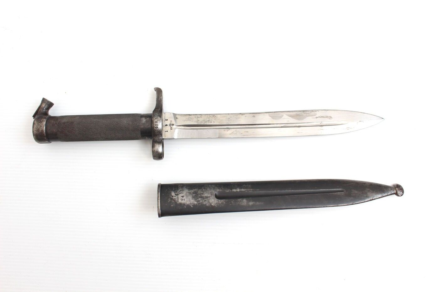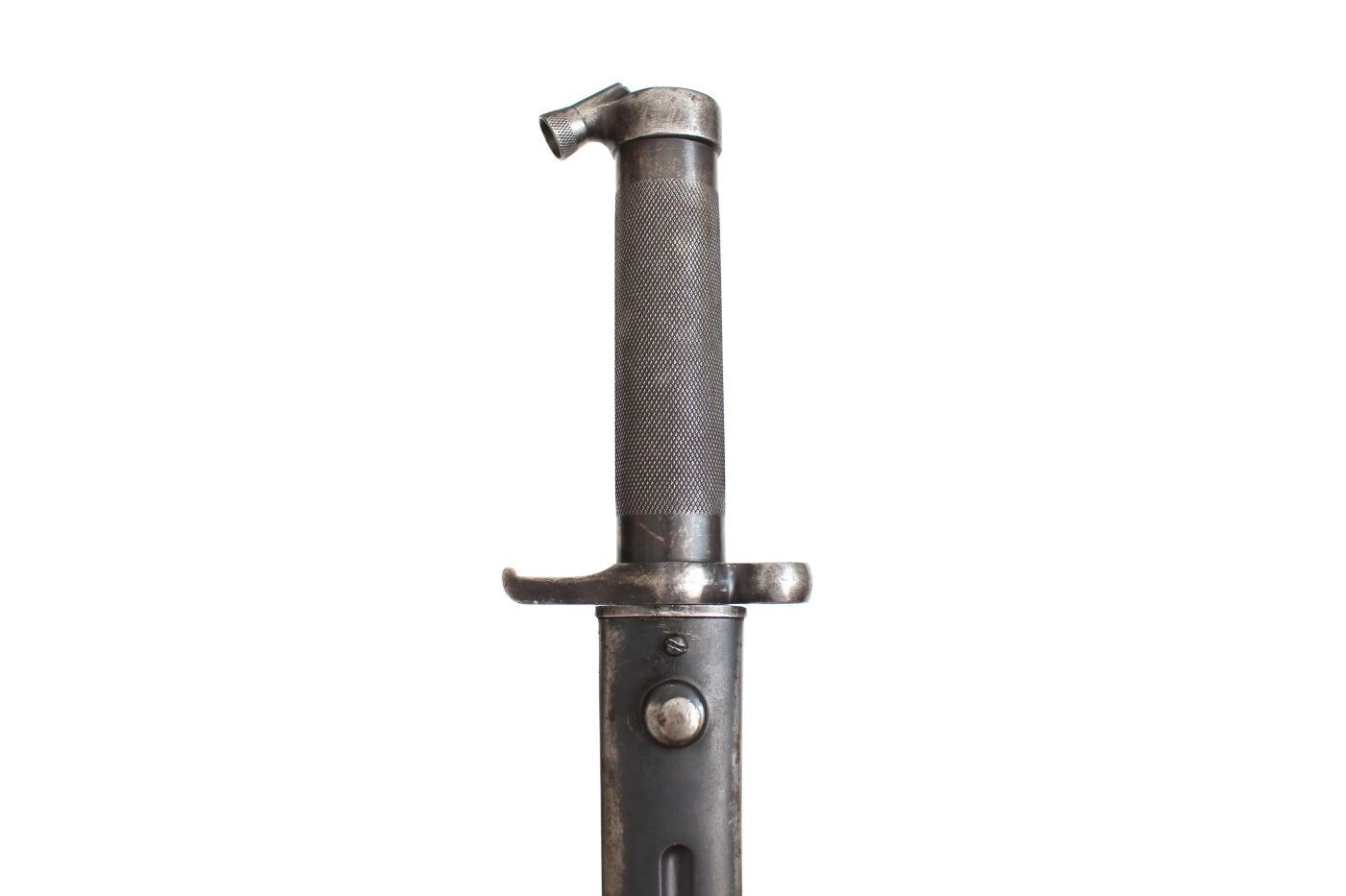 Swedish bayonet model 1896, first half of the 20th century. Marked 7th Infantry Regiment, 10th Zone No. 329, scabbard 24th Infantry Regiment, No. 121, hallmarked EJ AB with anchor and crown for Eskilstuna Jernmanufactur arsenal. Total length 35 cm, blade 21 cm. Good condition.