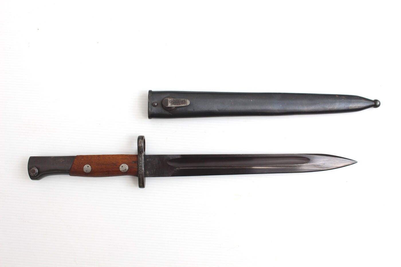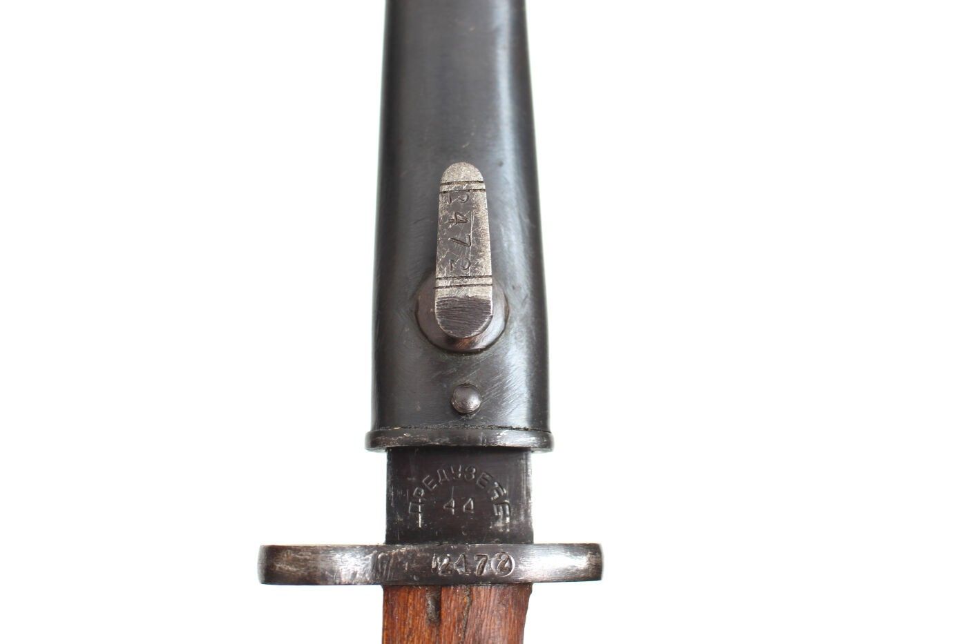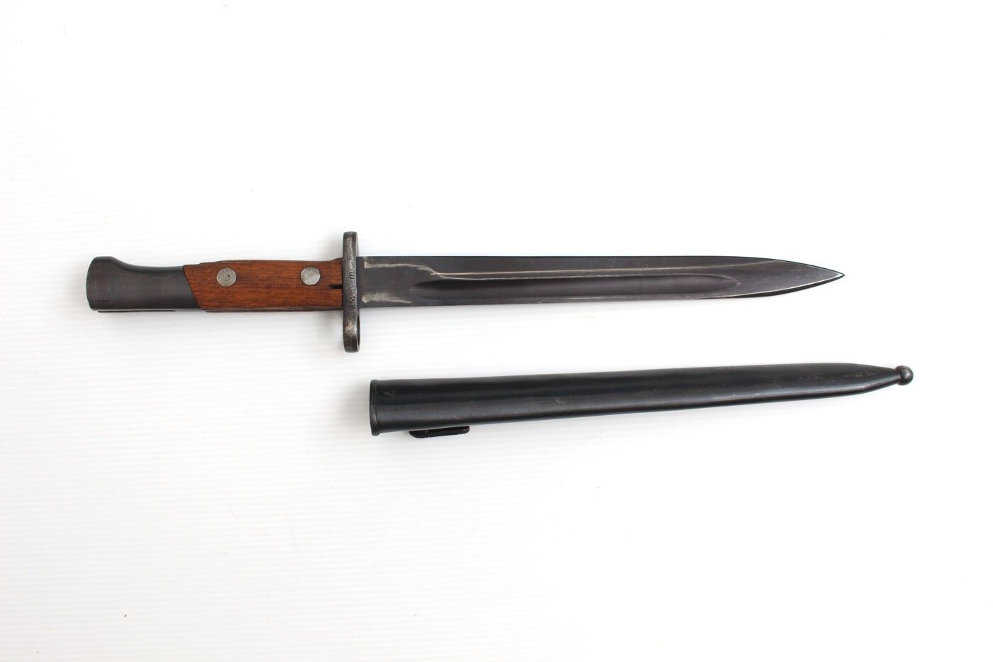 Serbian bayonet model 1948. Blade marked PREDUZECE 44 in Cyrillic for company 44 of Kragujevac, guard marked 247 2, scabbard with the same number. Total length 40 cm, blade 24.5 cm, good condition.