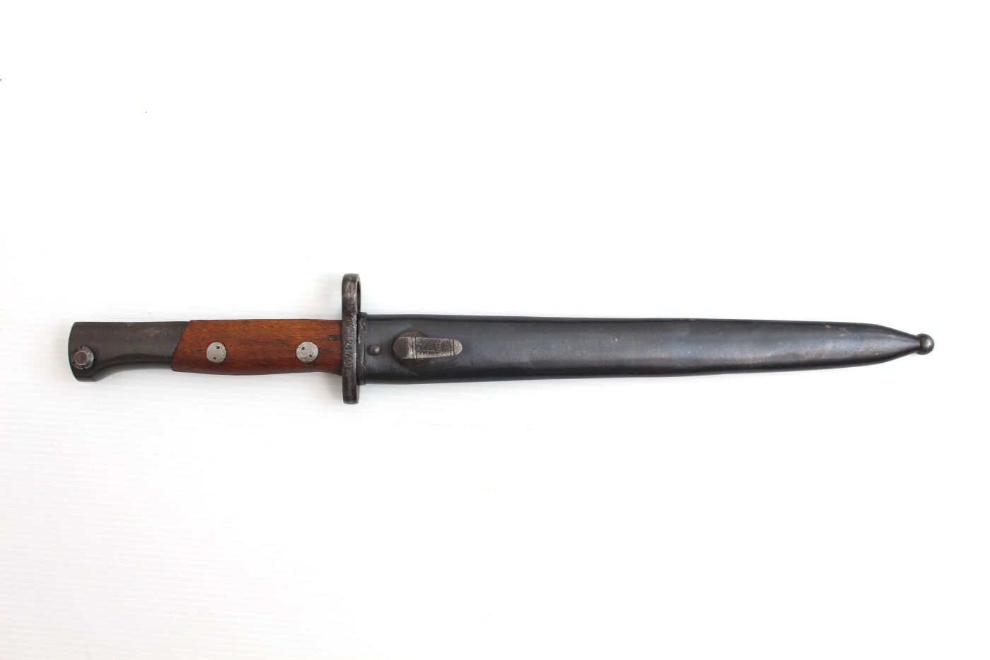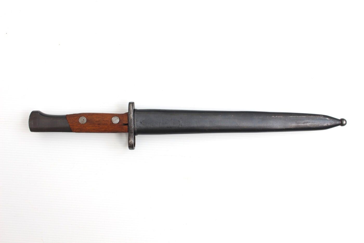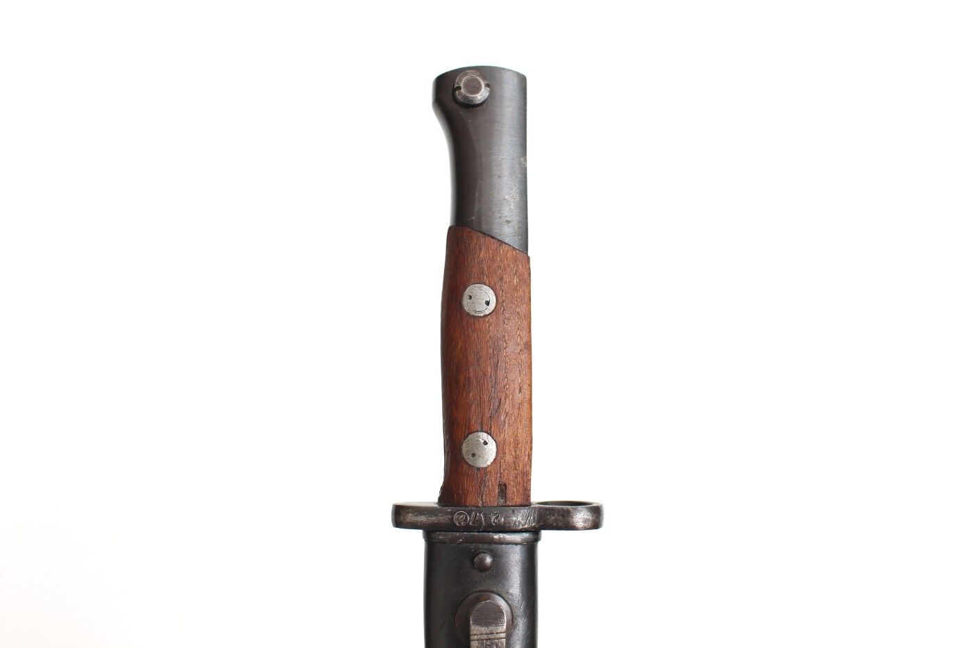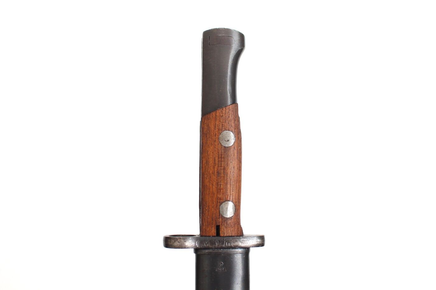 Serbian bayonet model 1948. Blade marked PREDUZECE 44 in Cyrillic for company 44 of Kragujevac, guard marked 247 2, scabbard with the same number. Total length 40 cm, blade 24.5 cm, good condition.