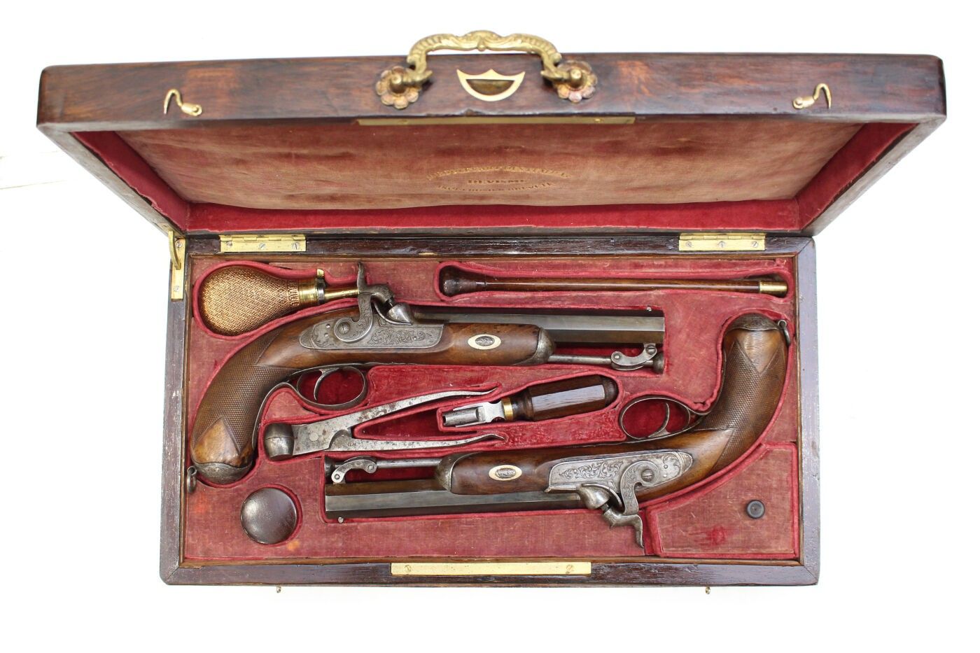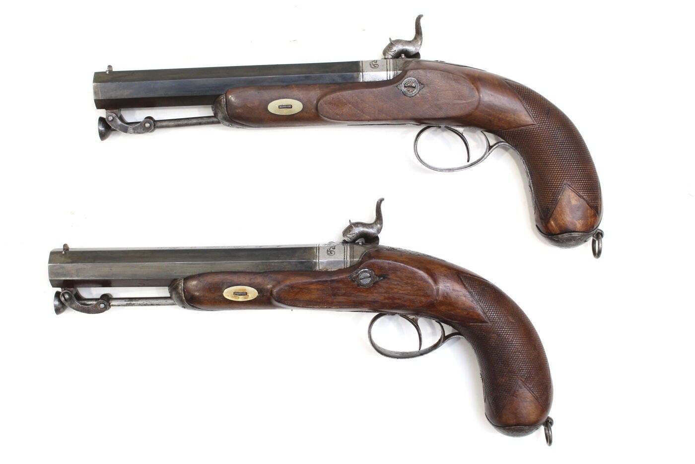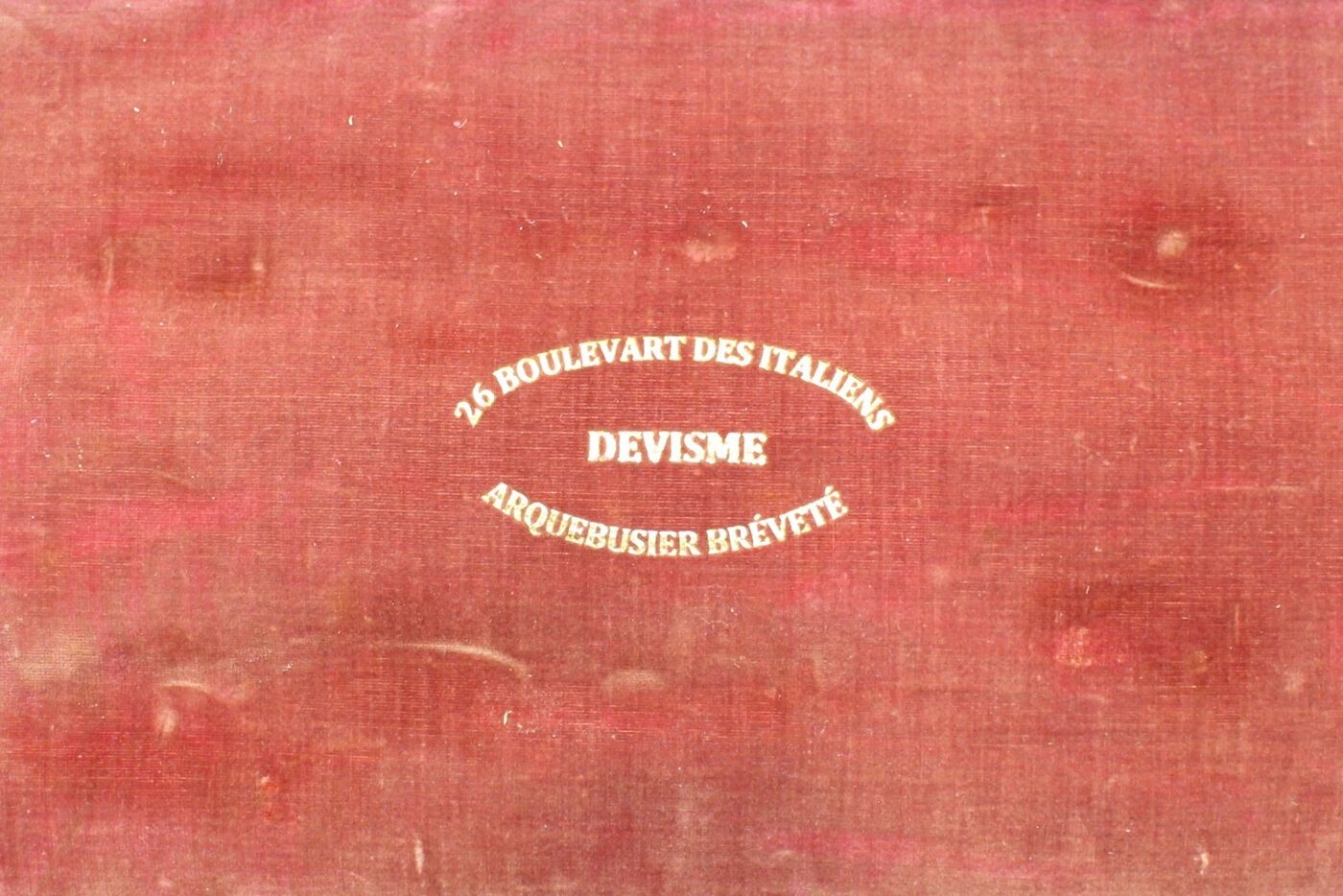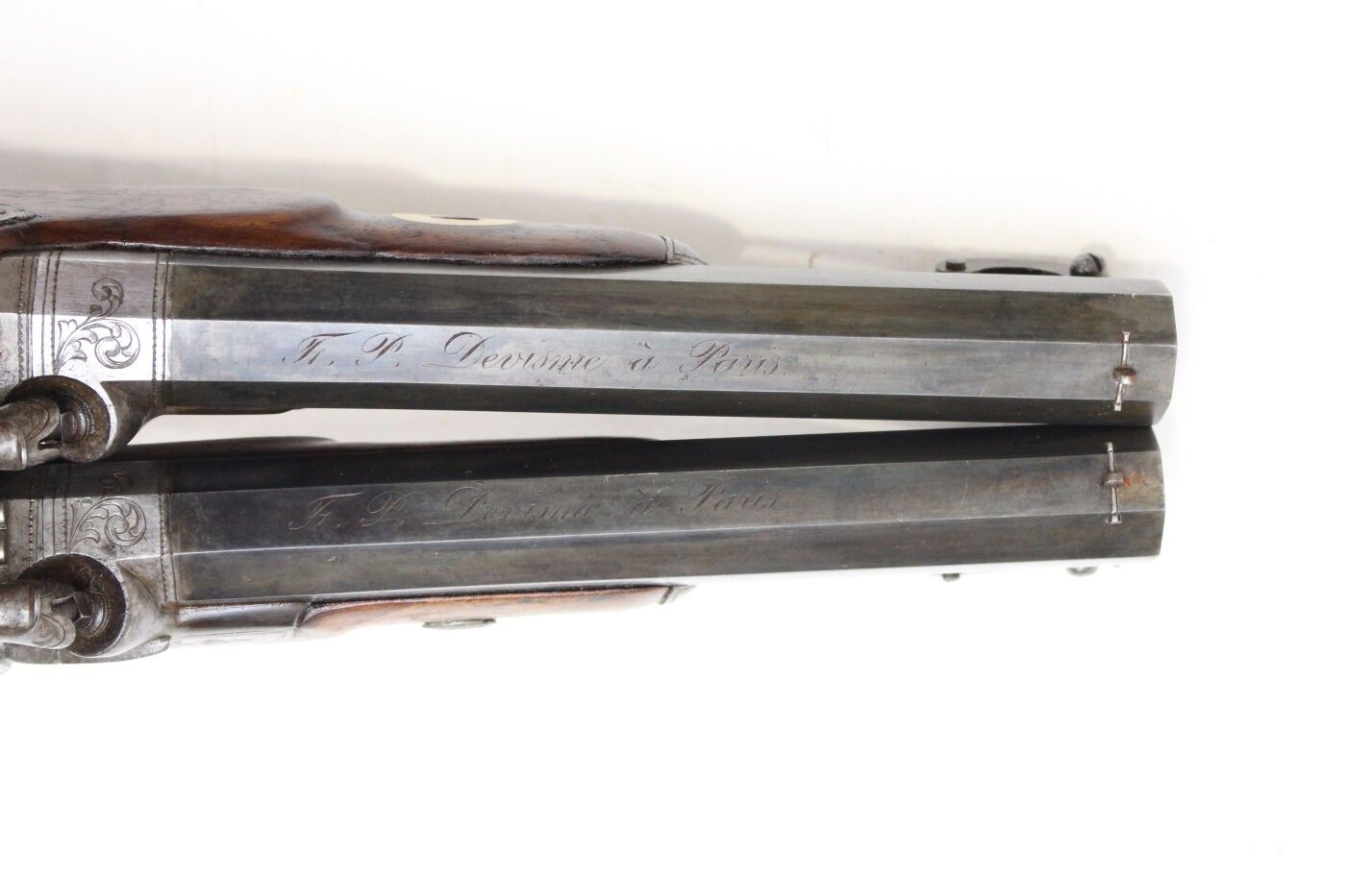 Pair of pistols in box signed Devisme in Paris. Percussion locks, blued octagonal barrels signed F. P. Devisme in Paris, deep rifling, round chequered walnut stocks terminating in a ring, hinged ramrods. The barrels were probably manufactured in Liège. France and Belgium circa 1830-1840. Overall length 34 cm, barrel 19.5 cm, case 46 x 25 cm. Good condition, working mechanisms, in a box complete with accessories, scarlet velvet finish, marked Devisme, 26 Boulevart des Italiens, Arquebusier Bréveté, with this particular spelling.