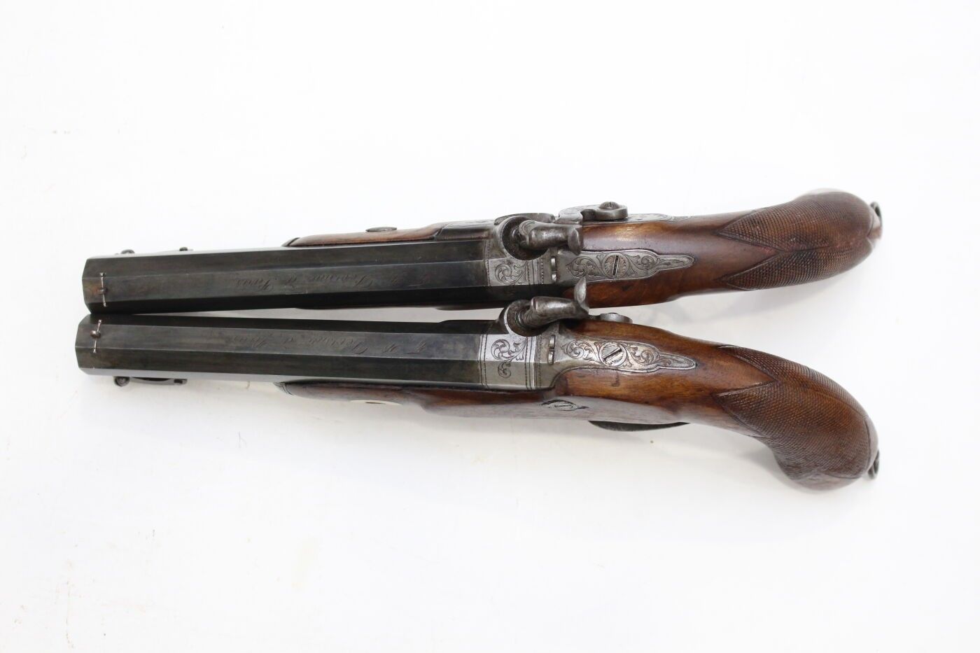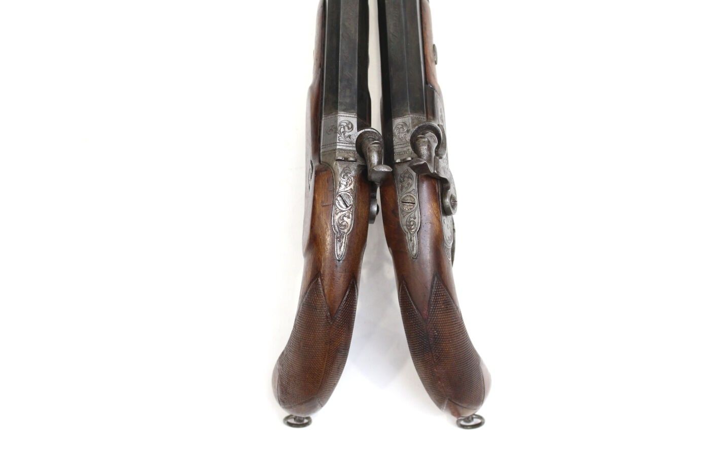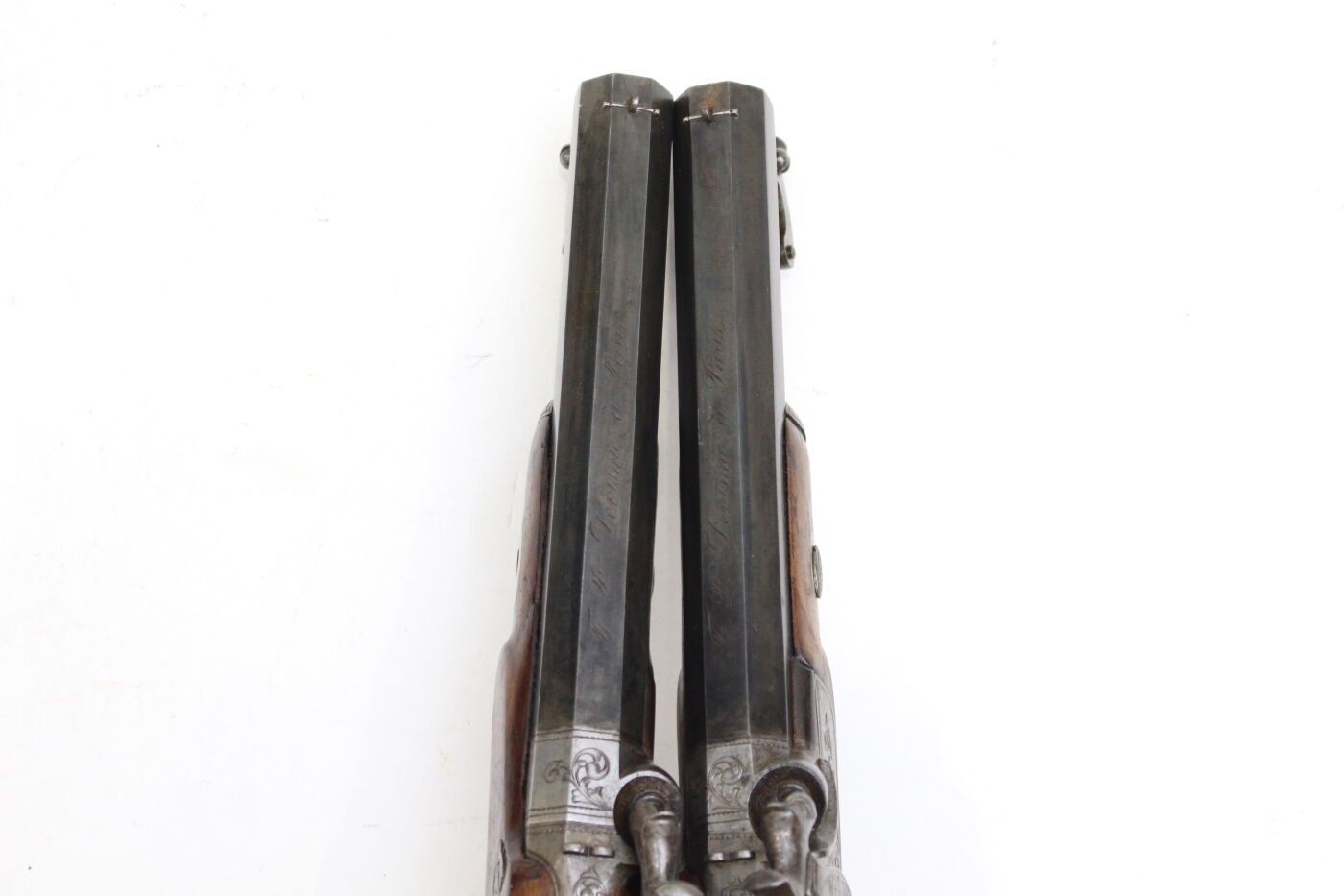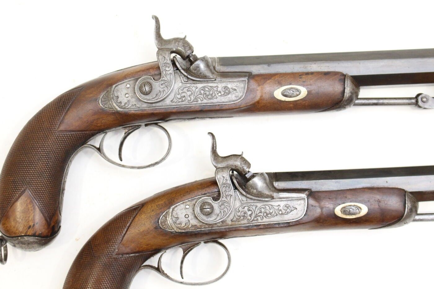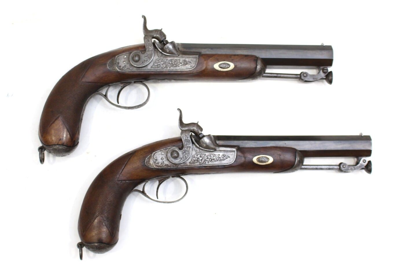 Pair of pistols in box signed Devisme in Paris. Percussion locks, blued octagonal barrels signed F. P. Devisme in Paris, deep rifling, round chequered walnut stocks terminating in a ring, hinged ramrods. The barrels were probably manufactured in Liège. France and Belgium circa 1830-1840. Overall length 34 cm, barrel 19.5 cm, case 46 x 25 cm. Good condition, working mechanisms, in a box complete with accessories, scarlet velvet finish, marked Devisme, 26 Boulevart des Italiens, Arquebusier Bréveté, with this particular spelling.