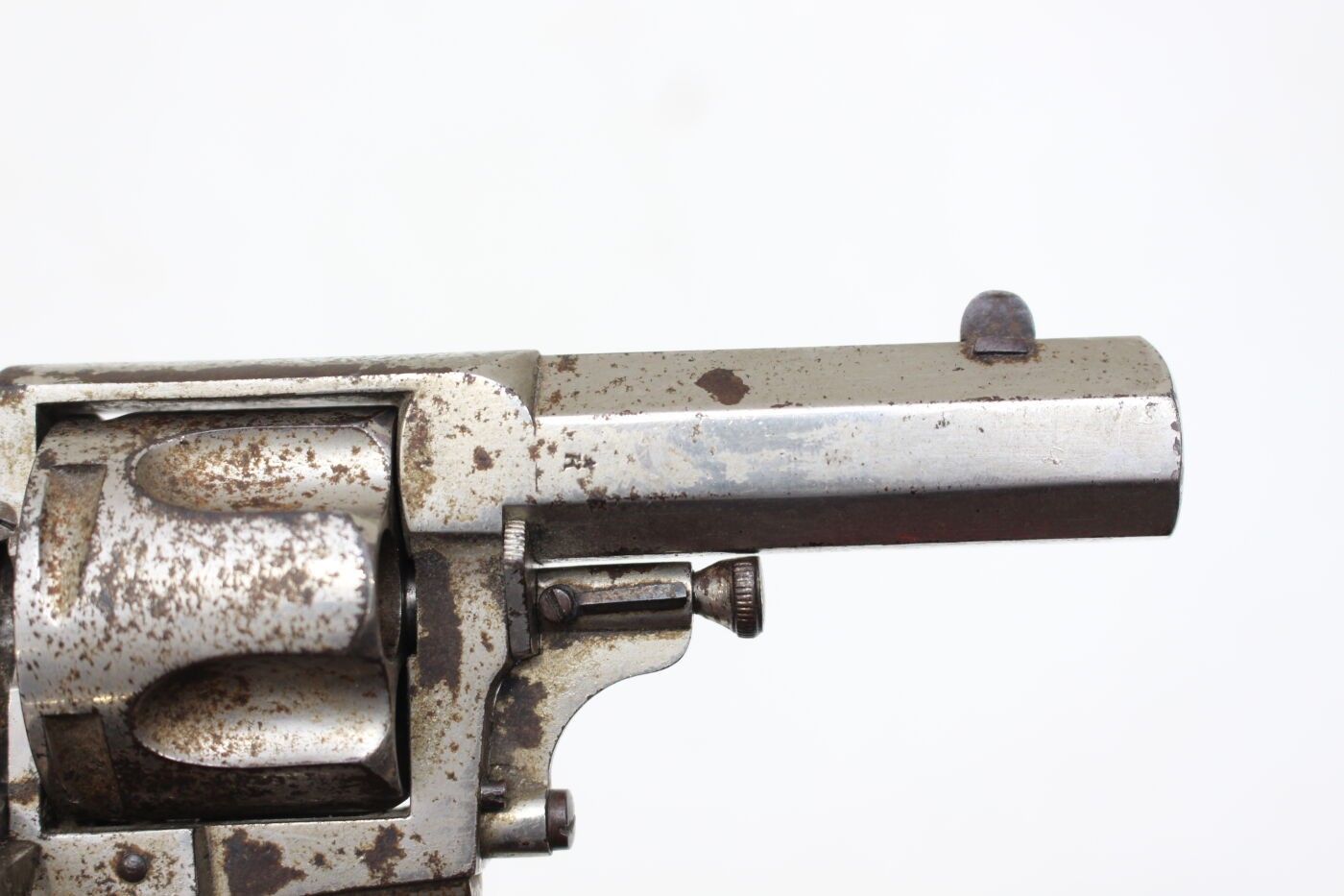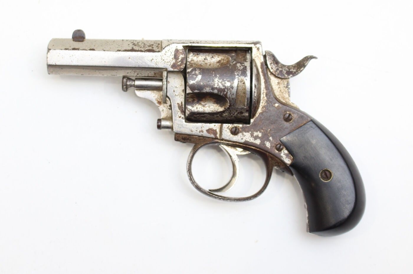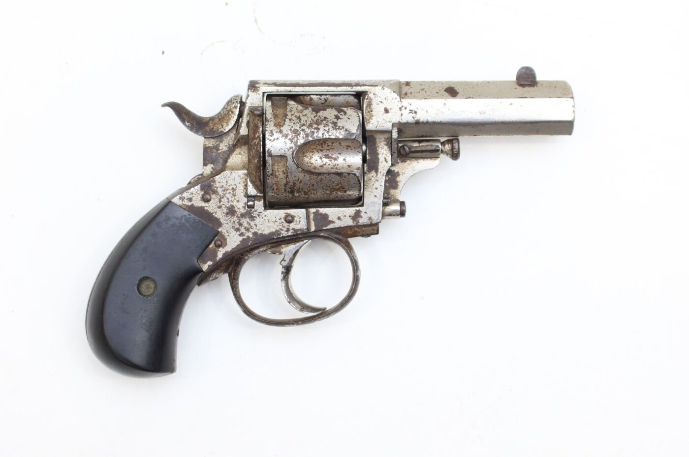 Bulldog type revolver, Belgium, late 19th or early 20th century. 5-shot cylinder, marked ELG for the manufacture of Liege and K spangled, octagonal barrel marked K spangled, damaged nickel plating, oxidation. Overall length 19 cm, barrel 7 cm, muzzle diameter 11 mm. Average condition, working mechanism.