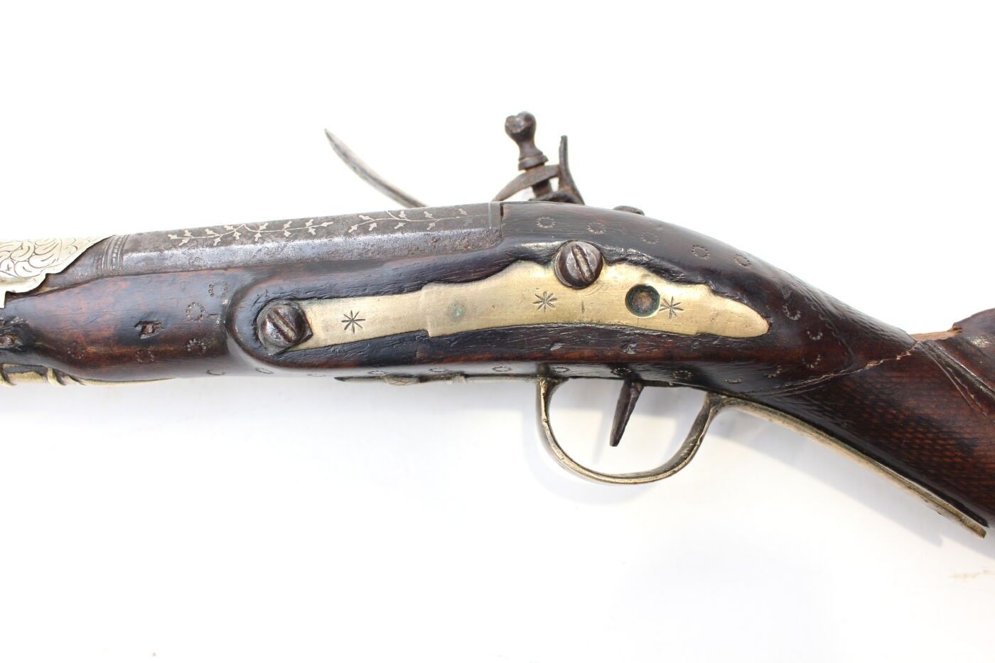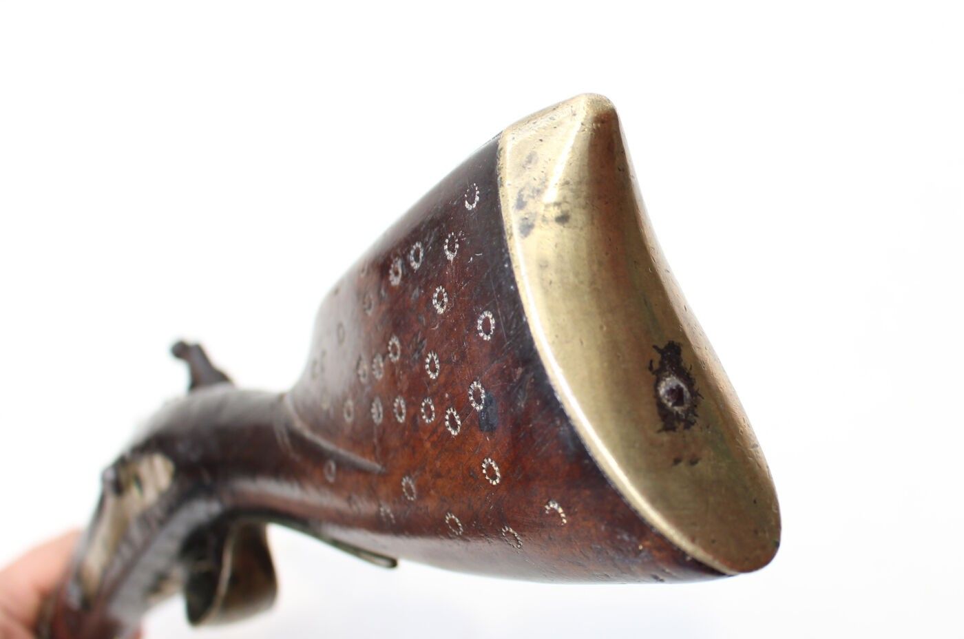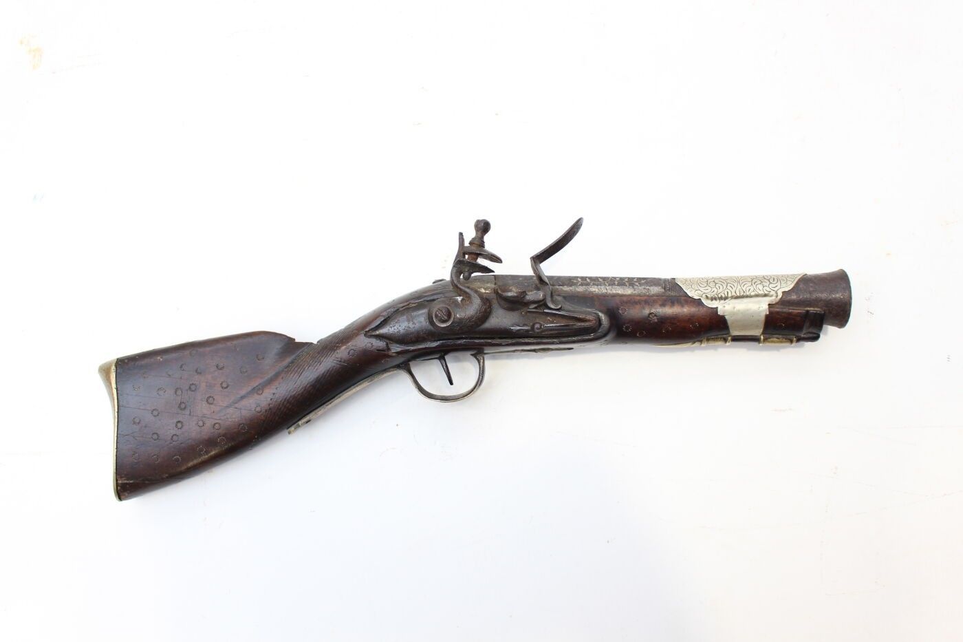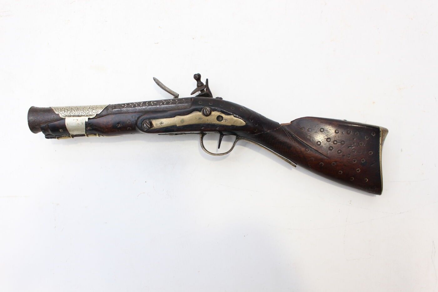 Tromblon, Spain for the Orient, 18th-19th century. Flintlock lock, silver inlaid barrel marked LLO TOR REN for Llorens Torrens, active in Spain from 1790 to 1806. 42 cm, barrel 19 cm. Fair condition, trigger guard screw missing, broken stock repaired, mechanism not functional.