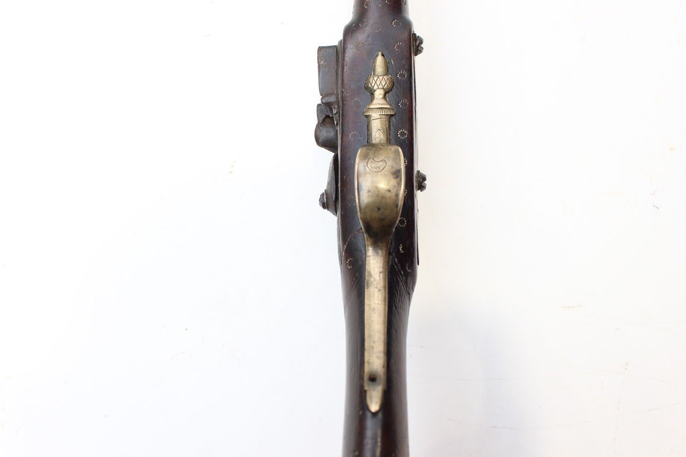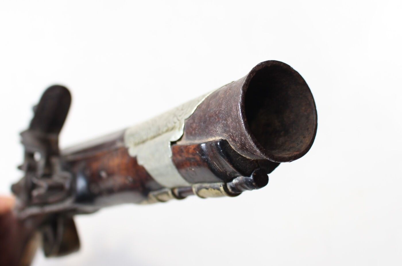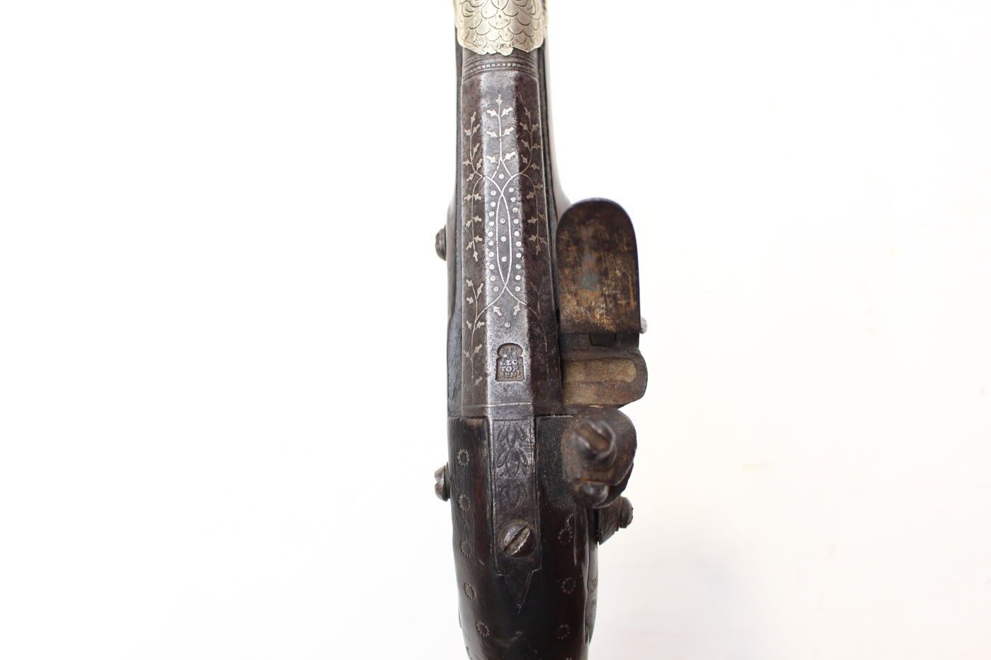 Tromblon, Spain for the Orient, 18th-19th century. Flintlock lock, silver inlaid barrel marked LLO TOR REN for Llorens Torrens, active in Spain from 1790 to 1806. 42 cm, barrel 19 cm. Fair condition, trigger guard screw missing, broken stock repaired, mechanism not functional.
