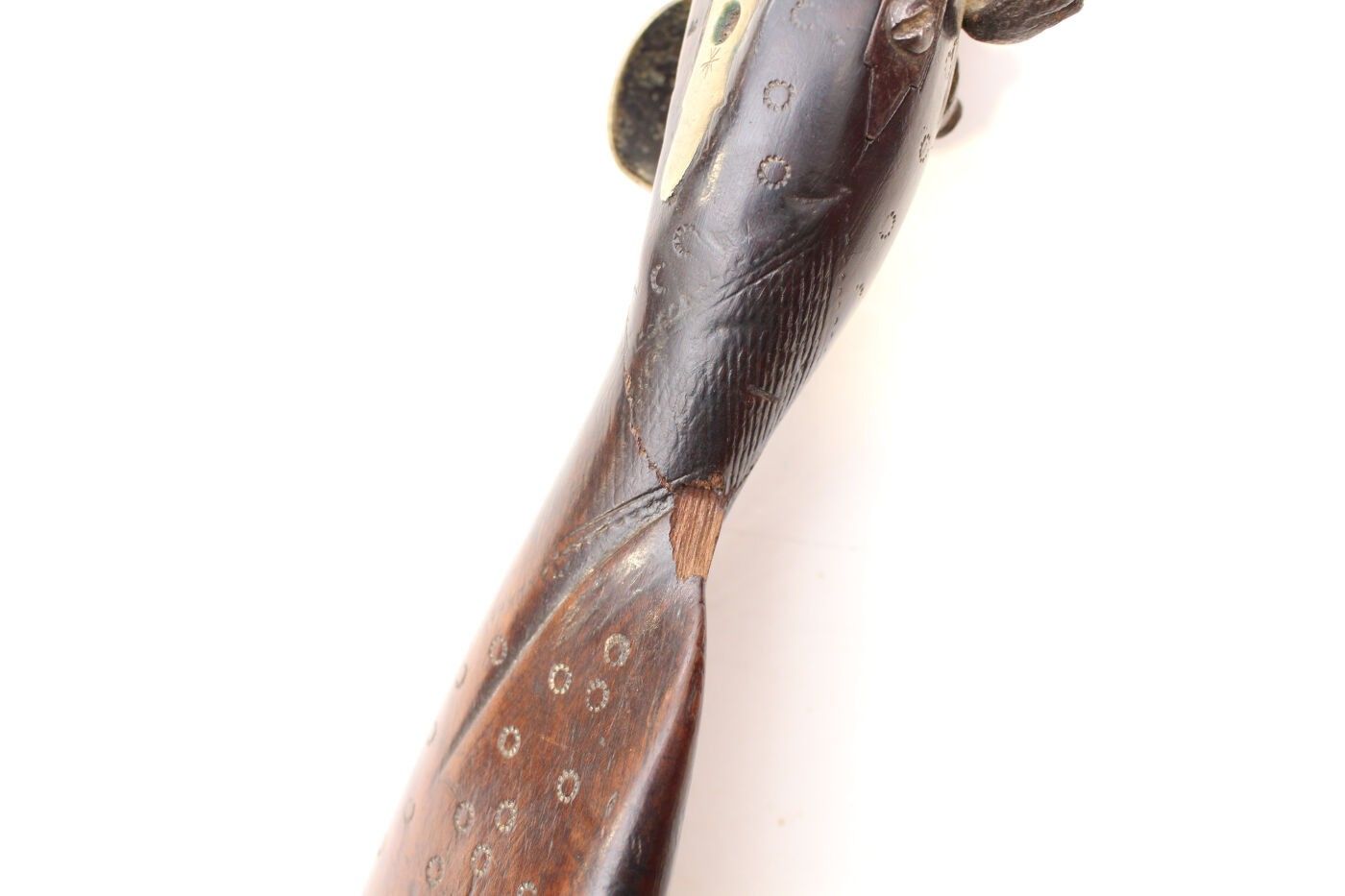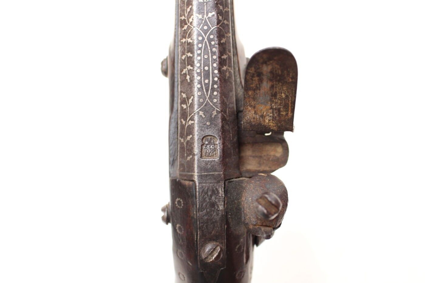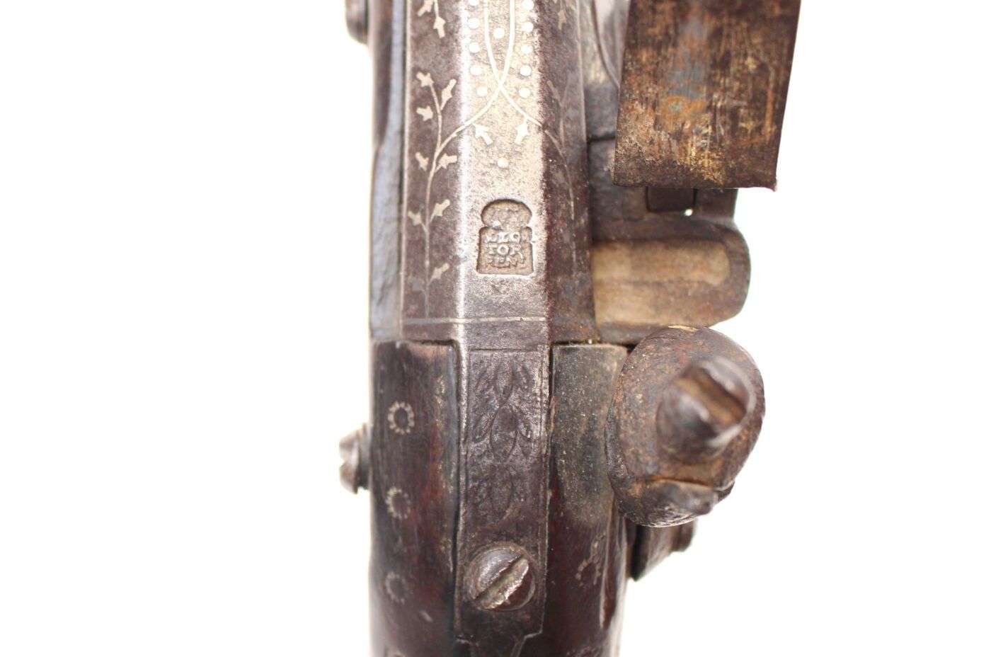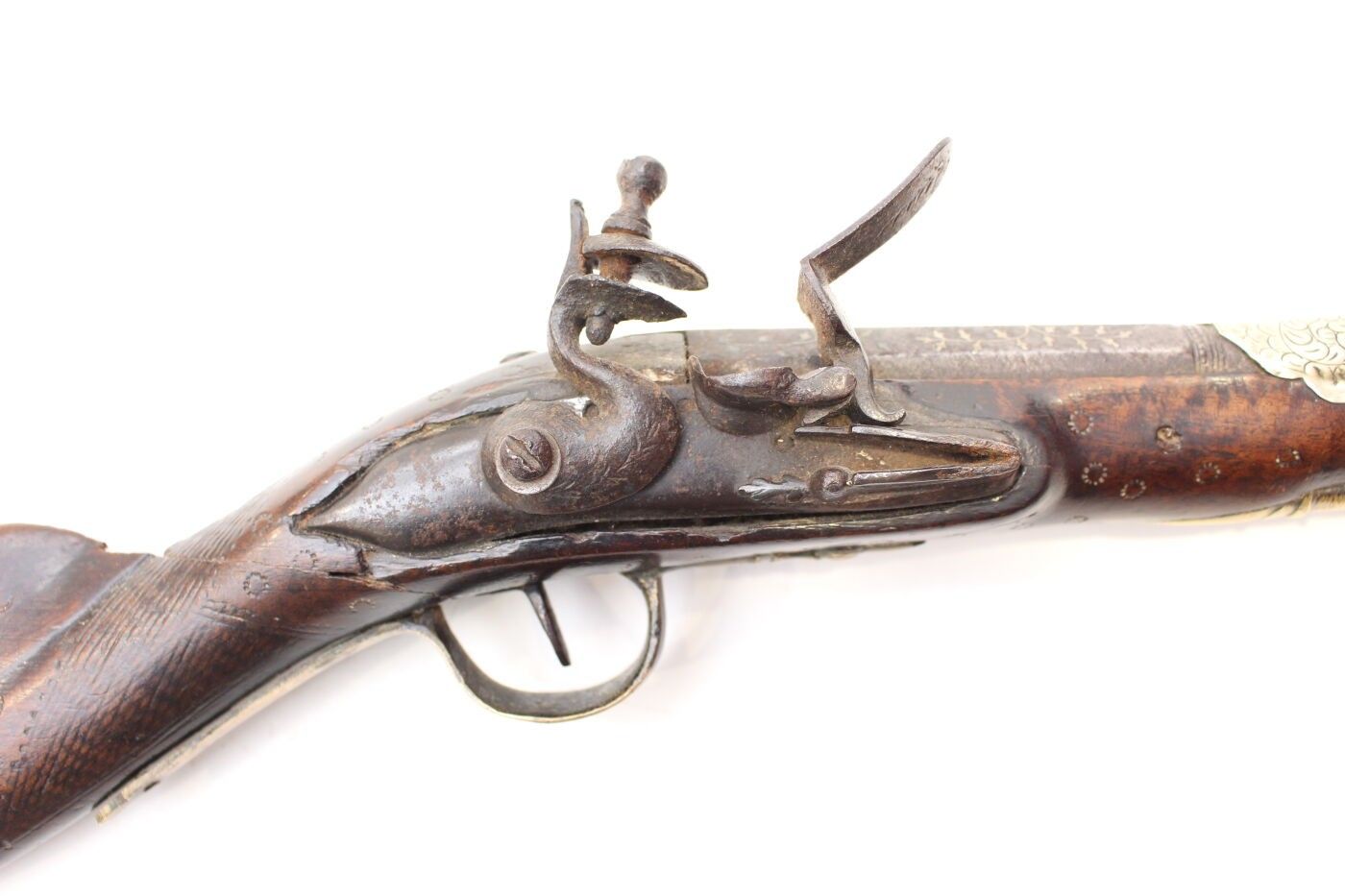 Tromblon, Spain for the Orient, 18th-19th century. Flintlock lock, silver inlaid barrel marked LLO TOR REN for Llorens Torrens, active in Spain from 1790 to 1806. 42 cm, barrel 19 cm. Fair condition, trigger guard screw missing, broken stock repaired, mechanism not functional.