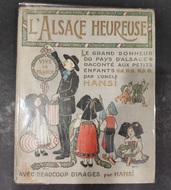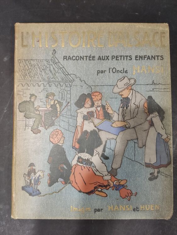 -HANSI "L'histoire d'Alsace", pictures by Hansi and Huen, H. Floury, publisher, 1912, folio, percaline binding, 99 pages (+1), illustrations. Freckles, title page at the end almost flying, tear junction title page / front cover, tear title page, a few red stains in the bottom margin of the first pages, stabilo on the 4th cover, corners and headpieces worn, spine damaged and unstained.