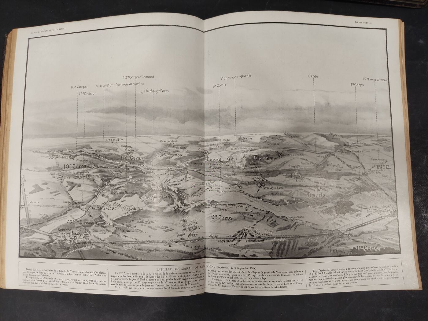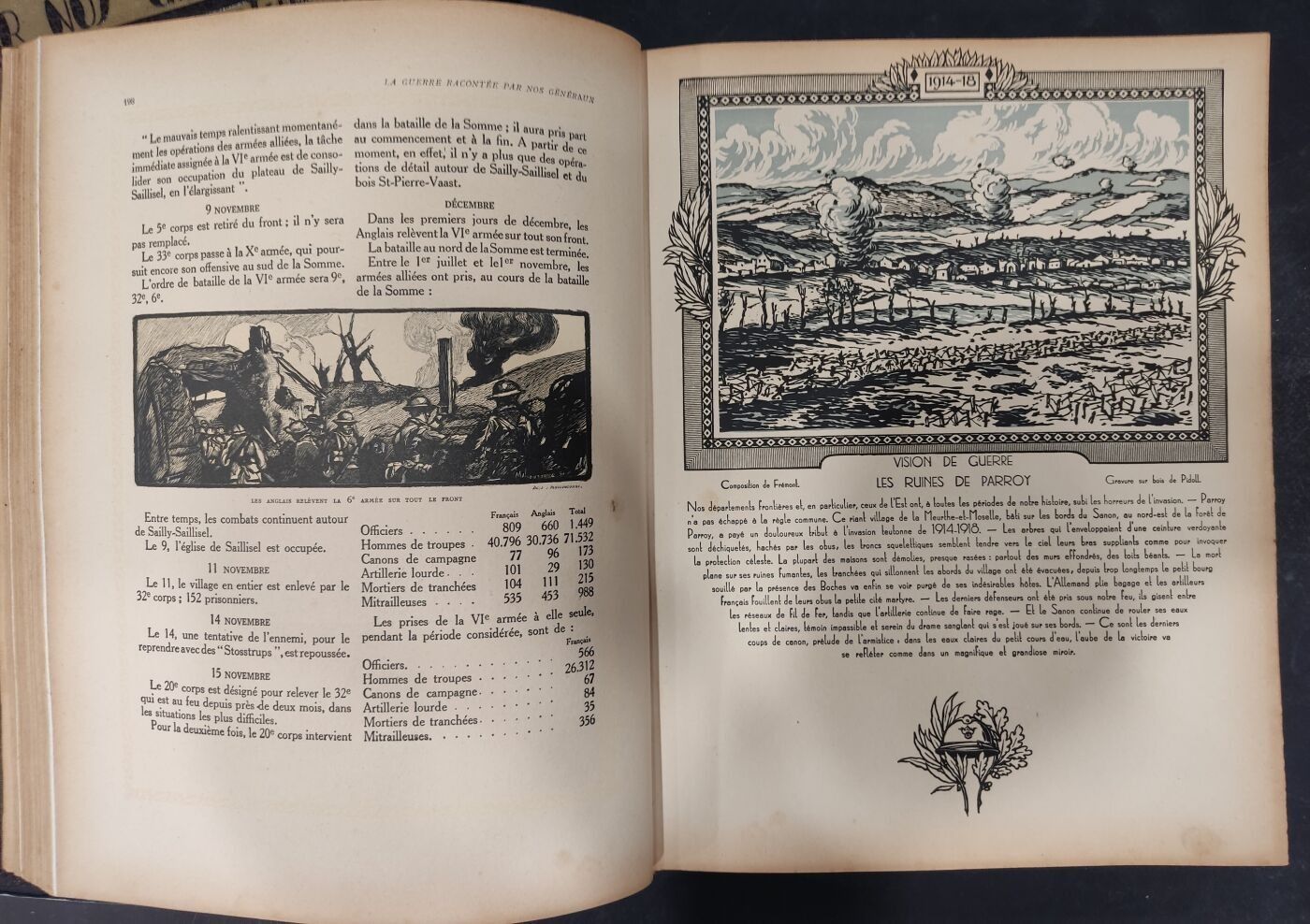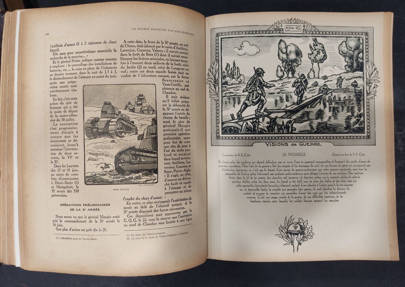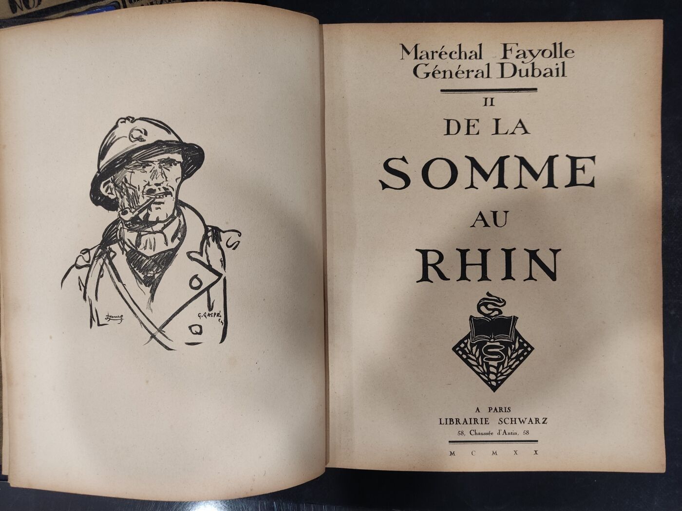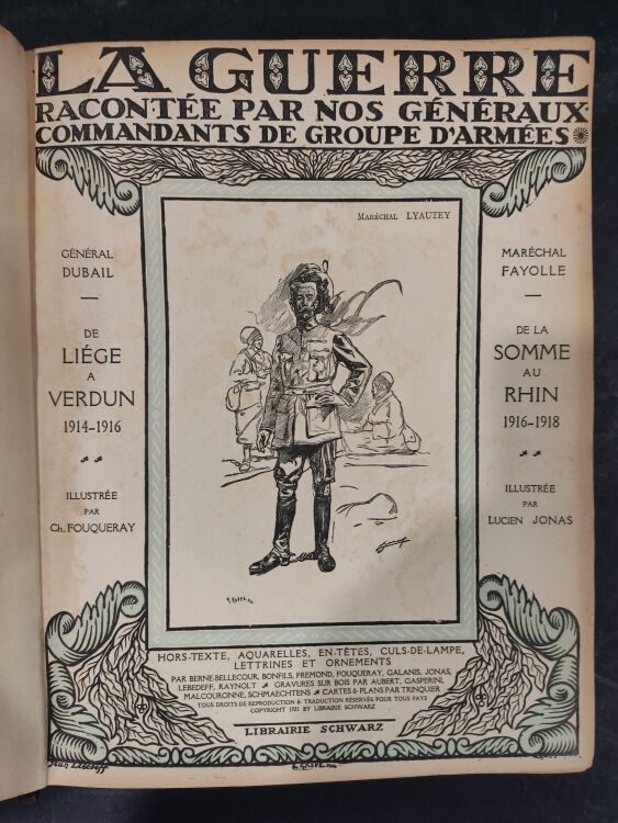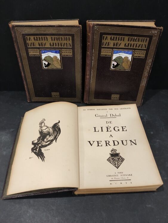 Maréchal FOYOLLE, General DUBAIL "La guerre racontée par nos généraux", in Paris, Librairie Schwarz, 1920, 3 volumes, folio, bound. Each volume has a metal plate decorated with a soldier on the front cover. Roughly bound, spotting, foxing, wear from use, some inscriptions in pencil.