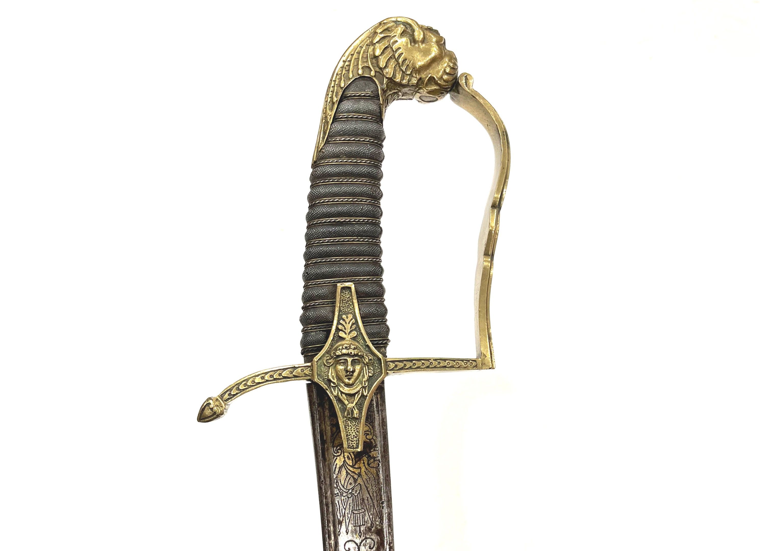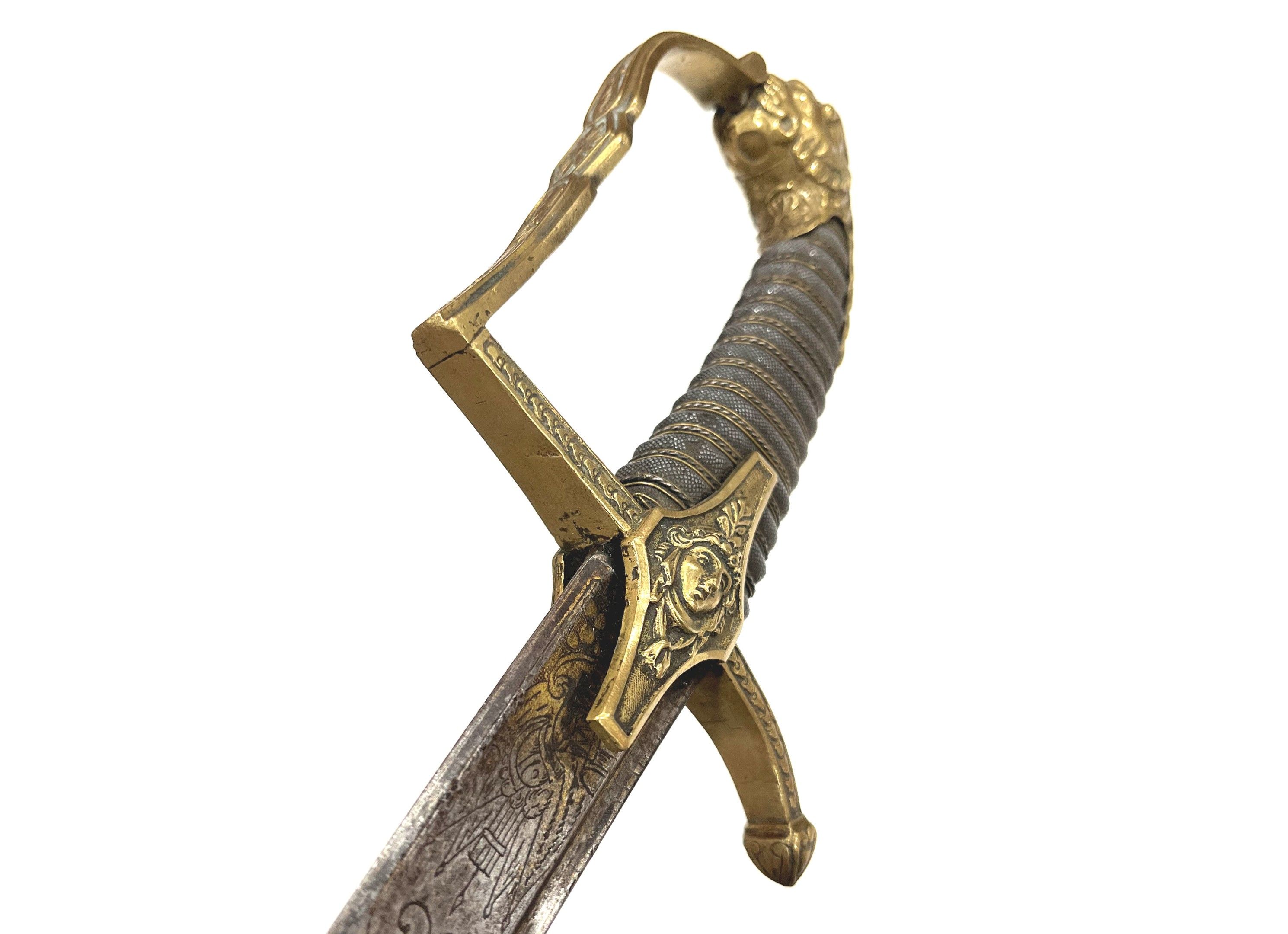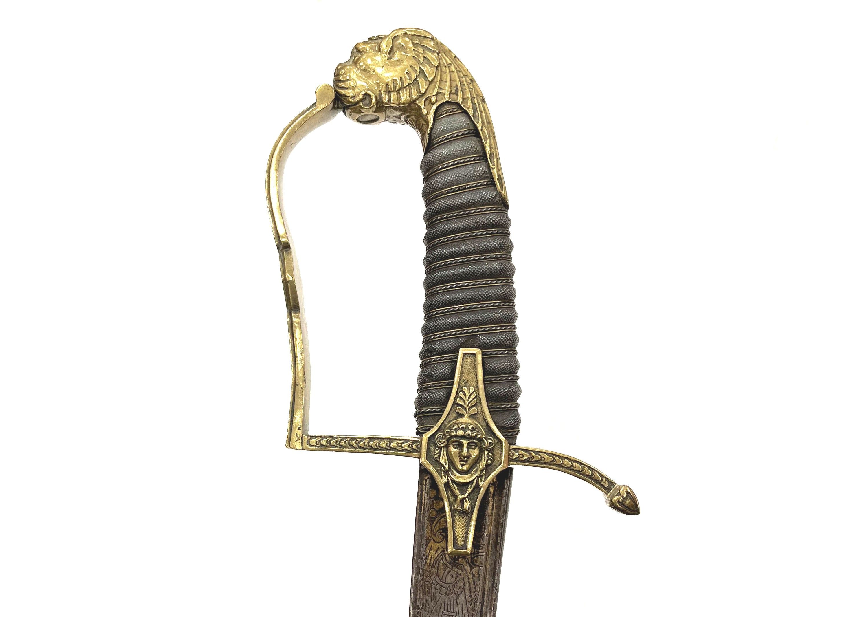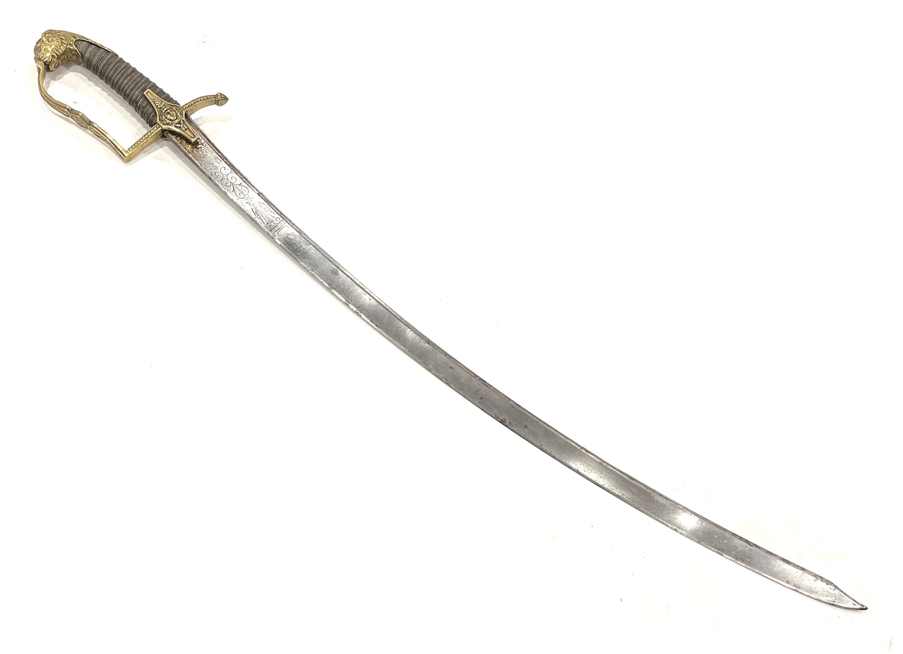 Sabre based on the model of a junior officer of a horse hunter, France, second half of the 19th century. Steel blade engraved on the first quarter with remains of gilding on the forte, unmarked back, short counter-edge. Lion head pommel, chased single branch hilt, antique goddess head pommel, fuse covered in filigree shagreen. Total length 94 cm, blade 79 cm. Good condition, without scabbard, oxidation from use. EXPERT: Sylvain LAMOTTE (006398).