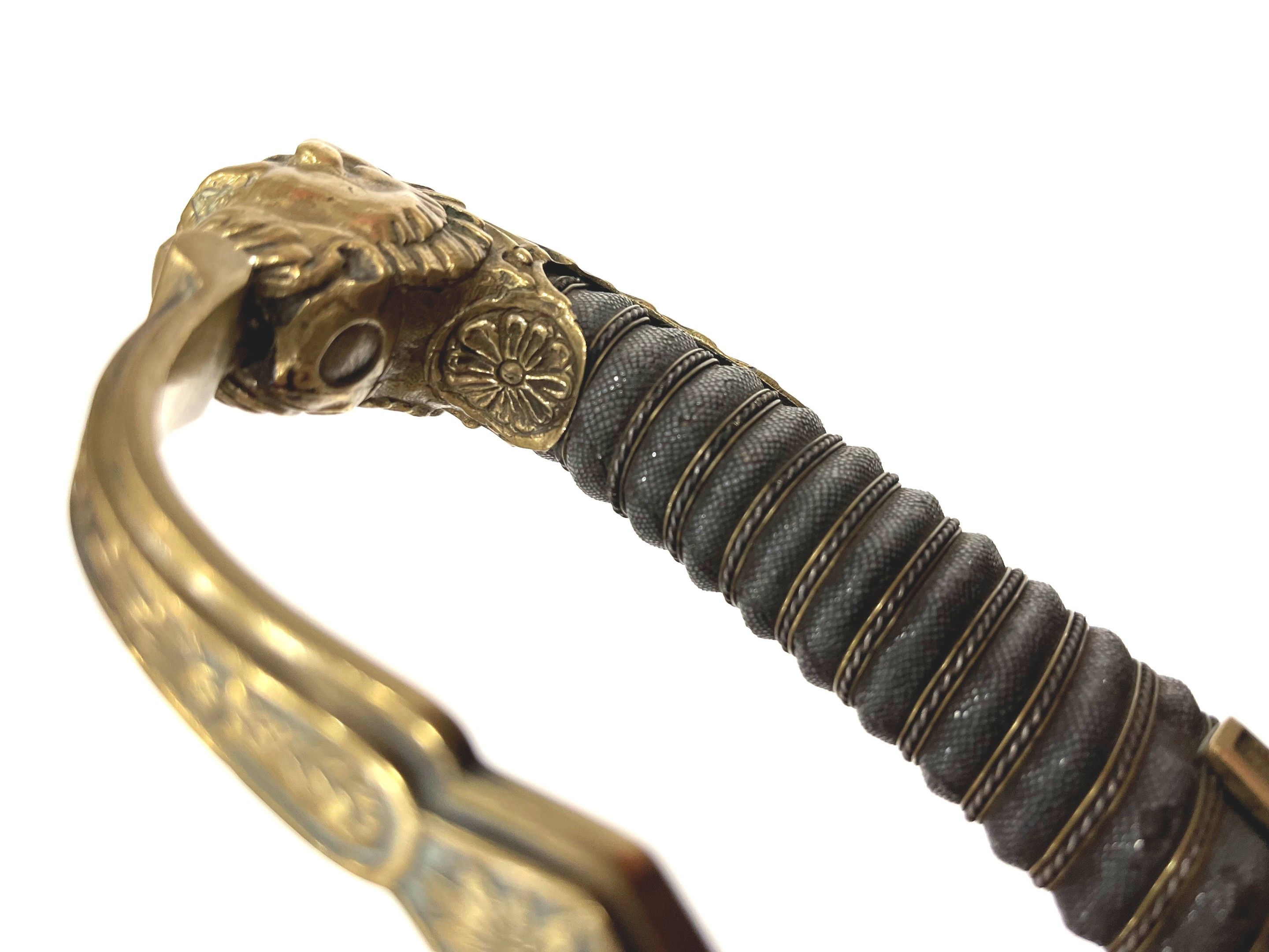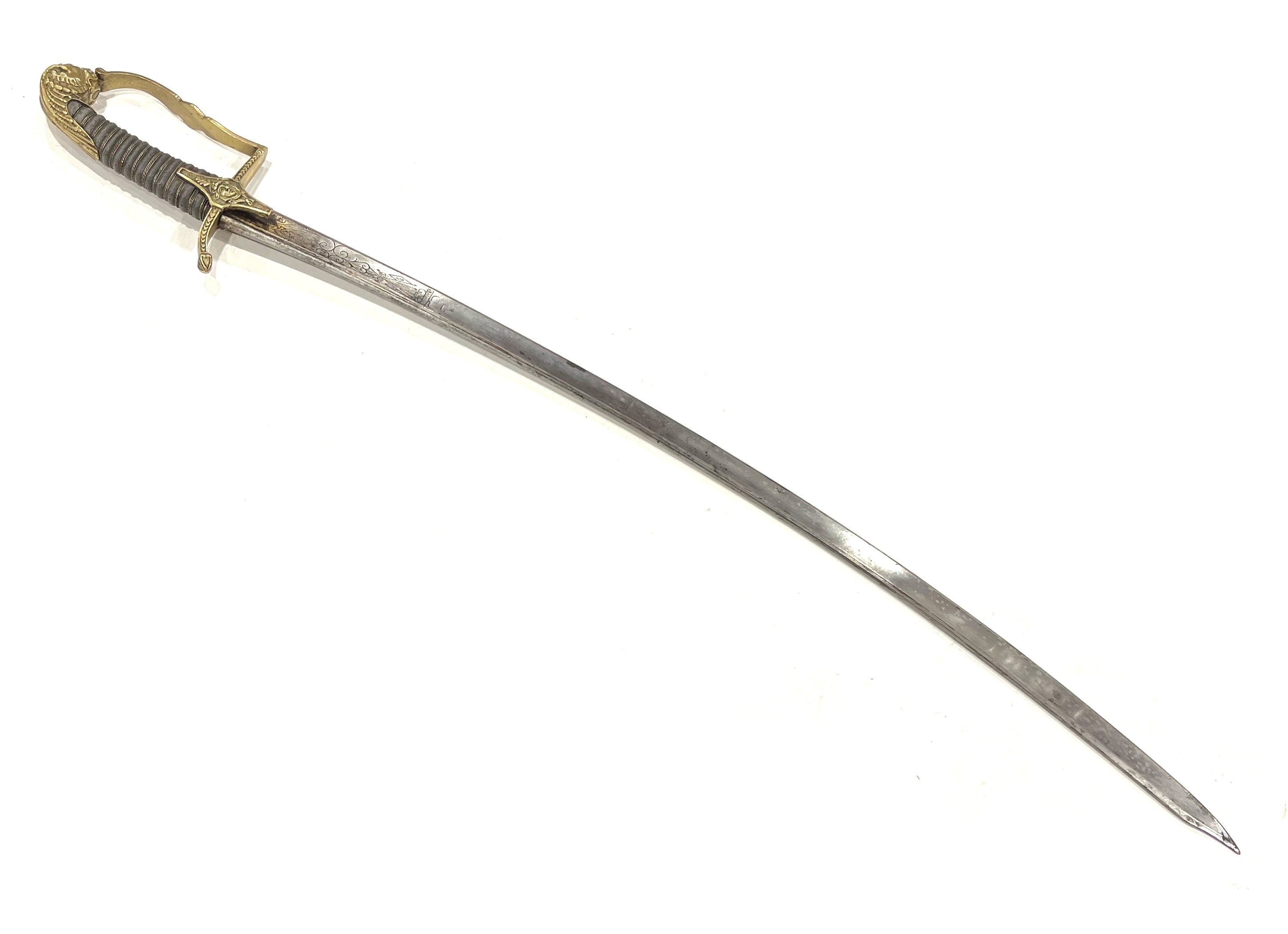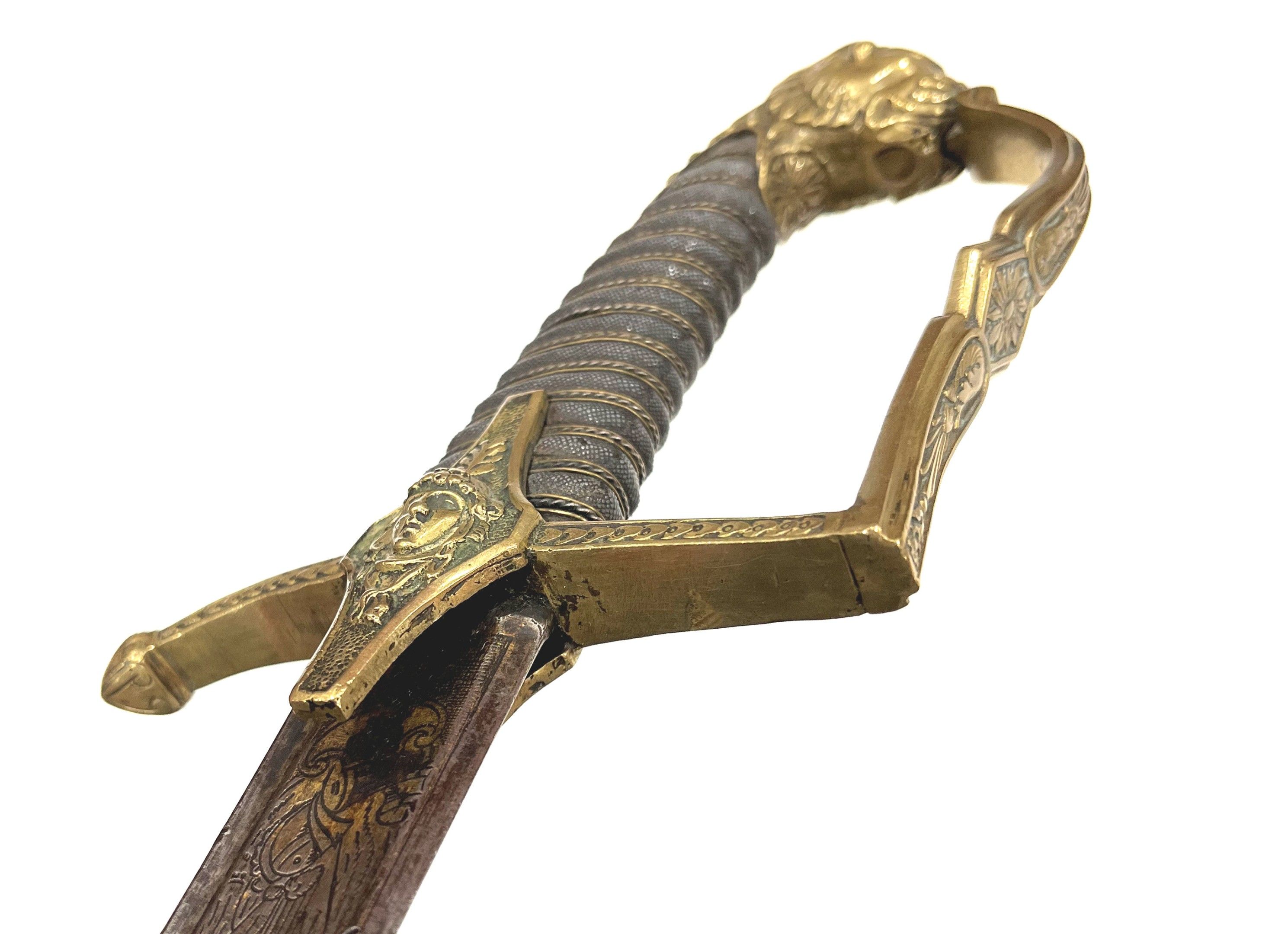 Sabre based on the model of a junior officer of a horse hunter, France, second half of the 19th century. Steel blade engraved on the first quarter with remains of gilding on the forte, unmarked back, short counter-edge. Lion head pommel, chased single branch hilt, antique goddess head pommel, fuse covered in filigree shagreen. Total length 94 cm, blade 79 cm. Good condition, without scabbard, oxidation from use. EXPERT: Sylvain LAMOTTE (006398).