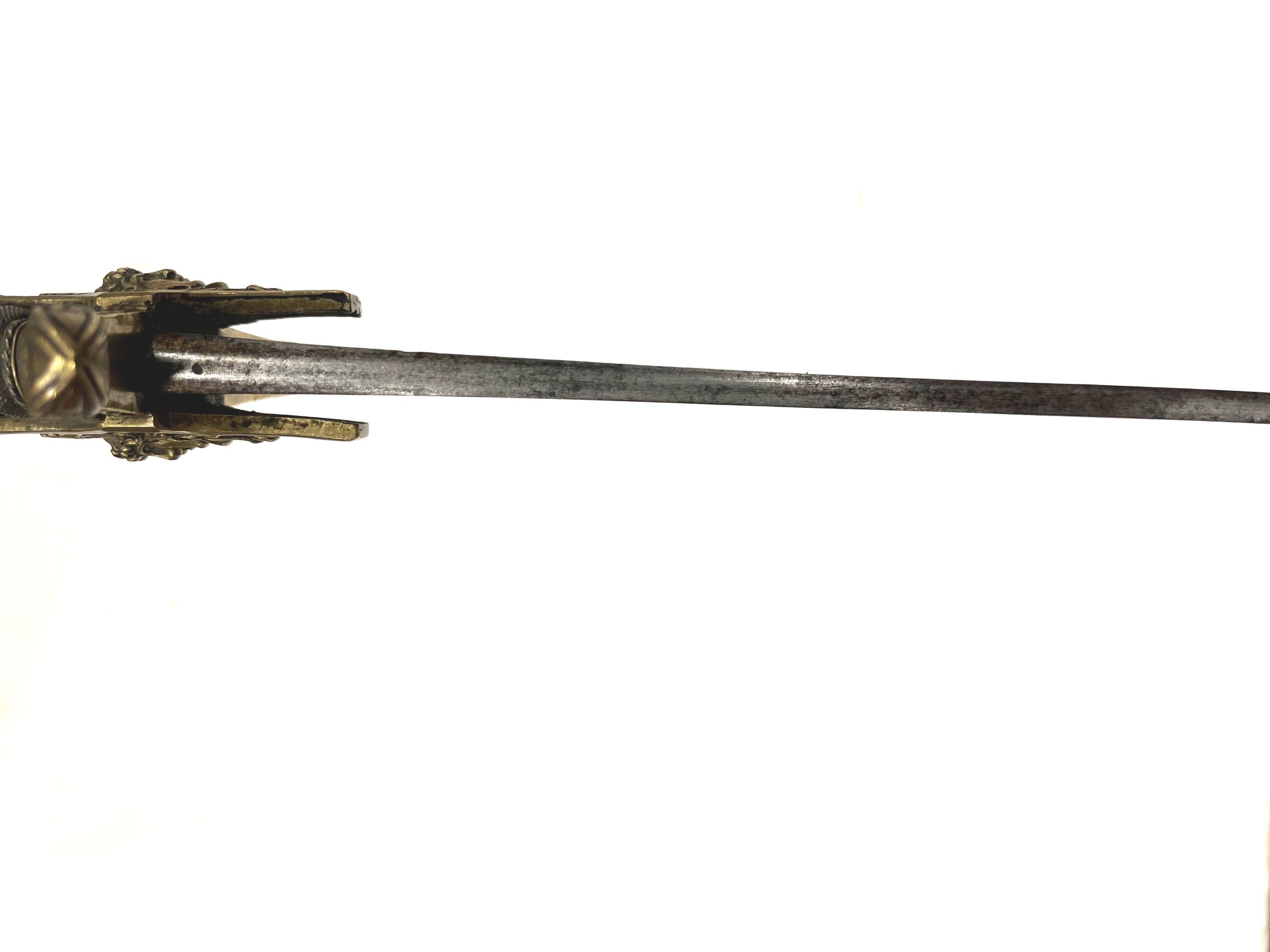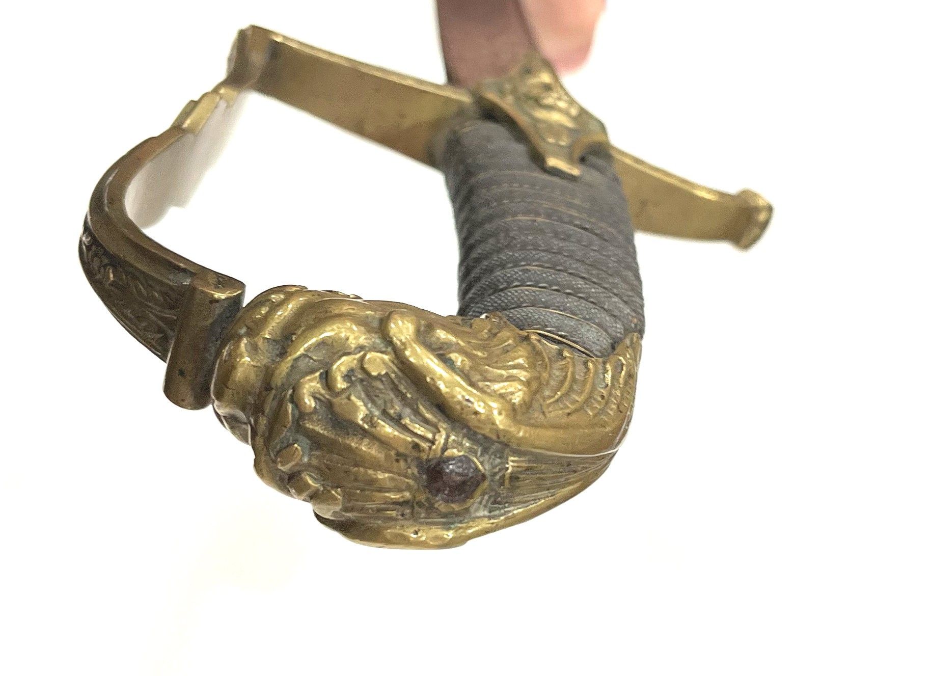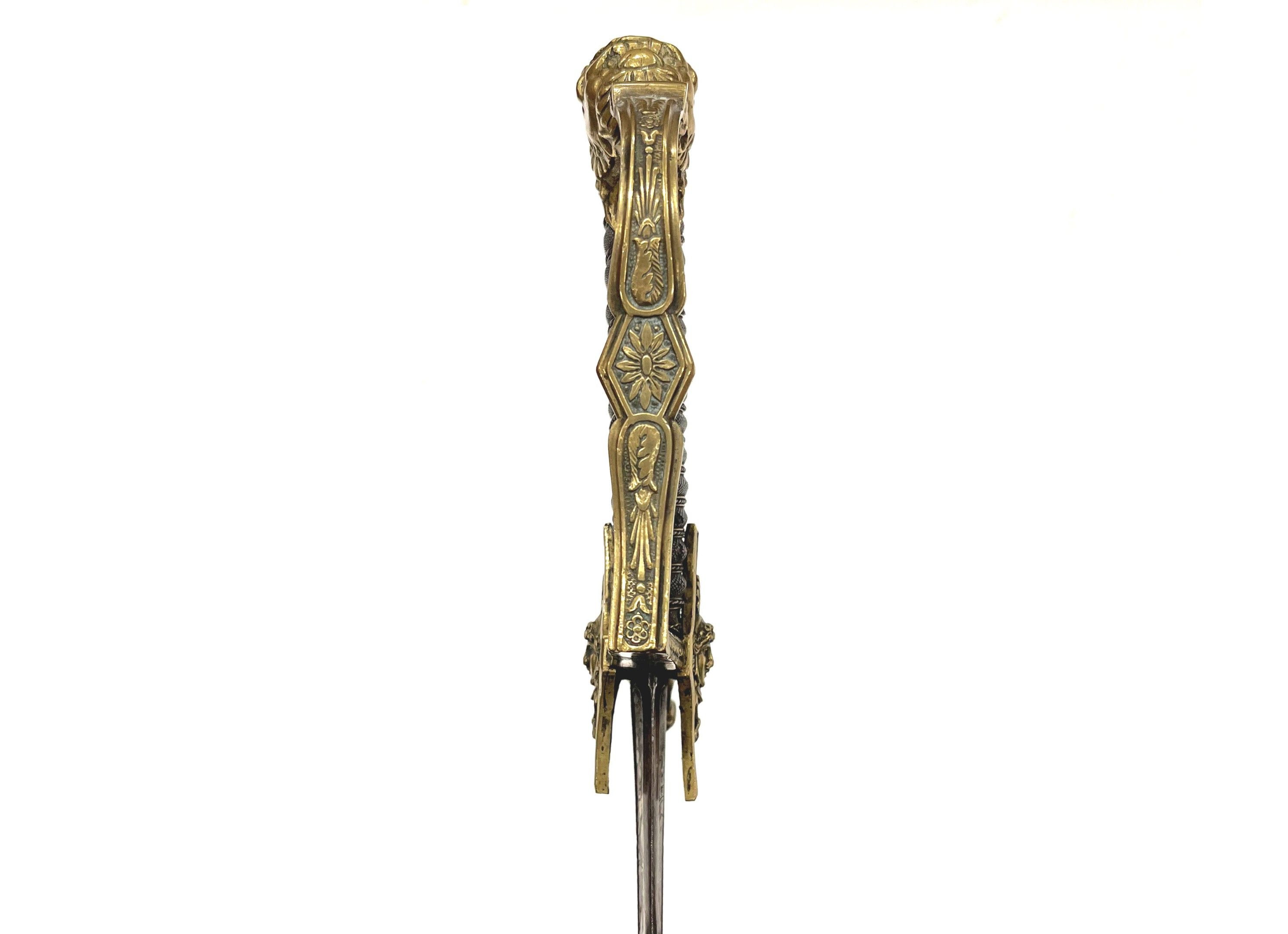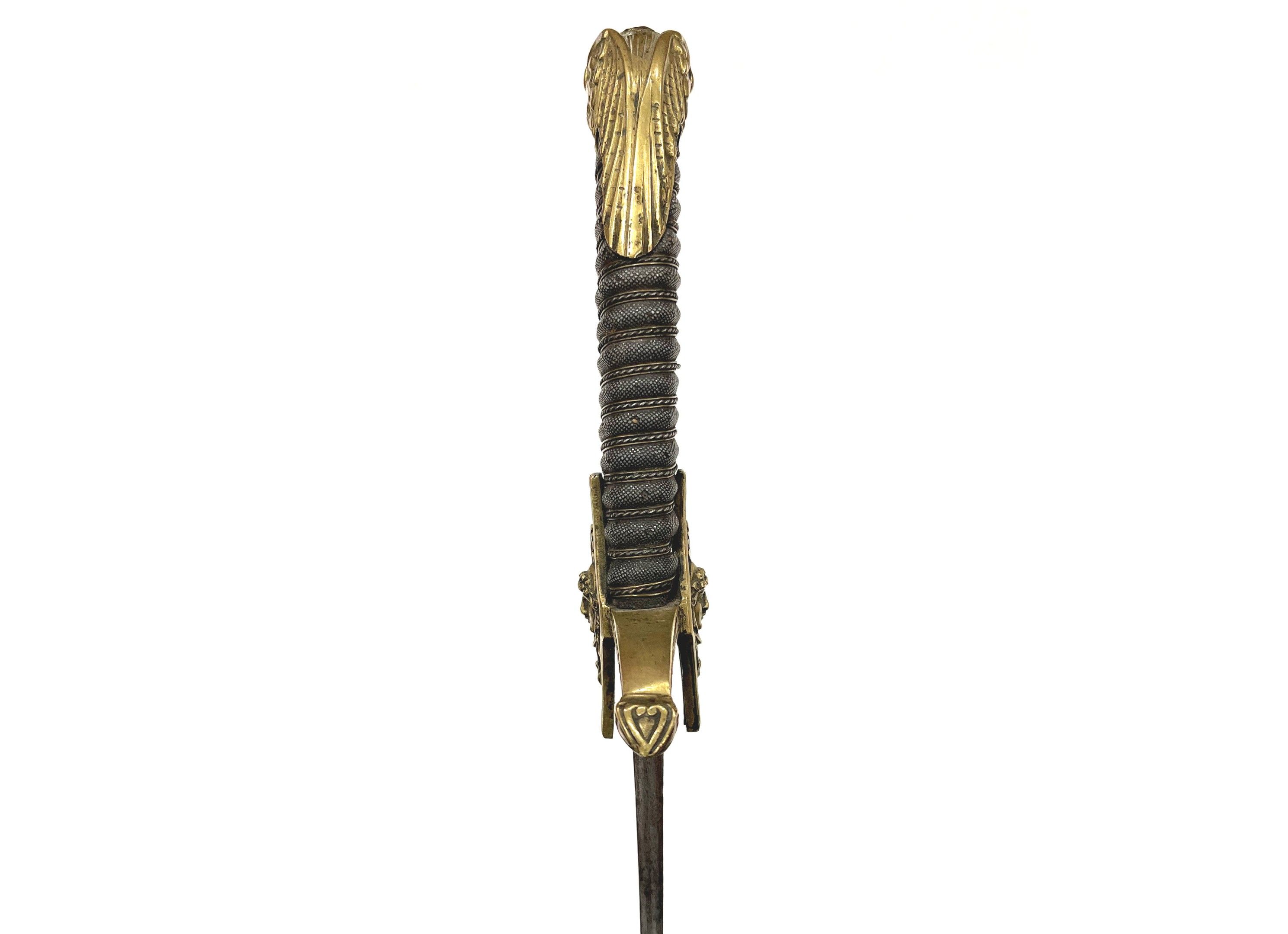 Sabre based on the model of a junior officer of a horse hunter, France, second half of the 19th century. Steel blade engraved on the first quarter with remains of gilding on the forte, unmarked back, short counter-edge. Lion head pommel, chased single branch hilt, antique goddess head pommel, fuse covered in filigree shagreen. Total length 94 cm, blade 79 cm. Good condition, without scabbard, oxidation from use. EXPERT: Sylvain LAMOTTE (006398).