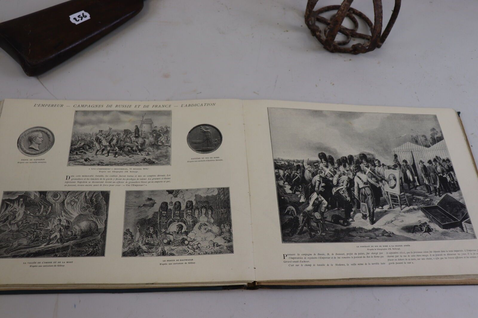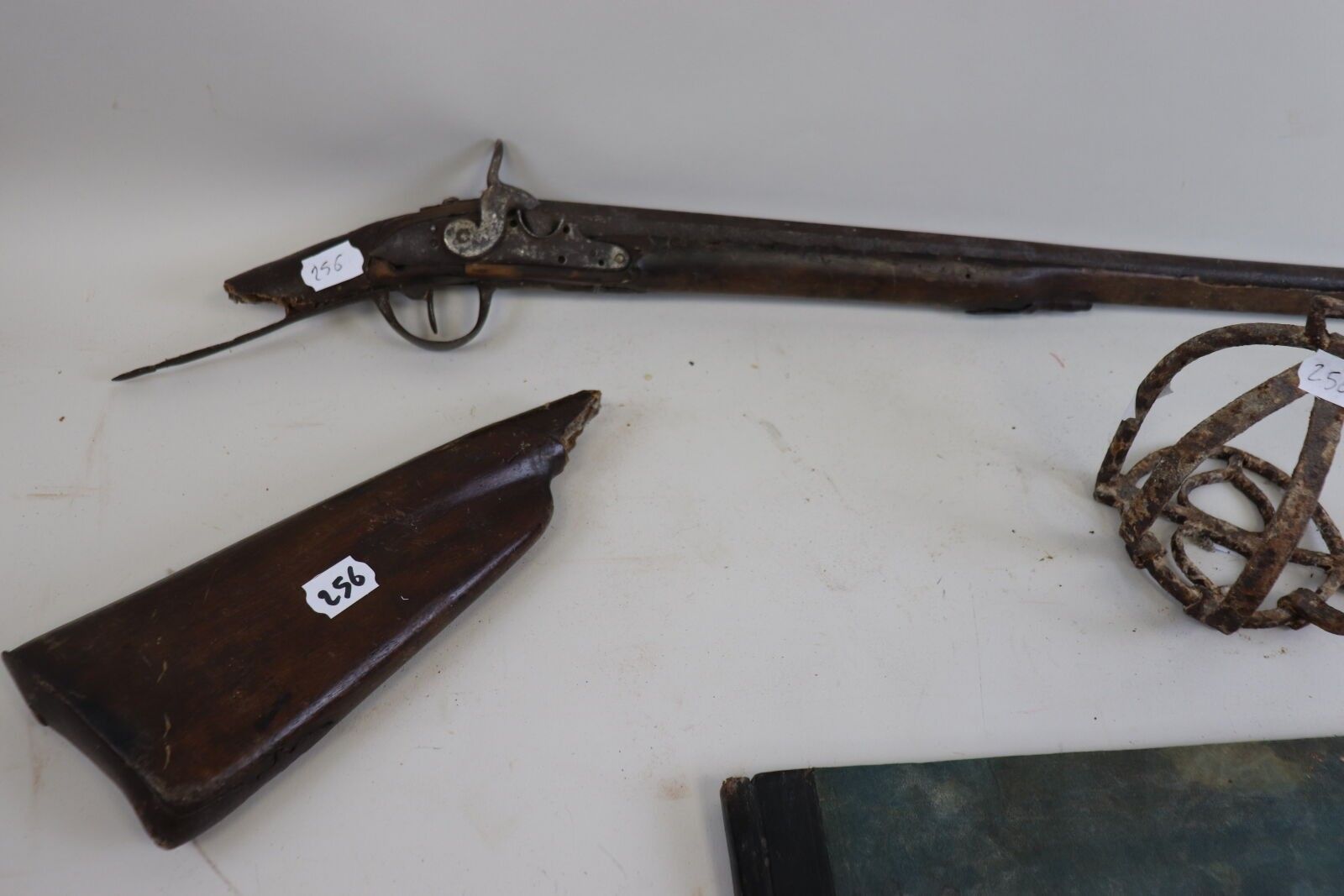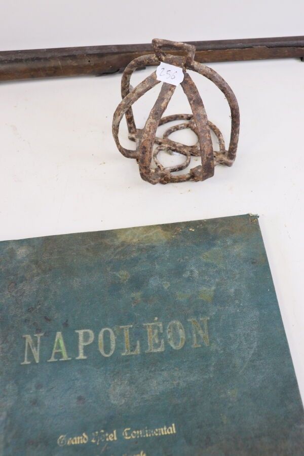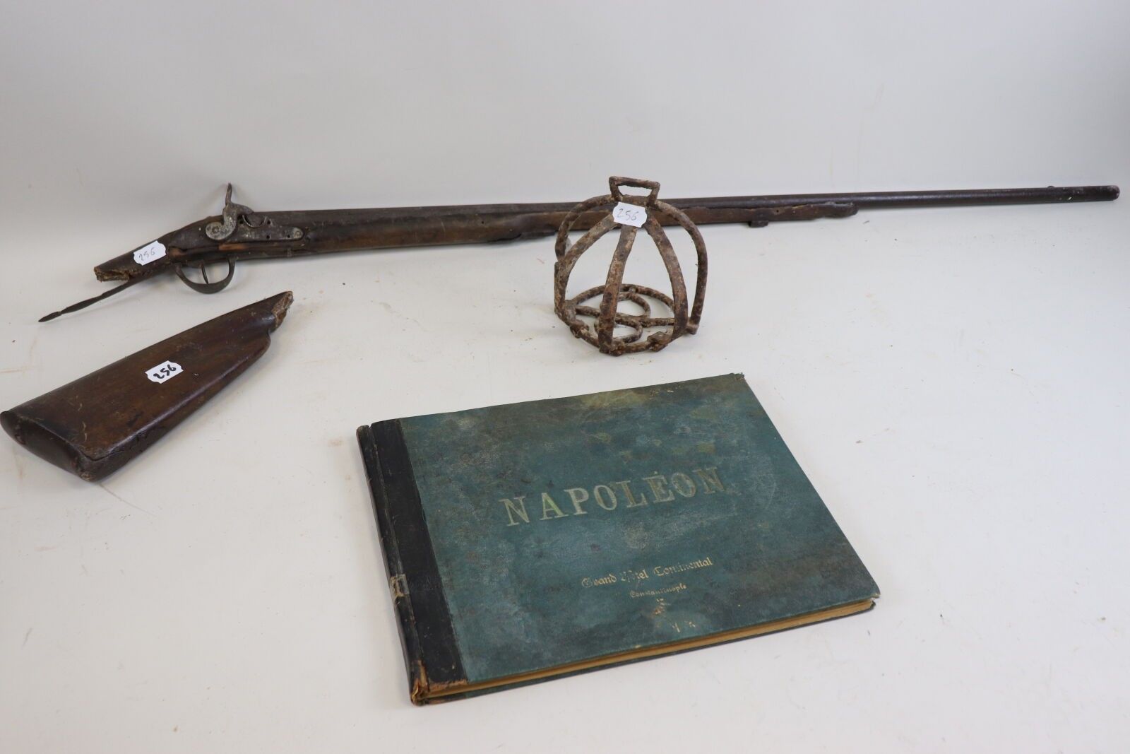 Lot: remainder of a shotgun, converted to percussion; grid stirrup; Napoleon book. As is (accidents, chips, wormholes).