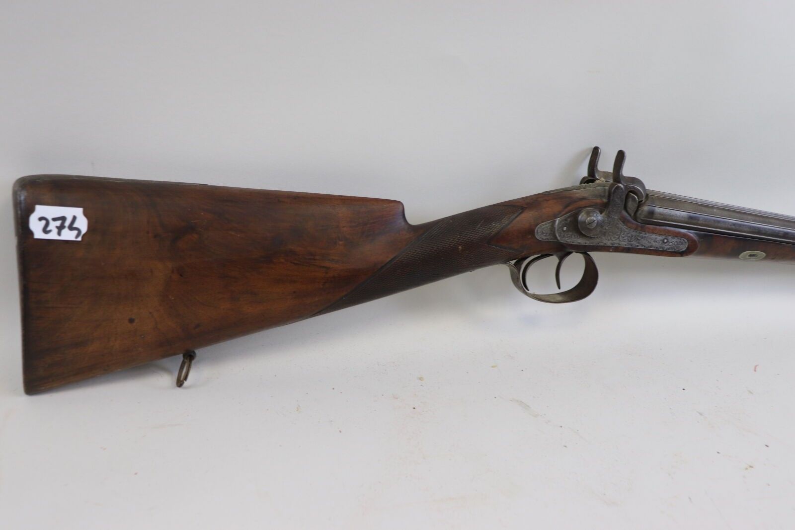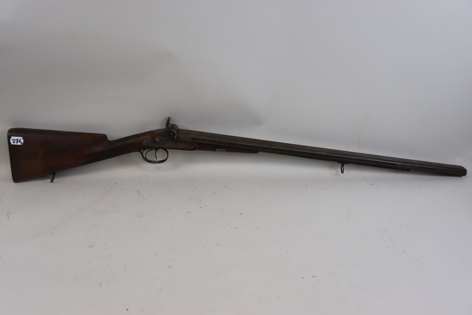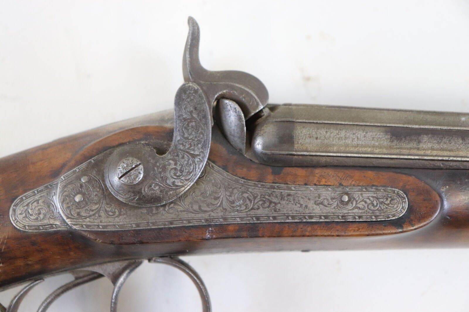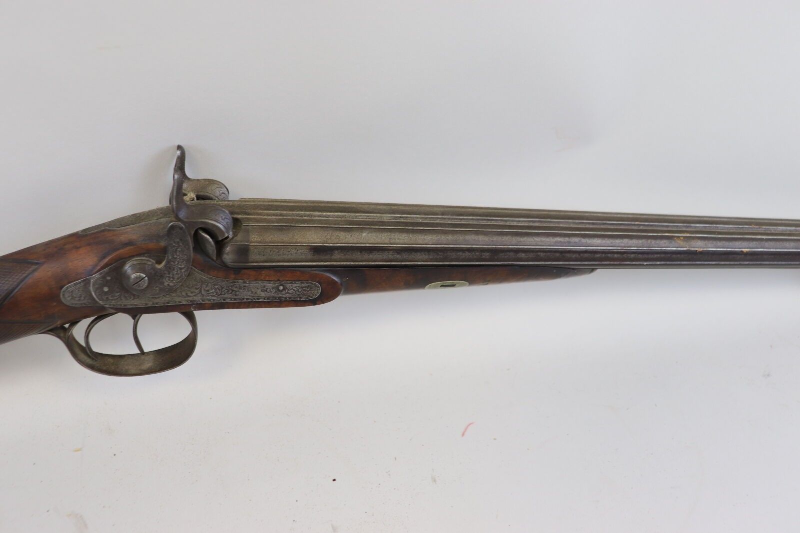Double percussion shotgun. False-damascus barrels. Cut-out iron front plates and fittings engraved with foliage. Partially checkered walnut stock. ABE (oxidation)