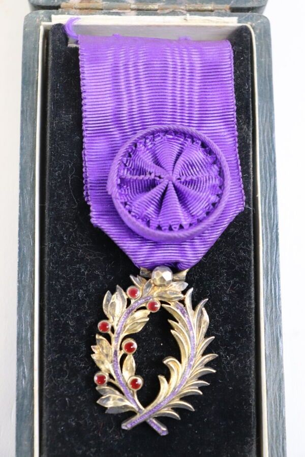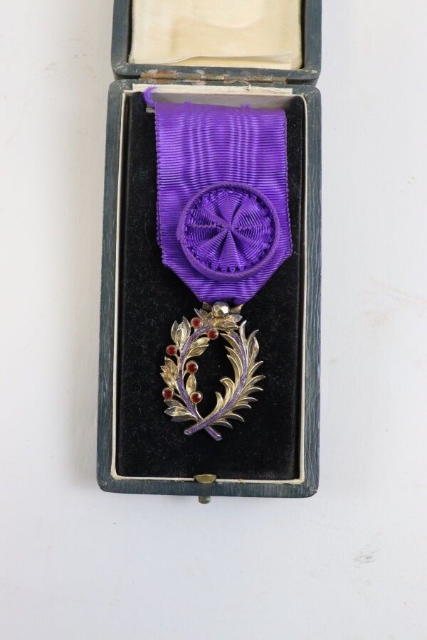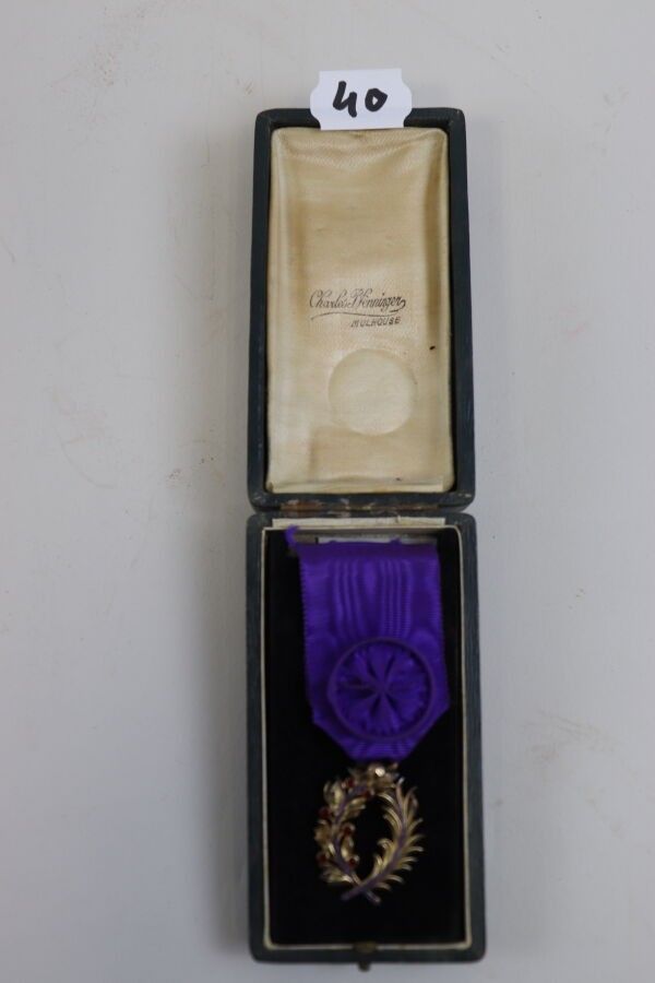 France Ordre des Palmes académiques. Officer's insignia. Vermeil, enamel (chips), rosette ribbon, Charles Pfennigen Mulhouse case.