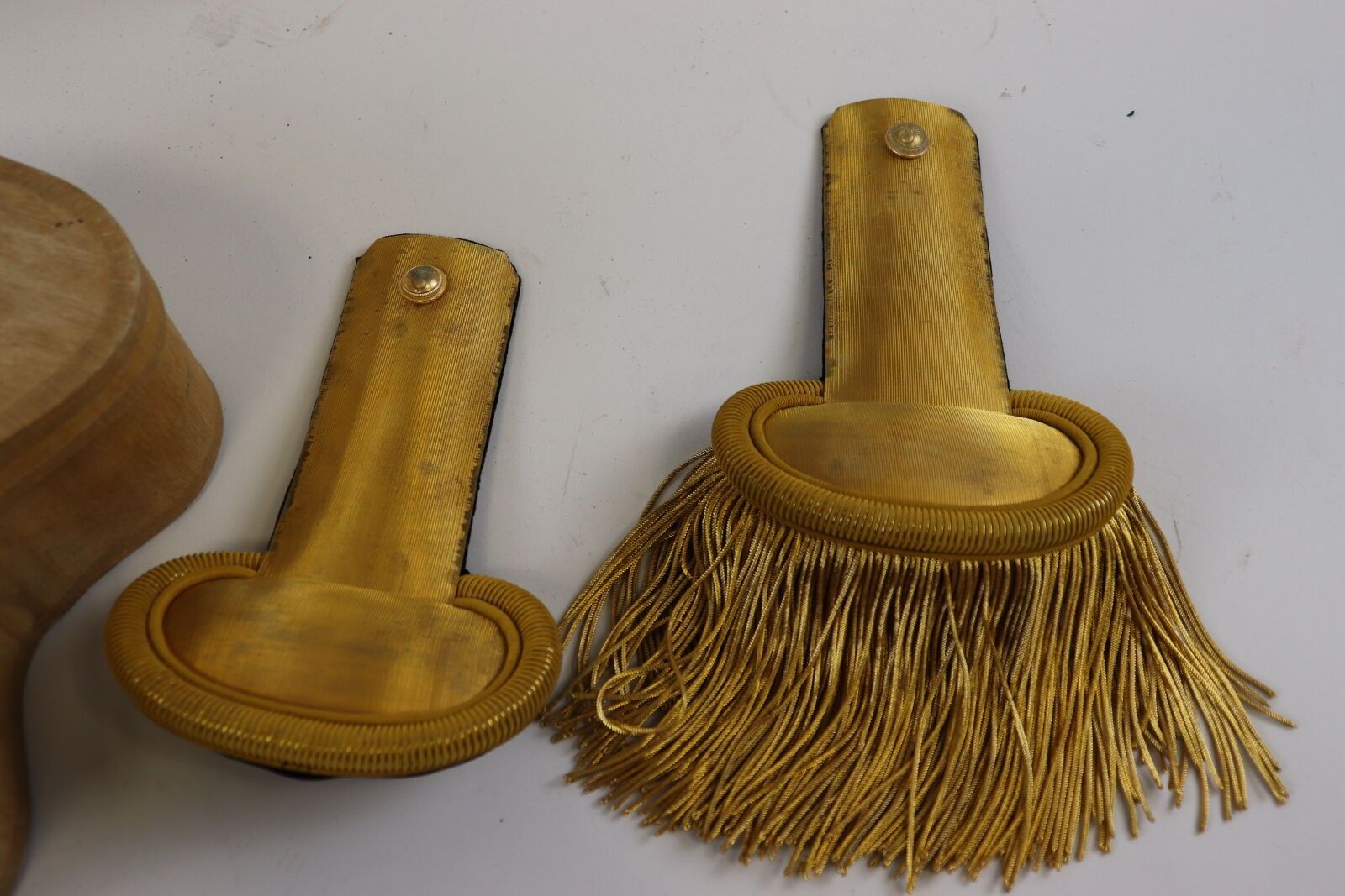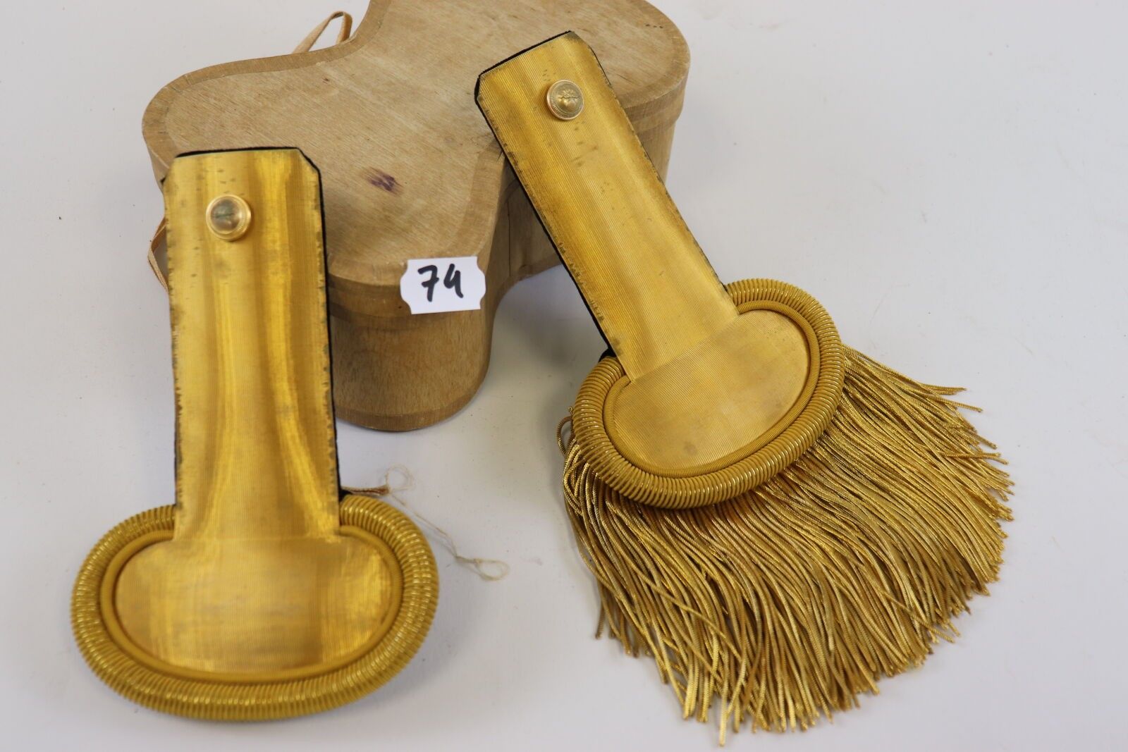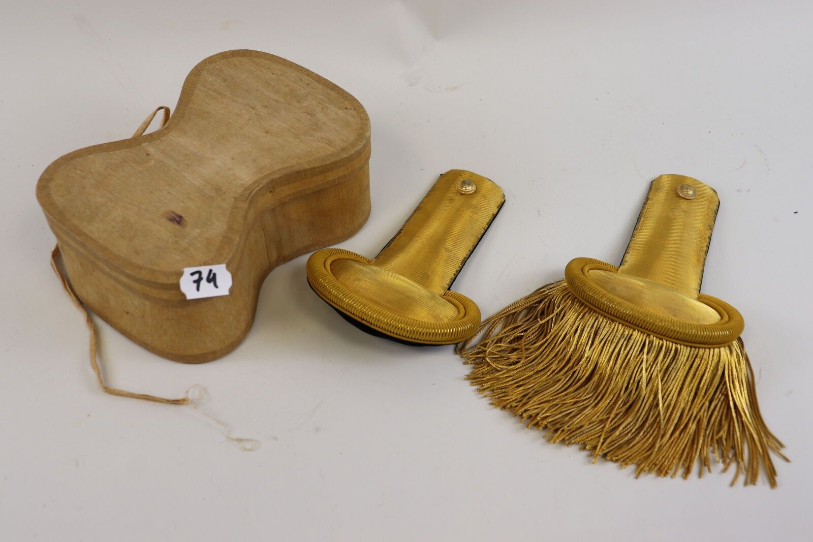 Pair of gold Infantry Lieutenant epaulettes and counter epaulettes. Black velvet lining. In its wooden box. Made by M.B