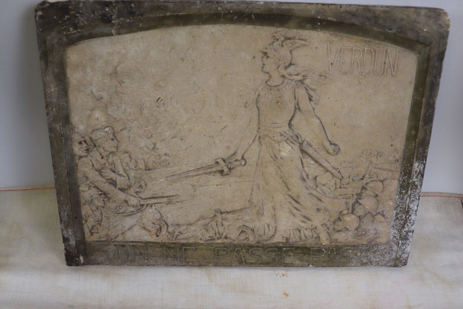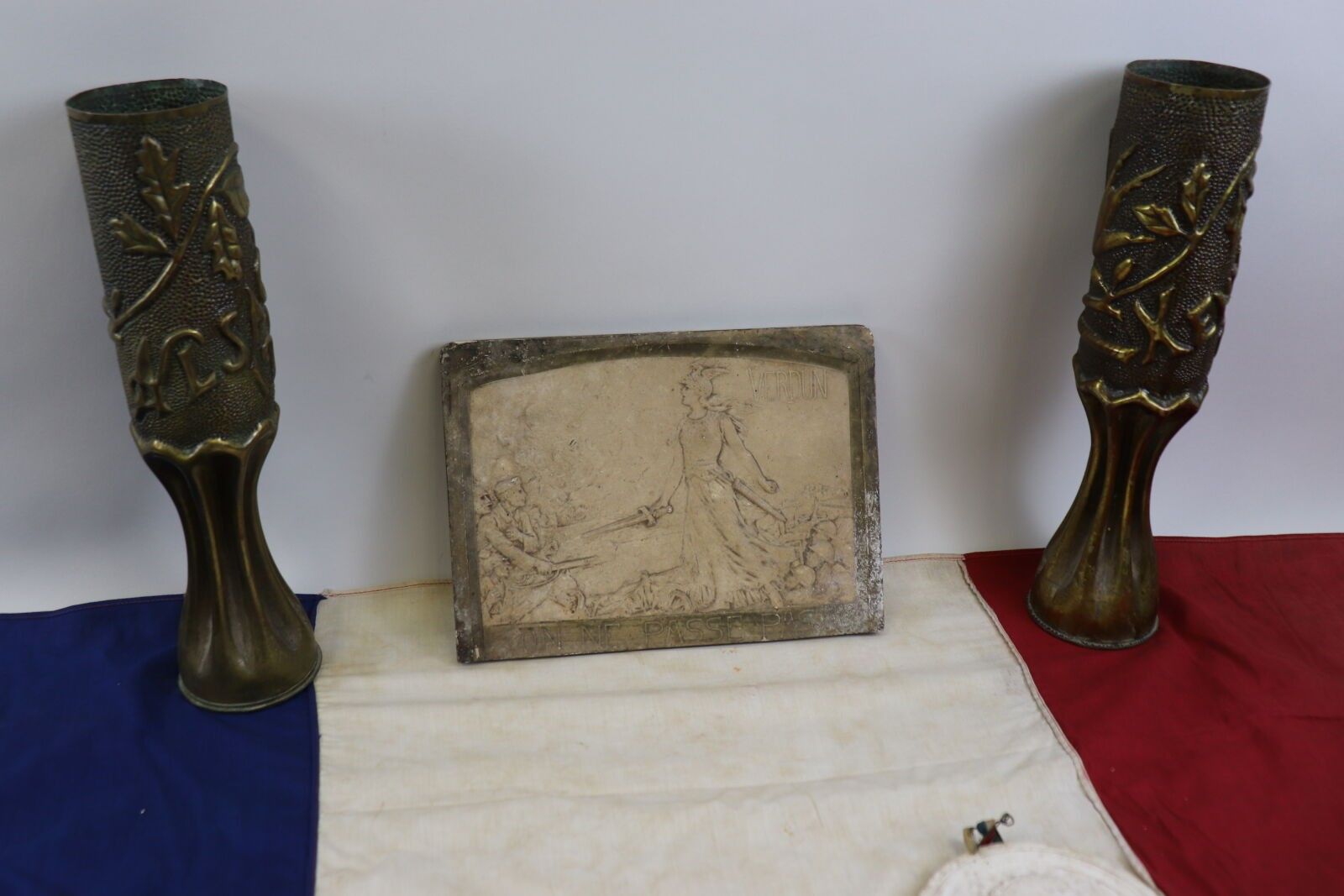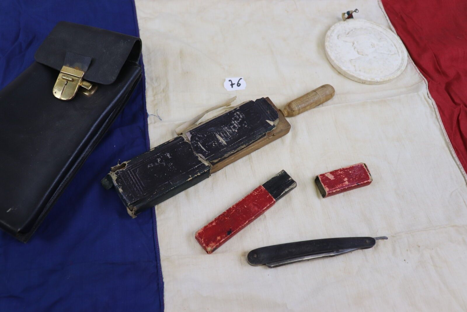 Lot: pair of worked cartridge cases; 2 plaster medallions; 2 razors; tricolour flag; magnificent skai case.