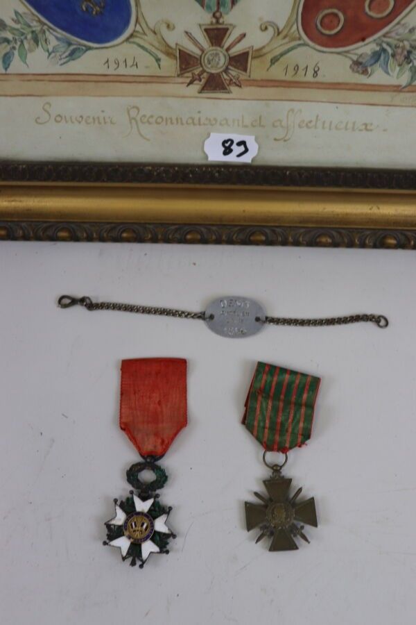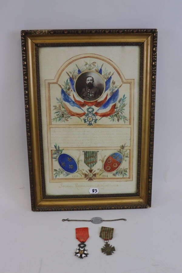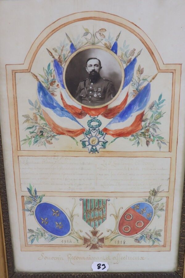 France Souvenirs of Second Lieutenant Albony. Fancy diploma, watercoloured, with his photo and these two citations, framed under glass. With Légion d'honneur, Croix de guerre 1914 1915. Attached is an identity plate in the name of Denis Aurélien Louis 1896, Limoges 1068. (faded writing, brown spots)