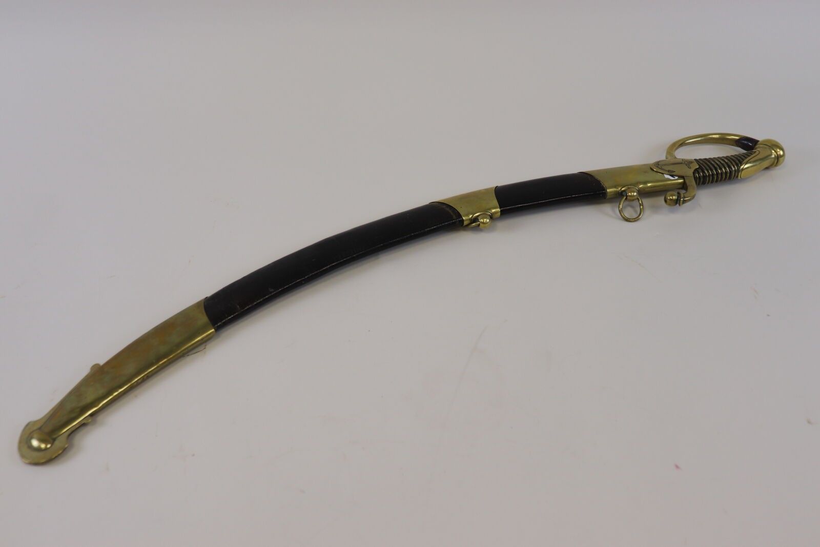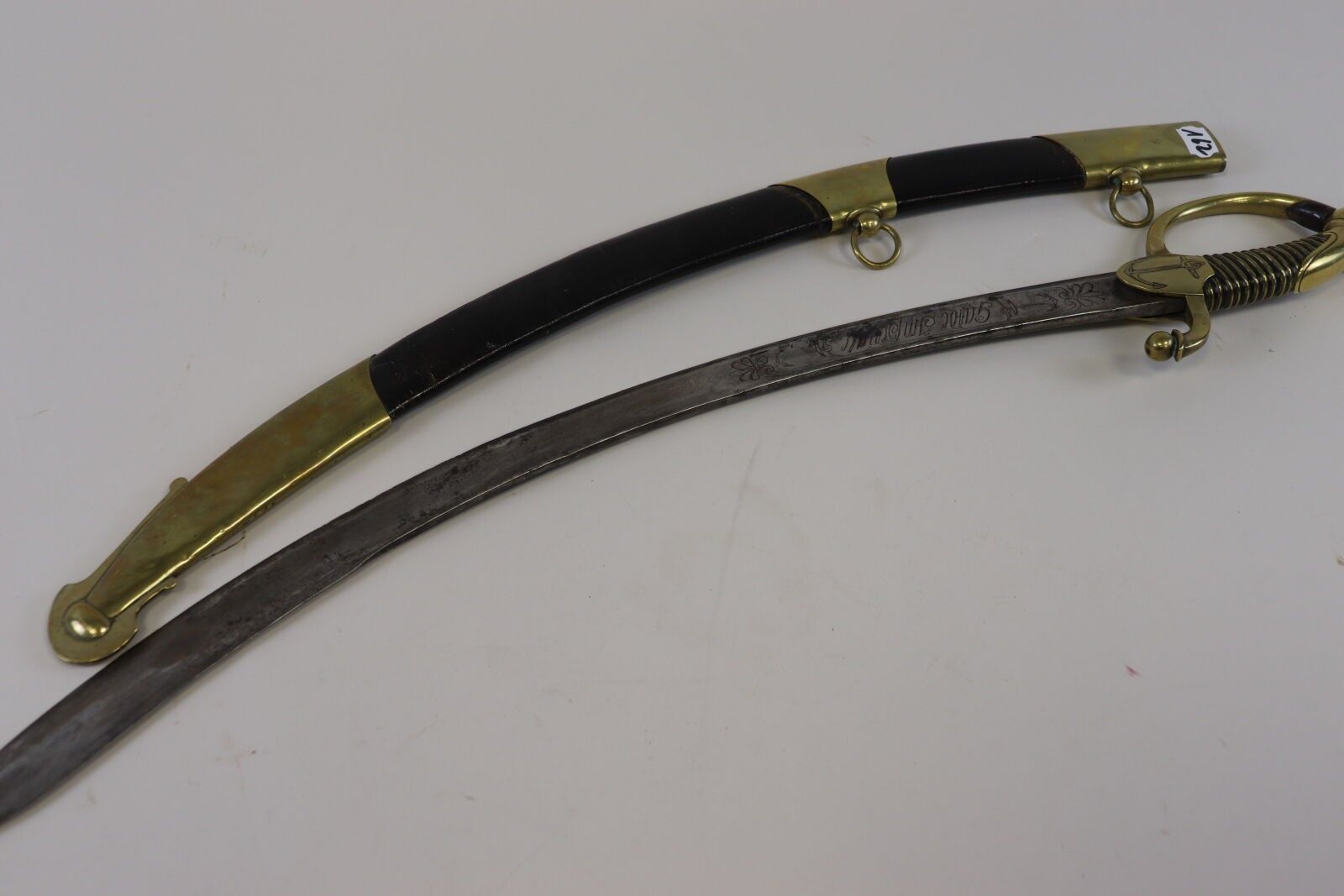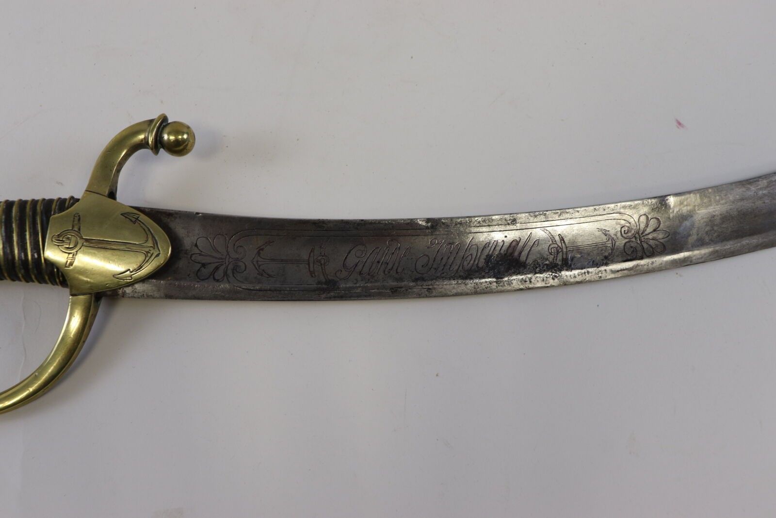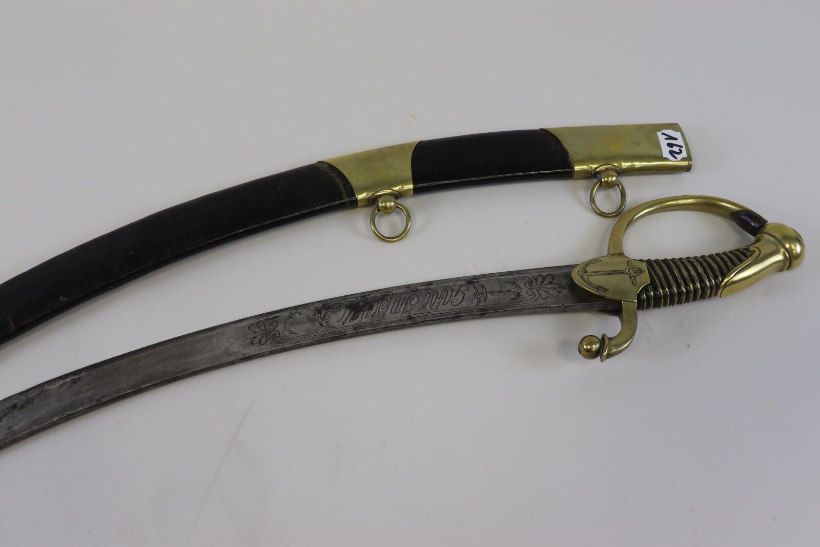 Imperial Guard Marines sword. Basane-covered handle with filigree. Brass mounting. Short-tailed cap. Single-branch hilt with basal pommels, engraved on the right-hand pommel with an anchor. Quillon with boulé end, stamped "Duc". Curved blade with round back, counter-edge and hollow sides, half engraved on both sides, in cartouches framed with anchors and palmettes "Garde Impériale".