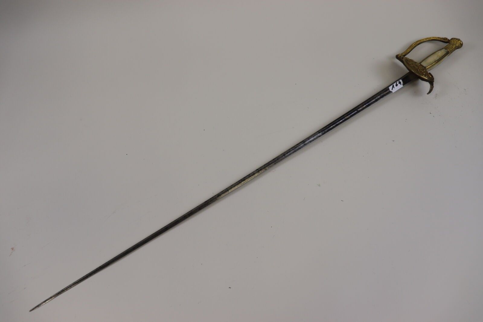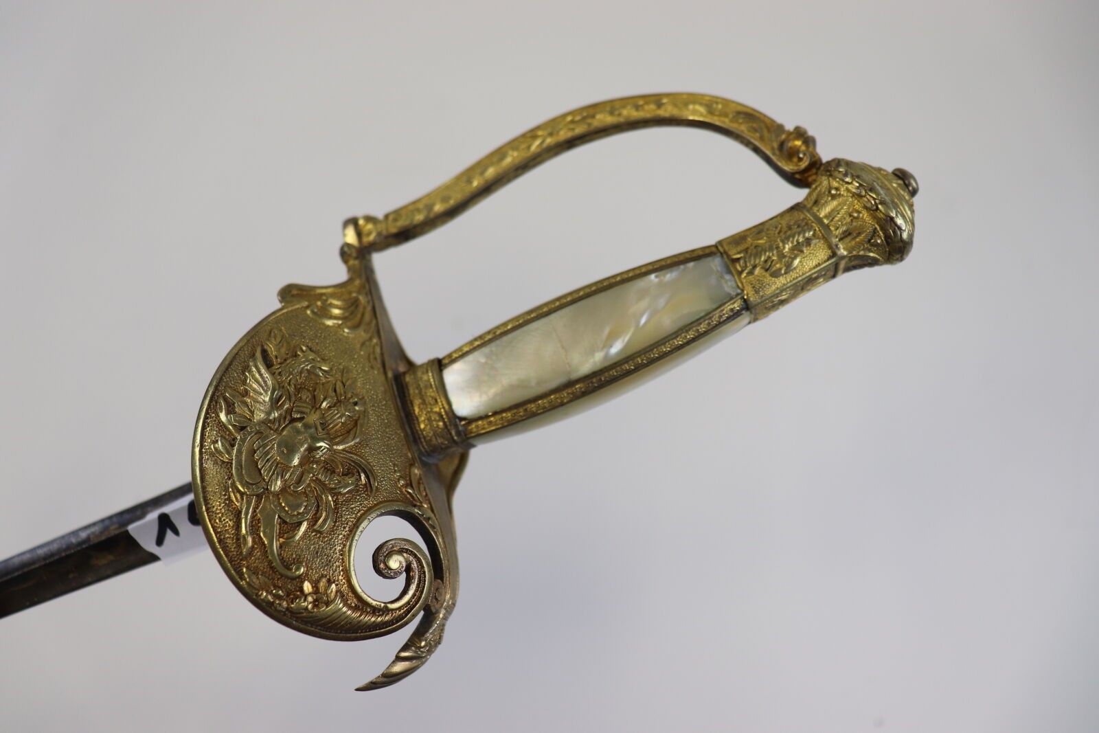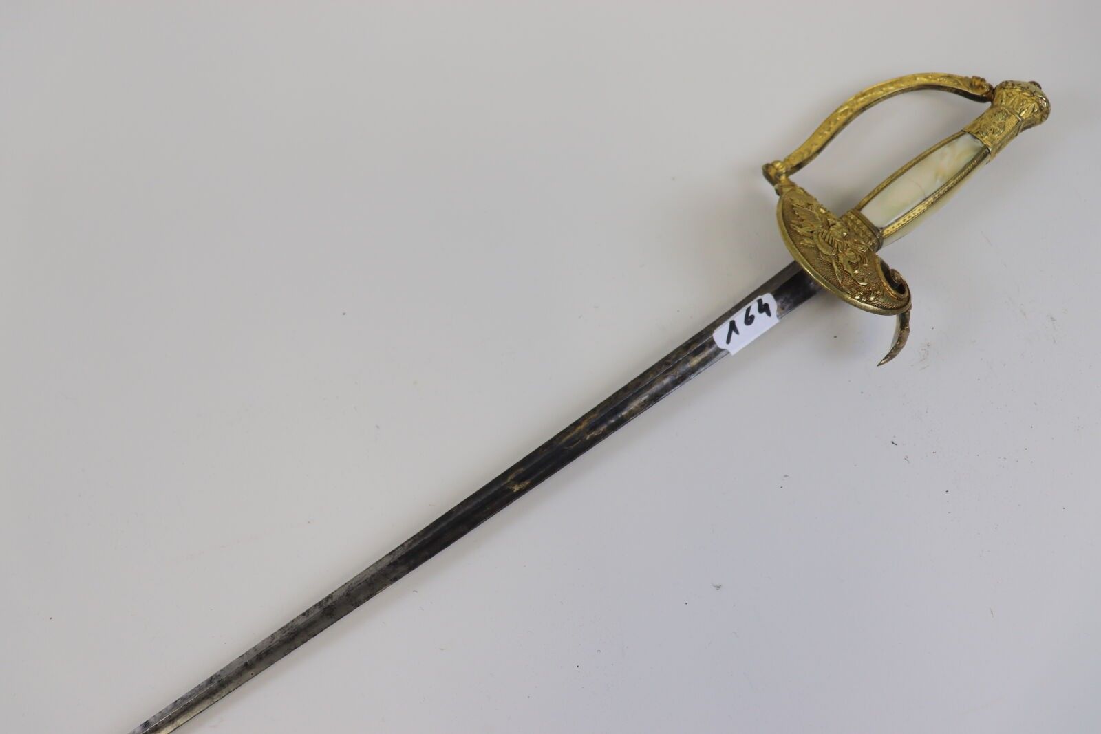 Dragoon staff officer's sword. Spur with mother-of-pearl plates. Chased and gilded brass mount. Pommel with lightning bolts. Guard with one branch. Comma-shaped keyboard with military attributes and dragon. Triangular blade, one third engraved. ABE SF (posterior quillon, crack to a plate, pitted blade)
