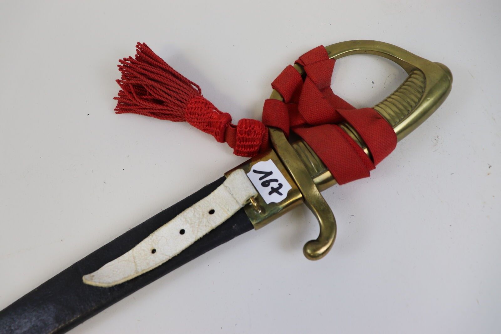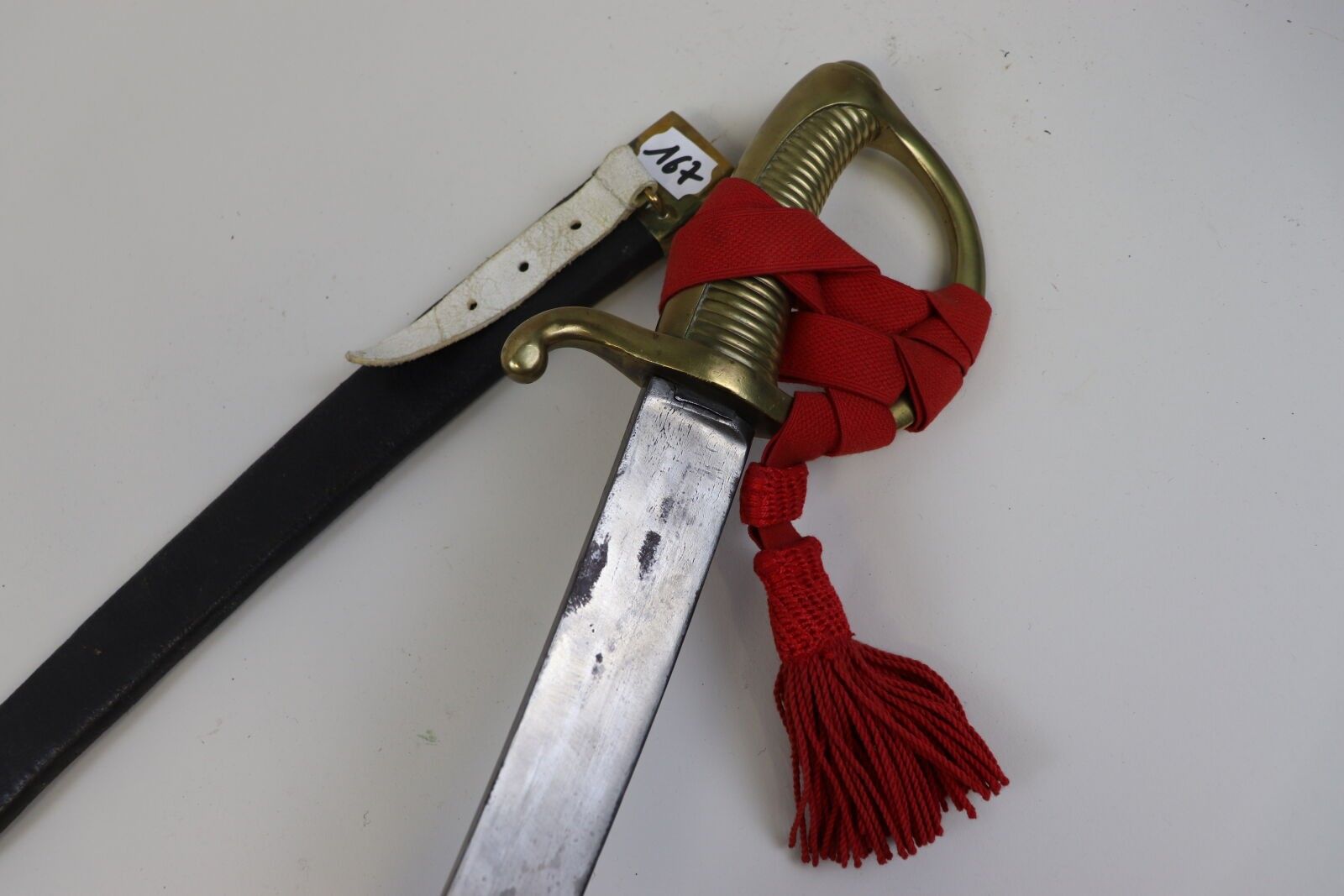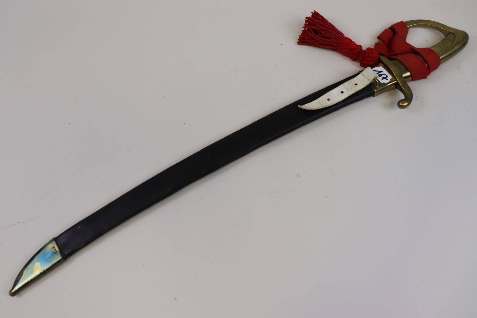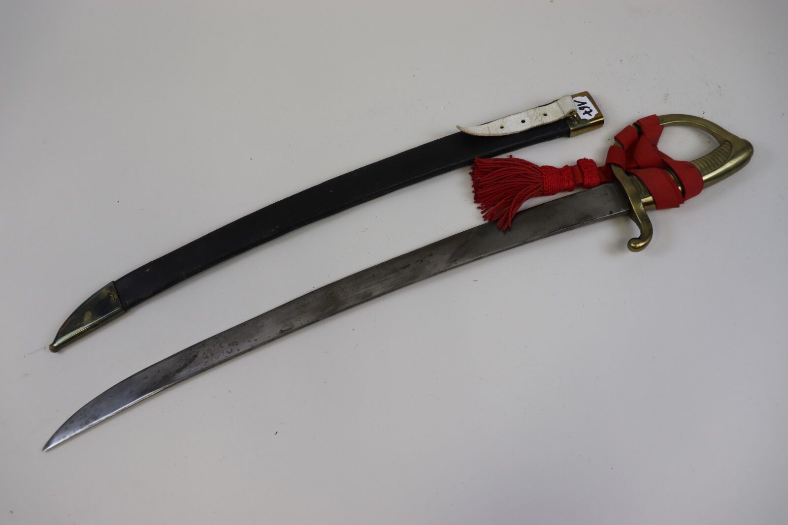 Sabre lighter. Brass mounting. Curved blade, dated 1819. With leather scabbard with two brass fittings and red lanyard. As is (pitting, wear).