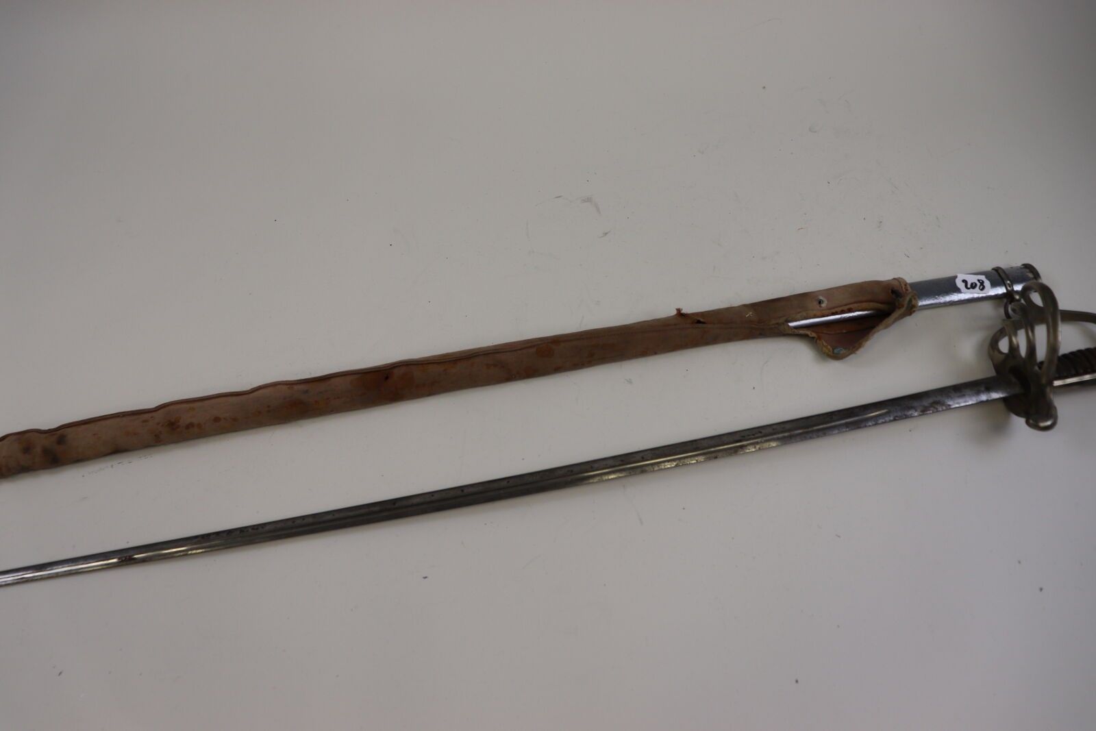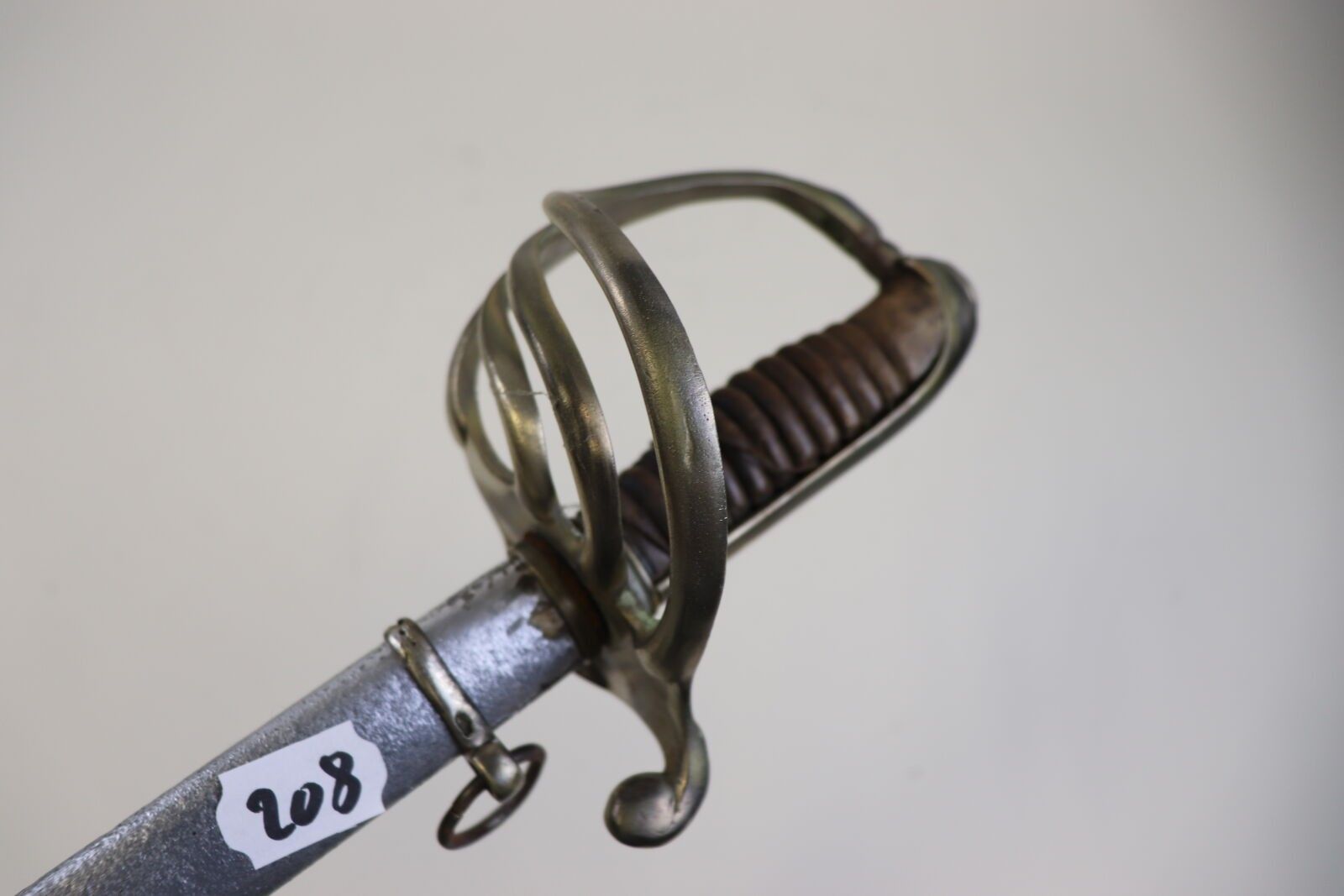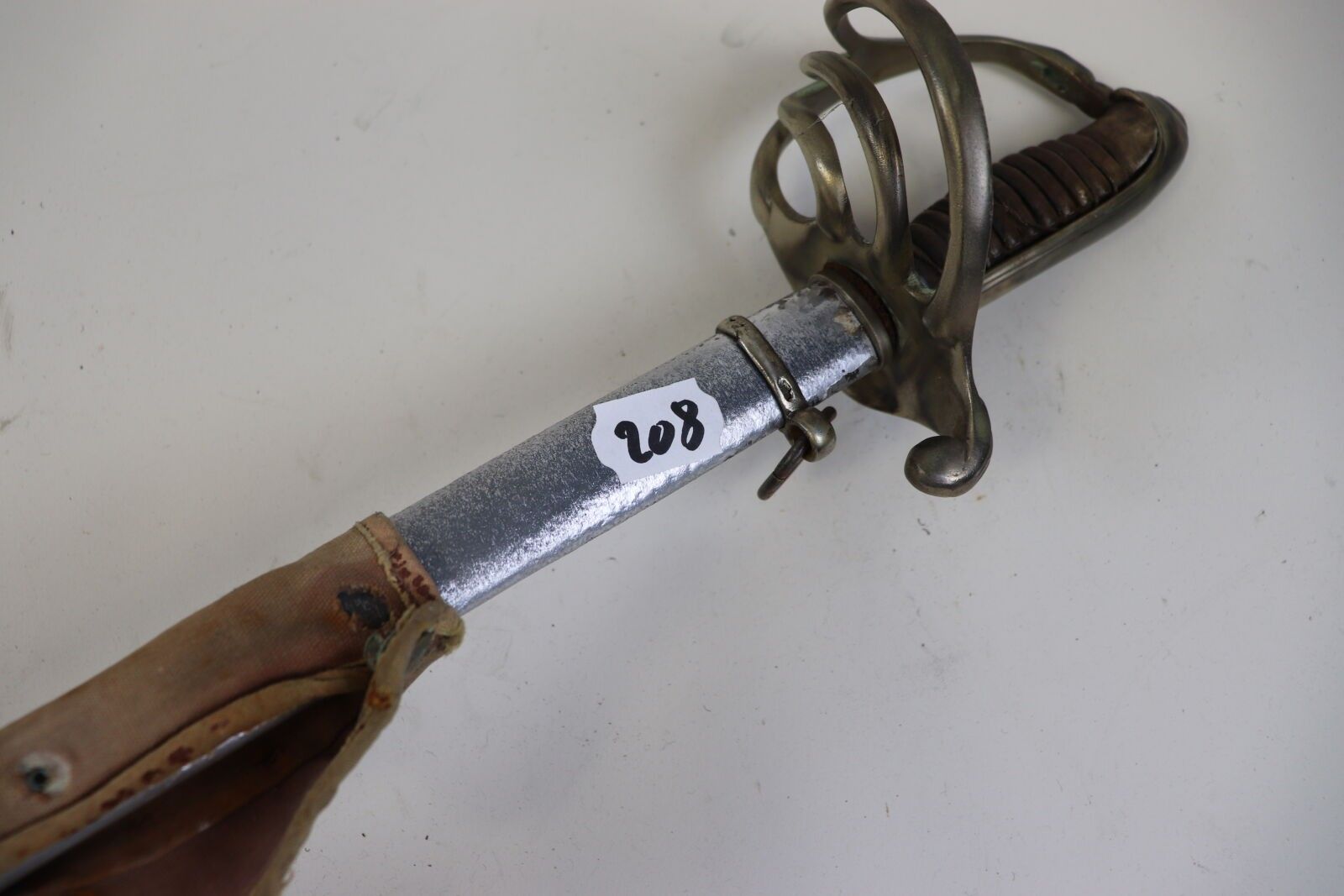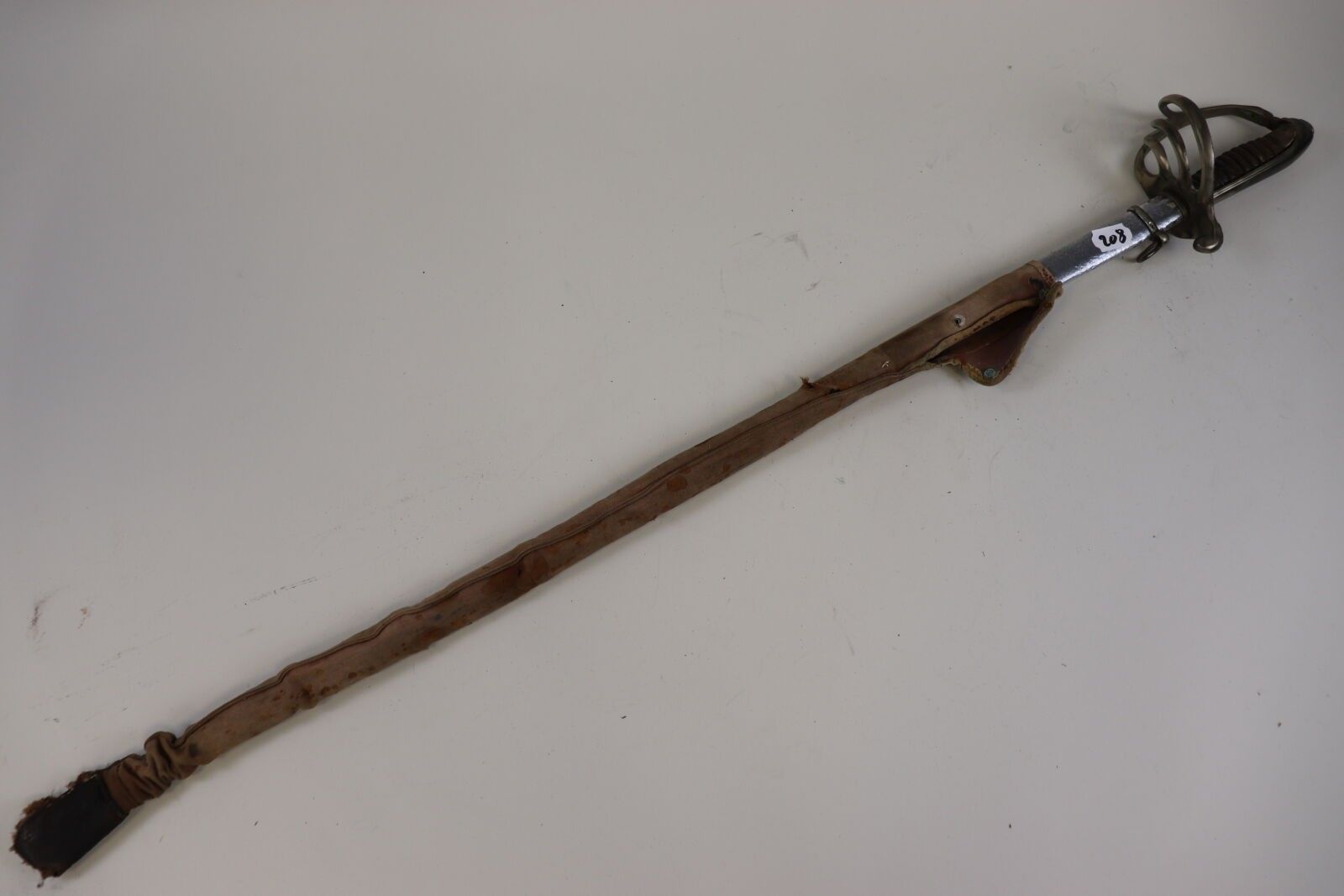 Infantry officer's sabre, model 1882. Four-point hilt. Blade with asymmetrical gutters. Iron scabbard. With leather and leather scabbard cover. As is (accidents, missing parts, heavy pitting).
