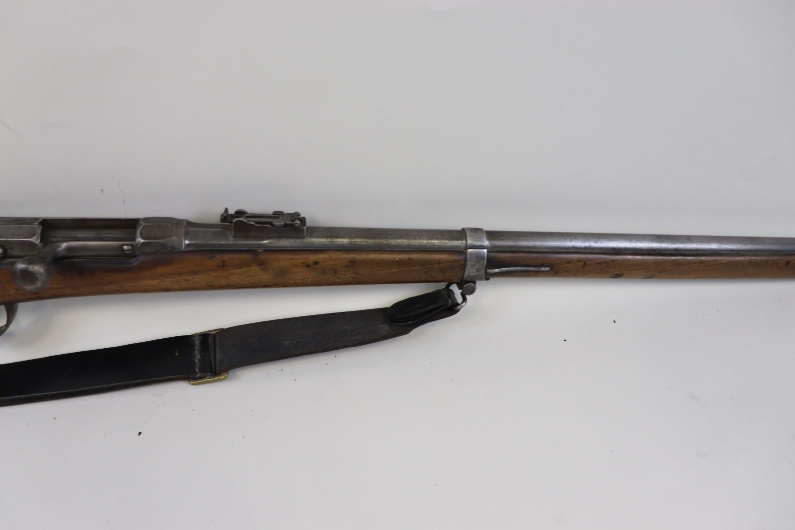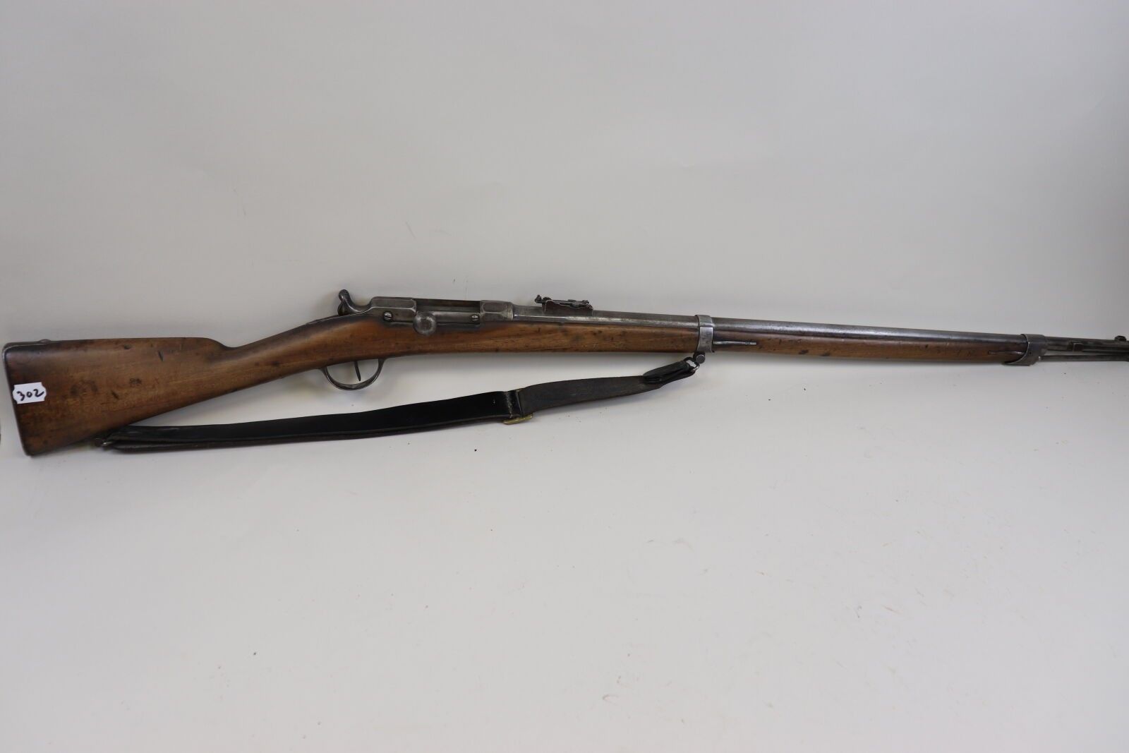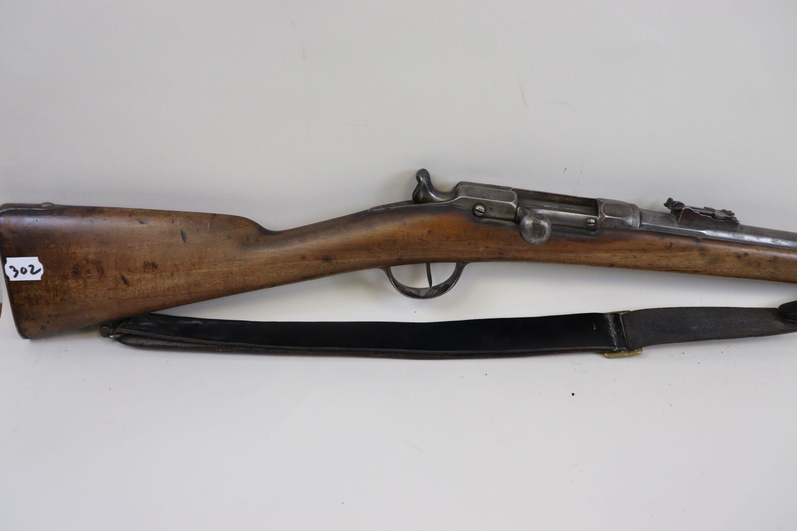 Spanish made bolt action rifle, model 1866. Round, fluted barrel marked "2nd class", with frog. Case engraved "Épreuve des Manufres Impales Tulle Zuazubscar Ysla y Ca Placencia, Cahen - Lyon et Cie, Mle 1866". Walnut stock. With black leather shoulder strap. EM (pitting, wear)