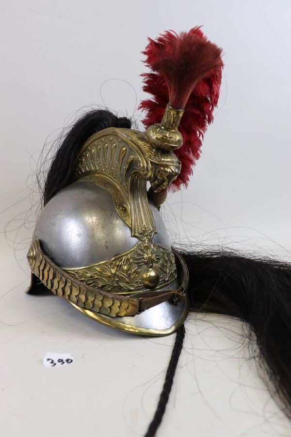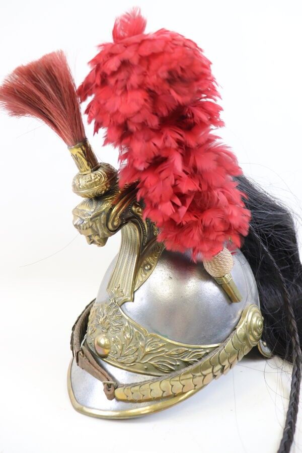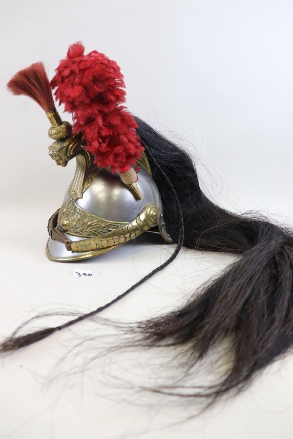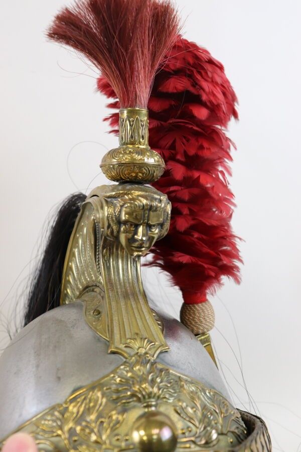 Cuirassier crest helmet, model 1874. Iron bomb. Crest, marmoset, plate and chinstraps with brass scales. Nylon puff and mane. Leather inner cap. Red plume. As is (restorations, pitting, accidents, missing parts).
