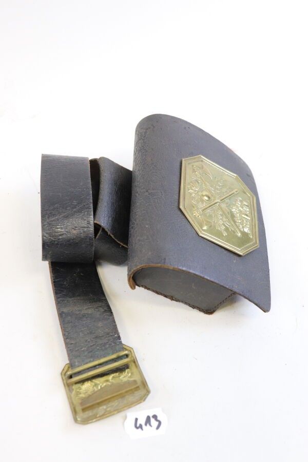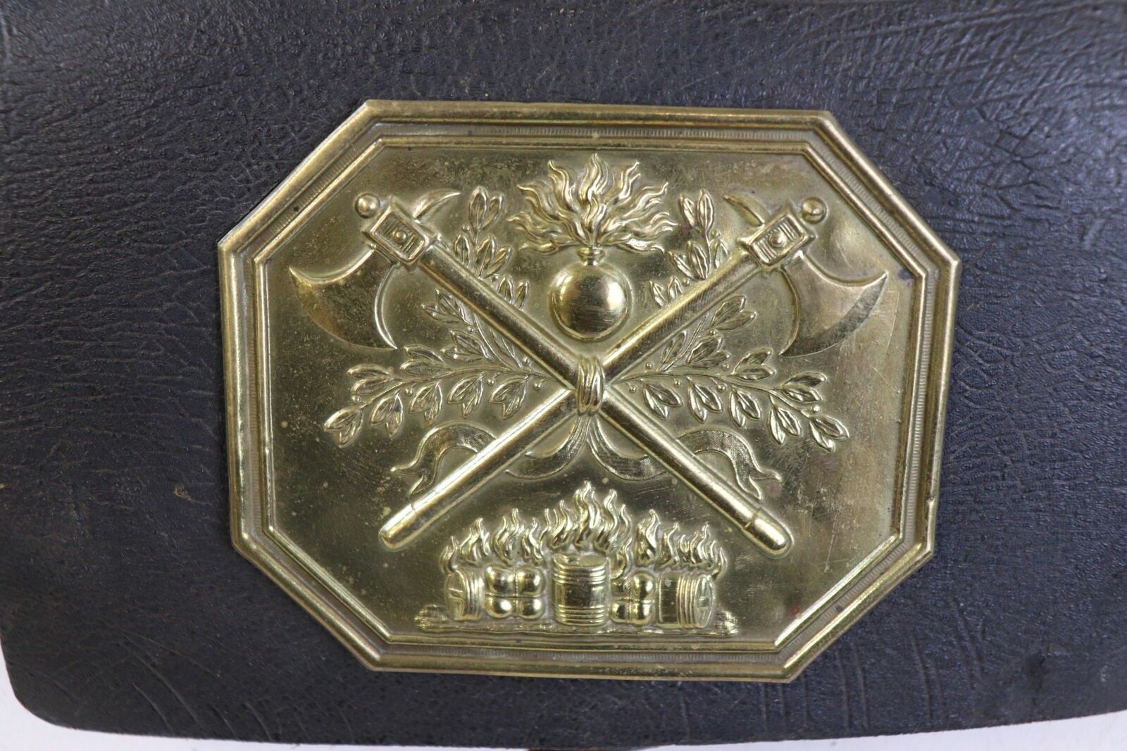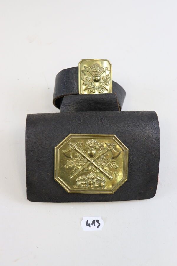 Black leather firemen's belt gaberna and belt. Top and motif with crossed axes and grenades.