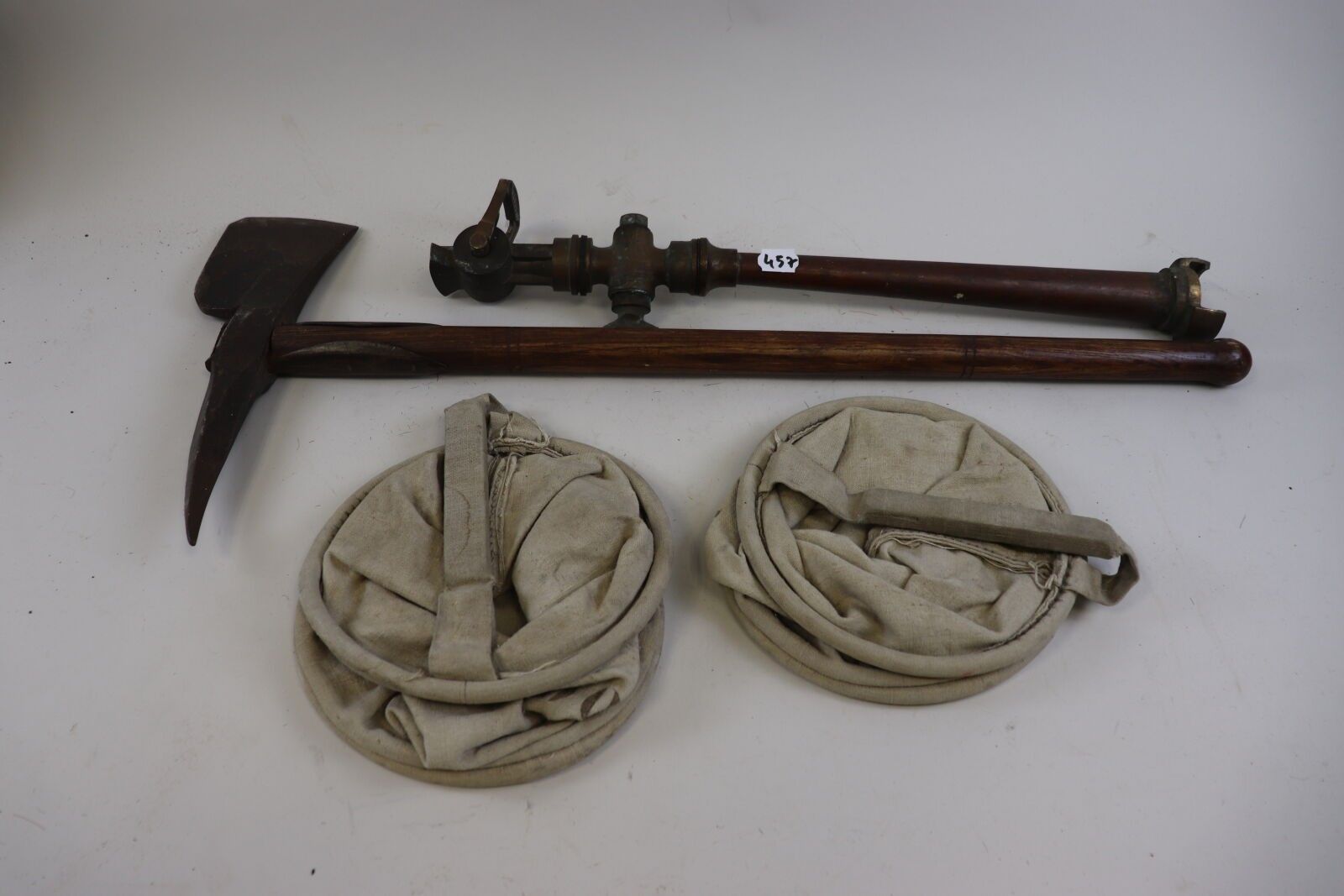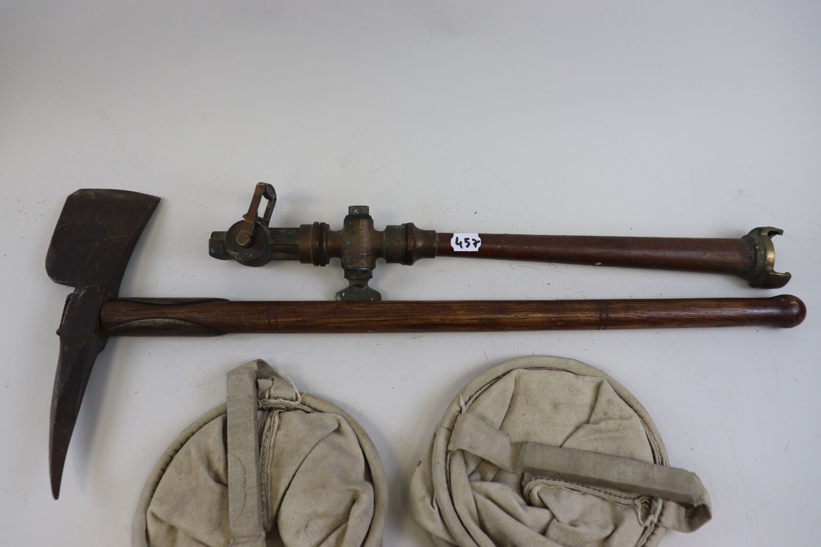 Fireman's set: axe with spade back; leather spear; 2 canvas …