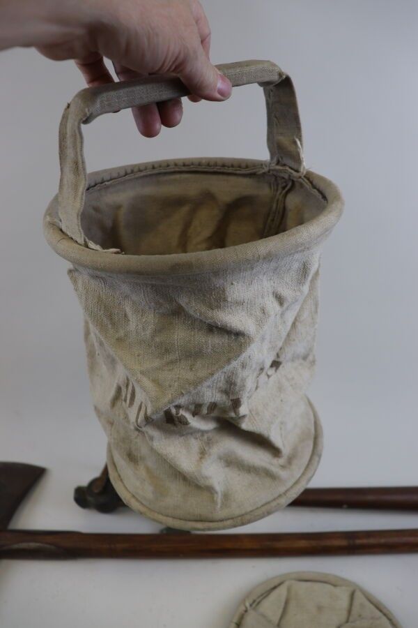 Fireman's set: axe with spade back; leather spear; 2 canvas buckets (worn)