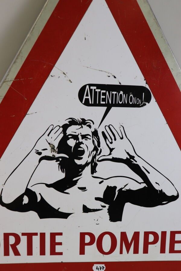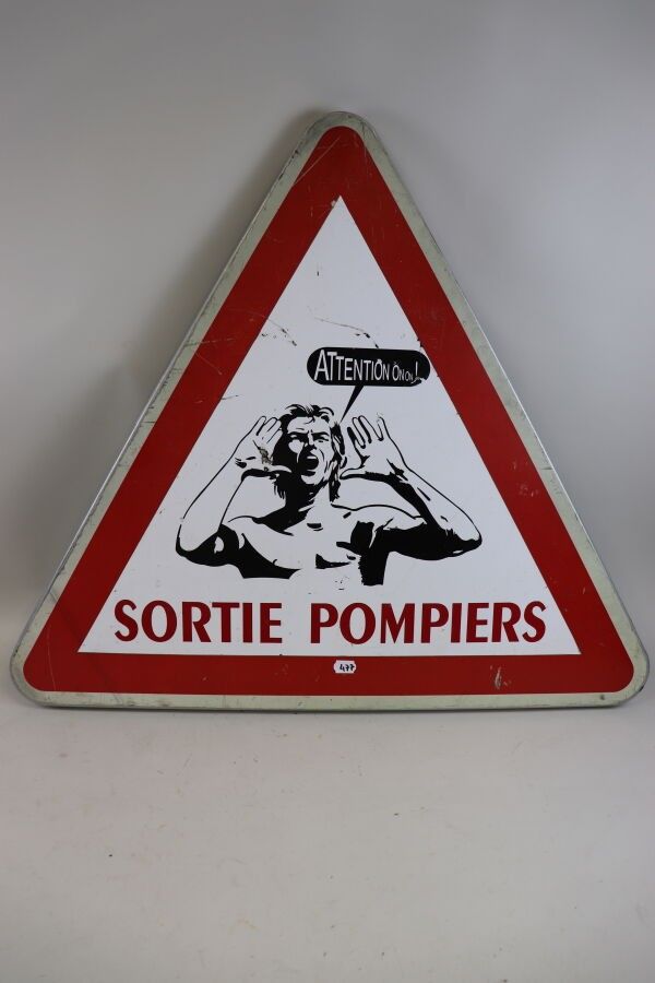 Triangular road sign, marked "Attention on ! Sortie Pompiers" (Fire Brigade Exit), depicting a young, busty, bare-chested ephebe.