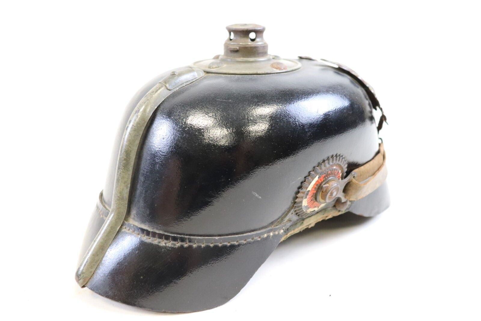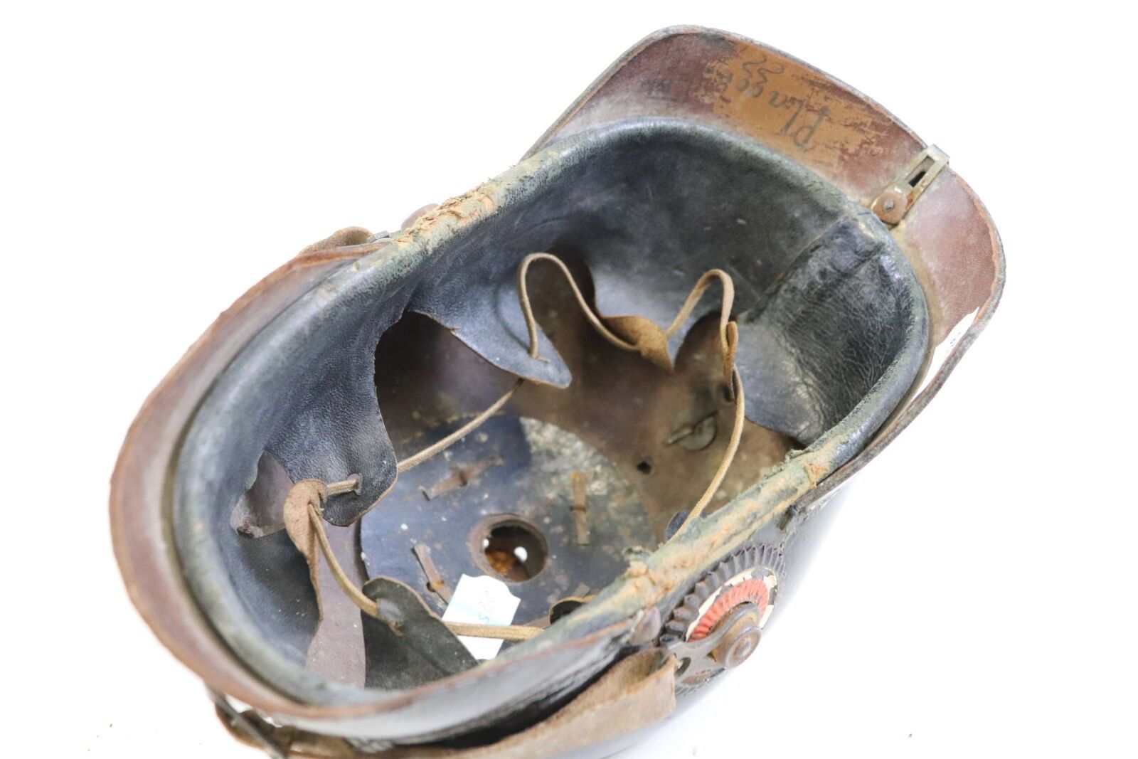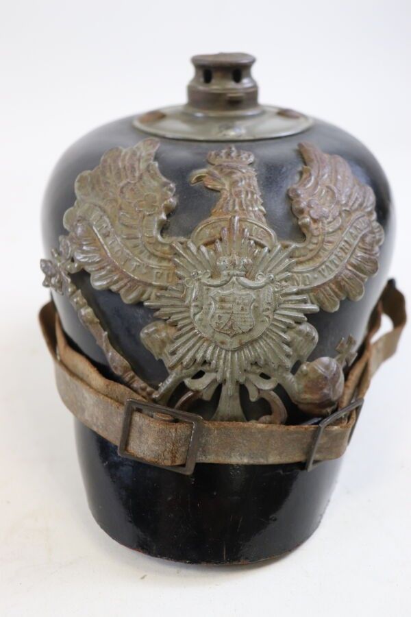Spiked helmet of the 91st Oldenburg Infantry Regiment, model 1915. Patent leather shell, visor and neck cover. Painted iron base, rims and plate with eagle and coat of arms. Tricoloured metal roundels. Inner cap and chinstrap in leather. Nape of the neck with stamp and soldier's name. ABE (missing tip and visor ring, minor wear to leather, oxidation, deformed bomb).