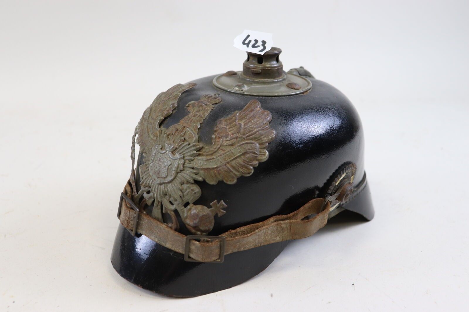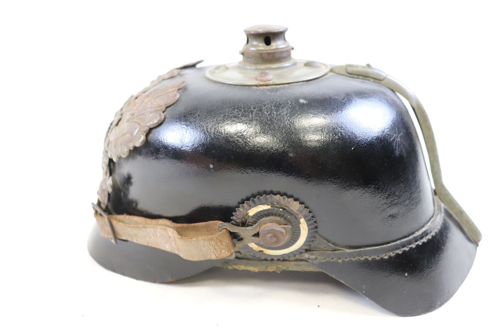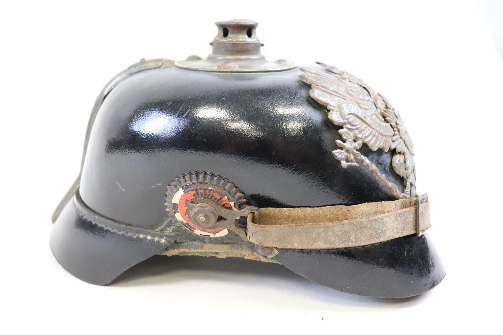 Spiked helmet of the 91st Oldenburg Infantry Regiment, model 1915. Patent leather shell, visor and neck cover. Painted iron base, rims and plate with eagle and coat of arms. Tricoloured metal roundels. Inner cap and chinstrap in leather. Nape of the neck with stamp and soldier's name. ABE (missing tip and visor ring, minor wear to leather, oxidation, deformed bomb).