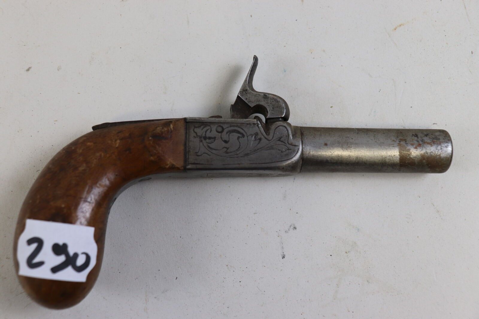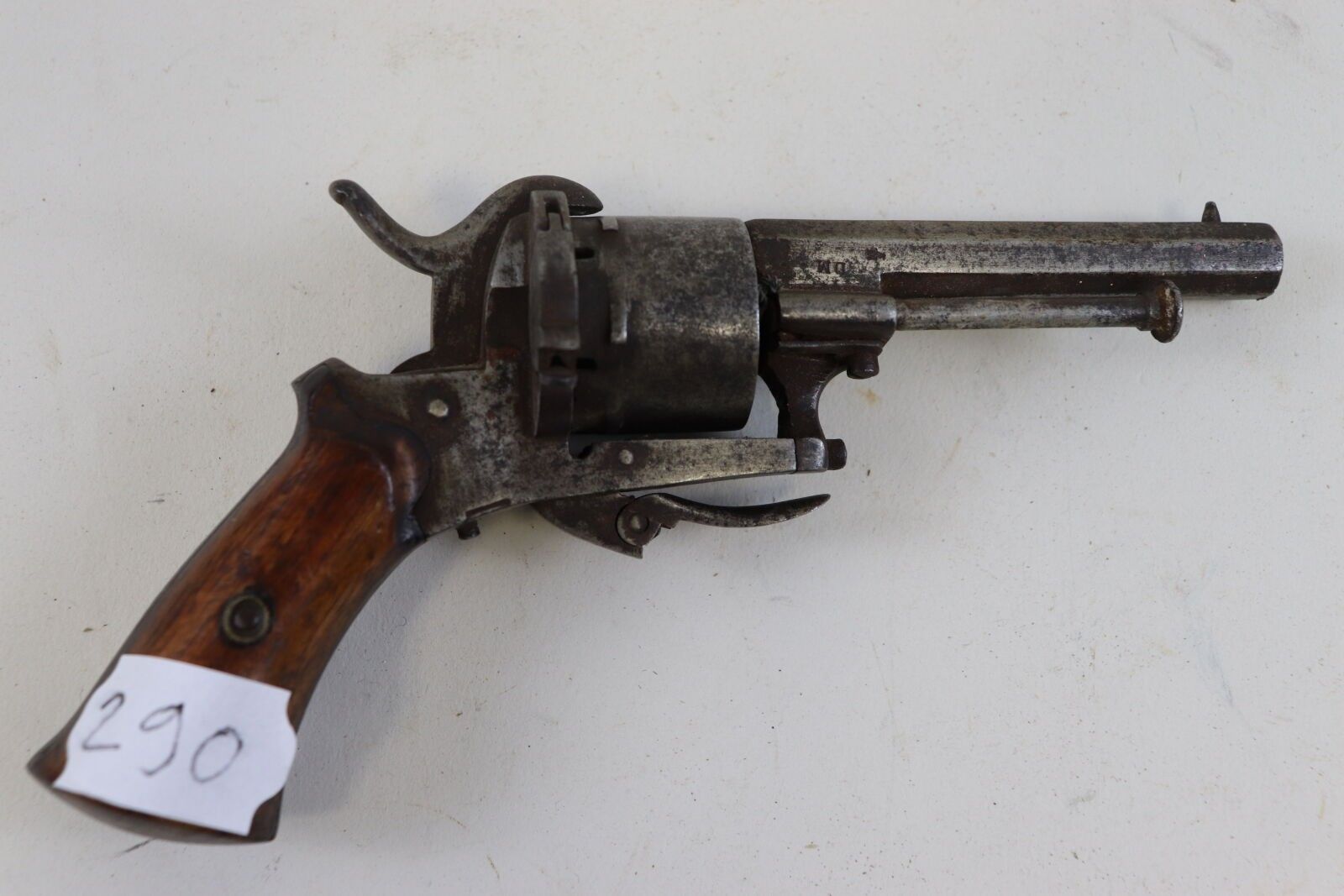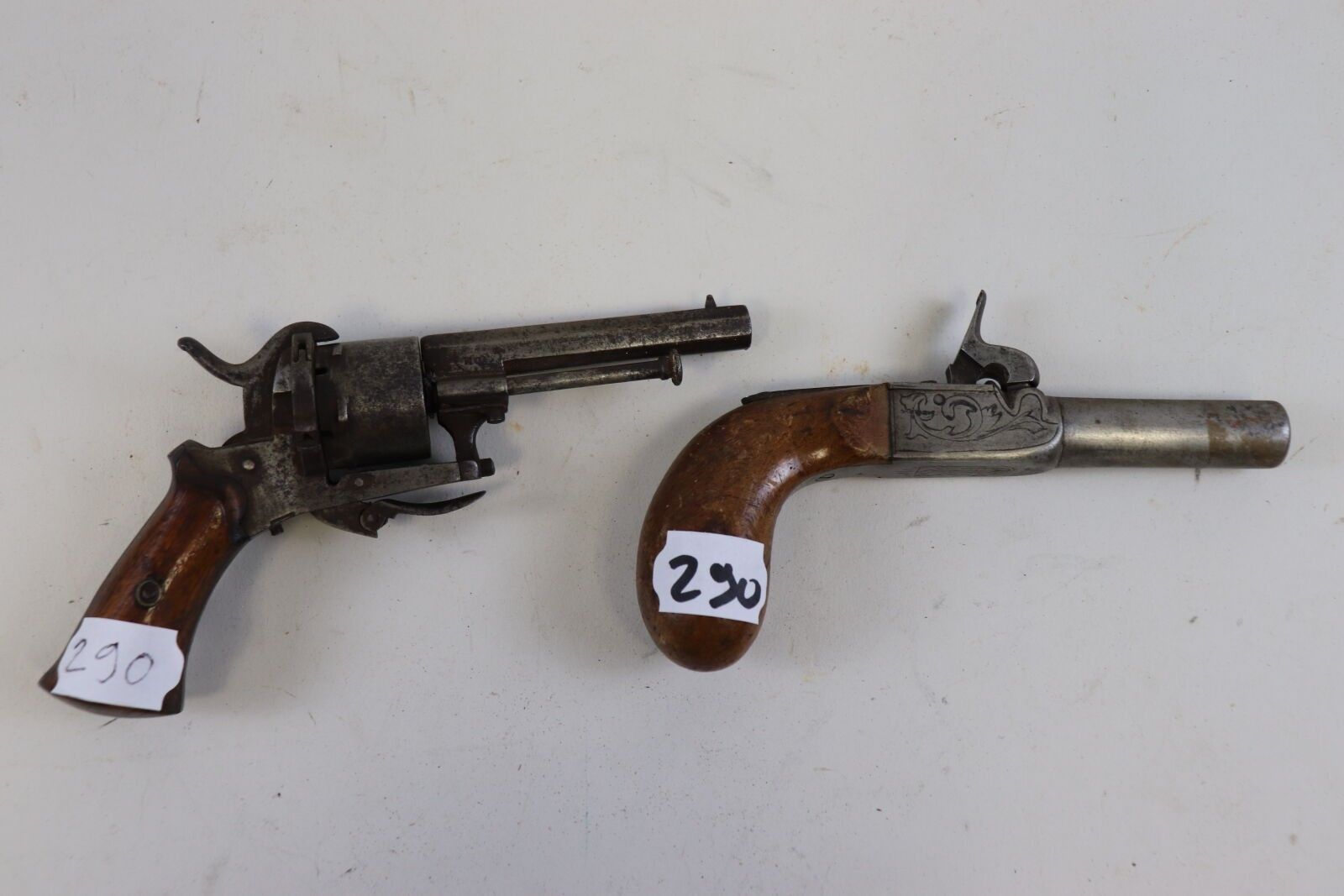 Lot: pistol, boxlock, percussion; pinfire revolver. As is (scratches, accidents, missing parts).