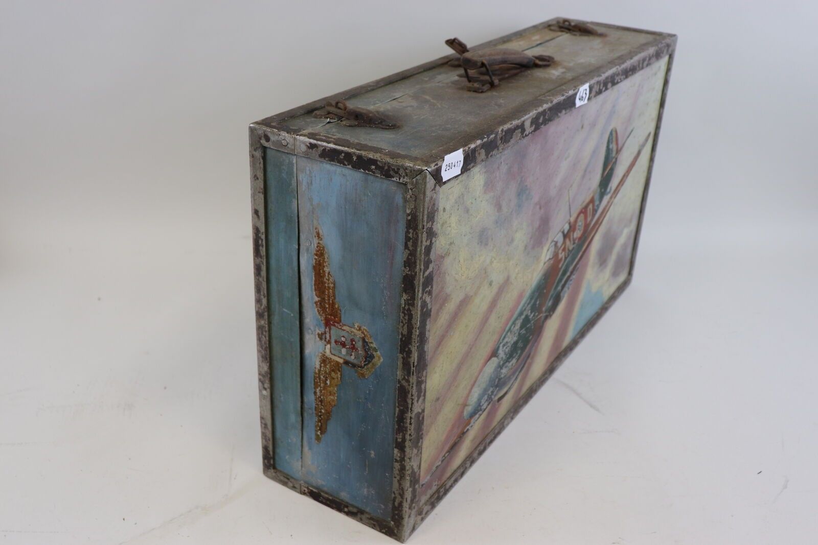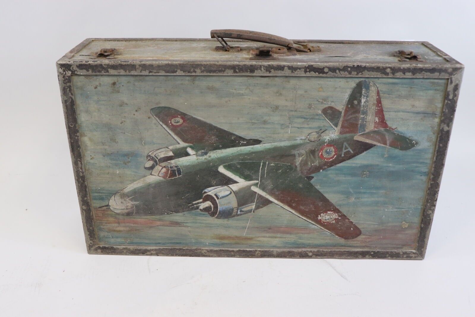 Aluminium suitcase, painted with a Spitfire on one side and a bomber on the other. (paint wear, oxidation)