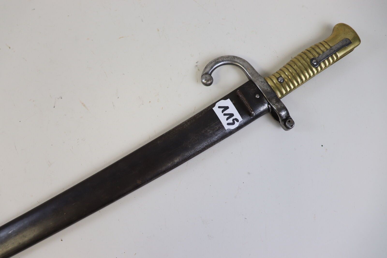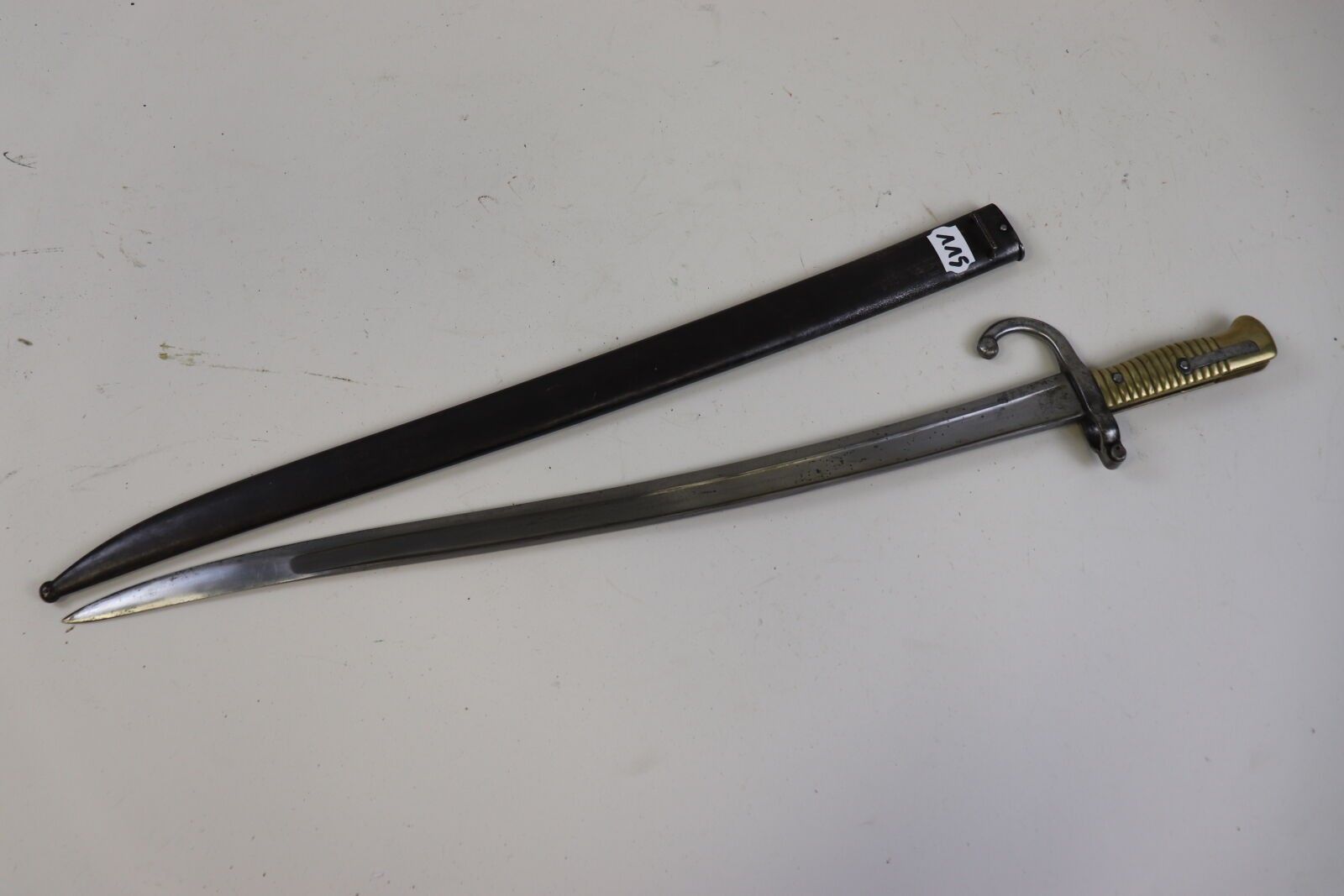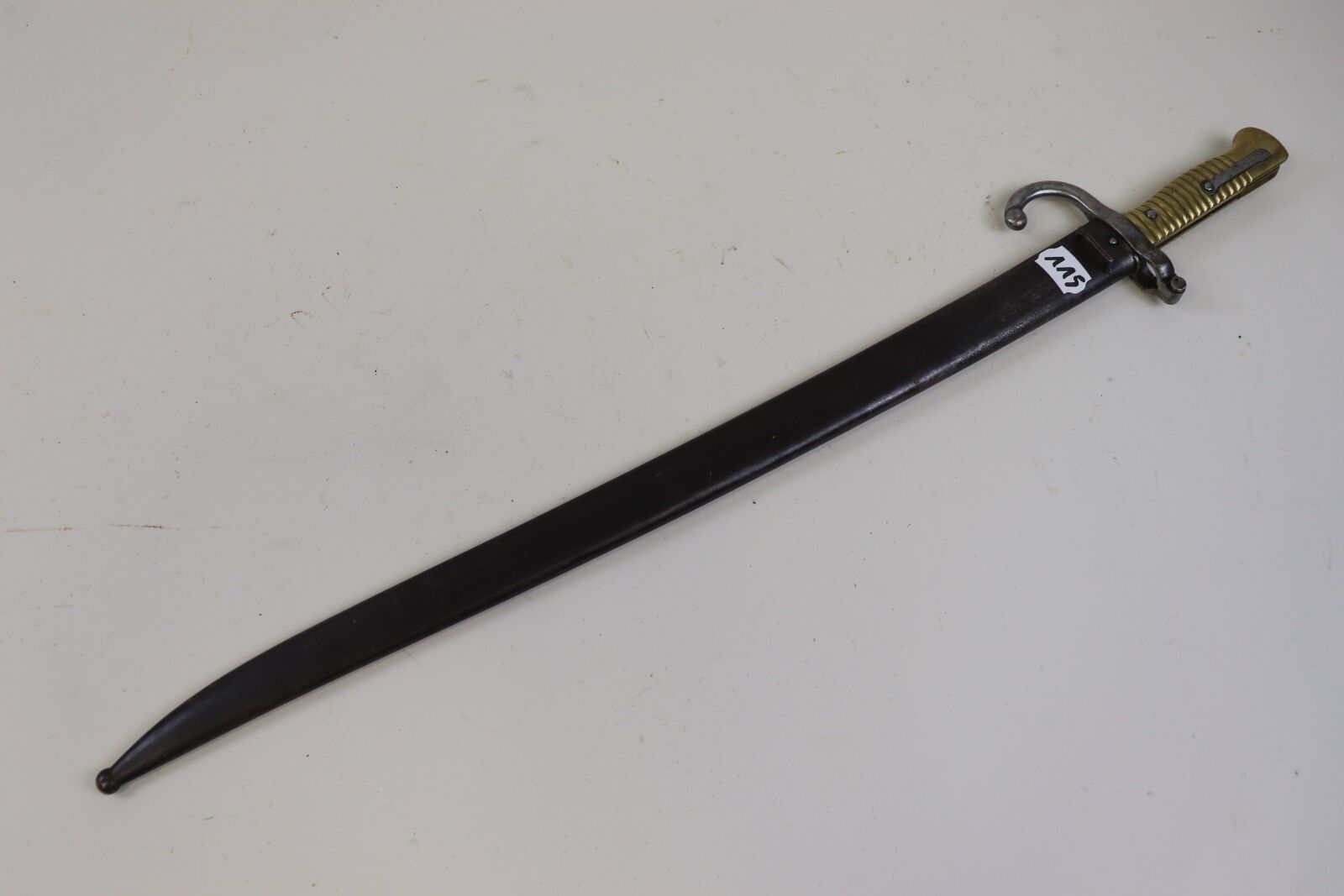 France Bayonet, model 1866. Bronze handle. Yatagan blade. Pitted iron scabbard.