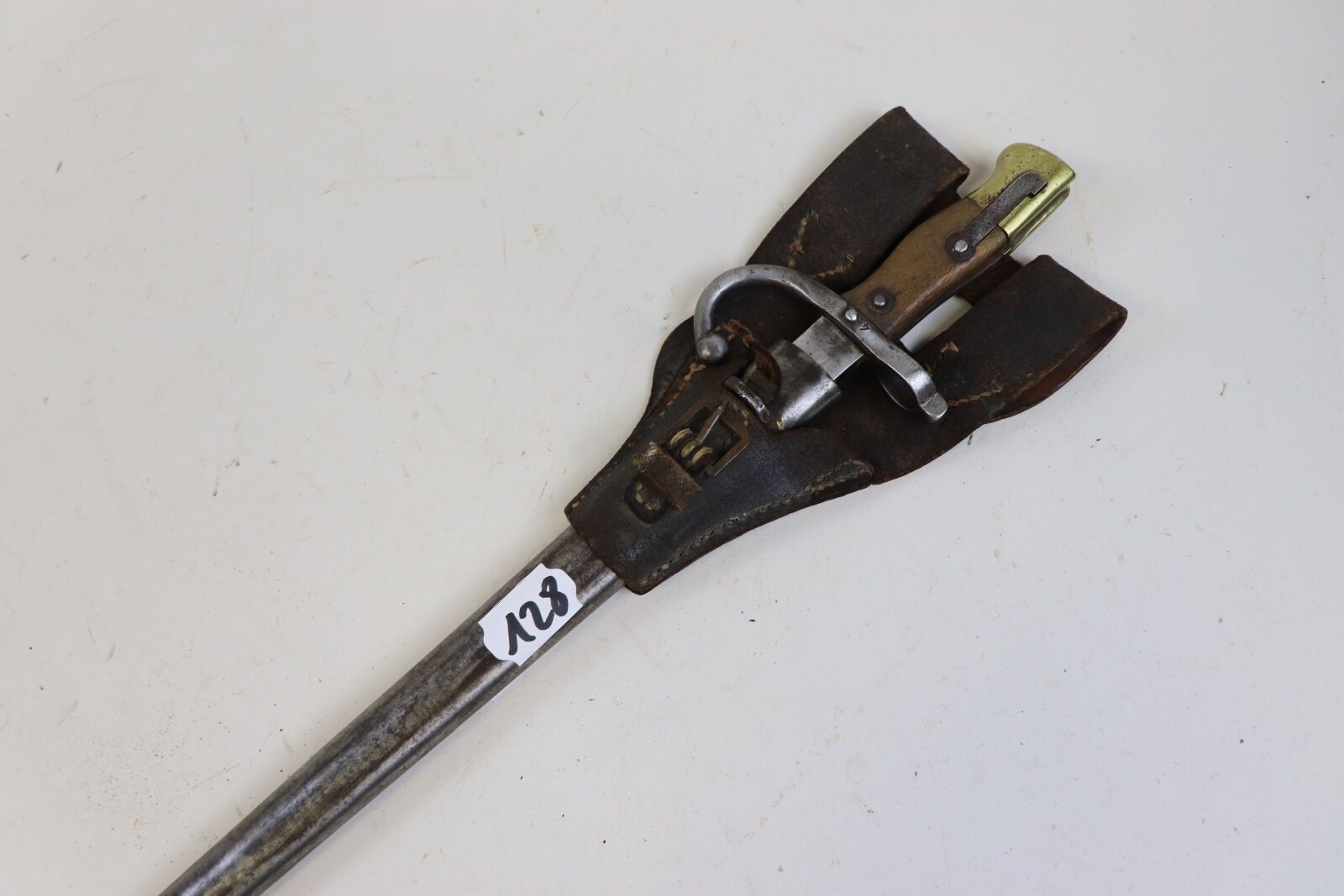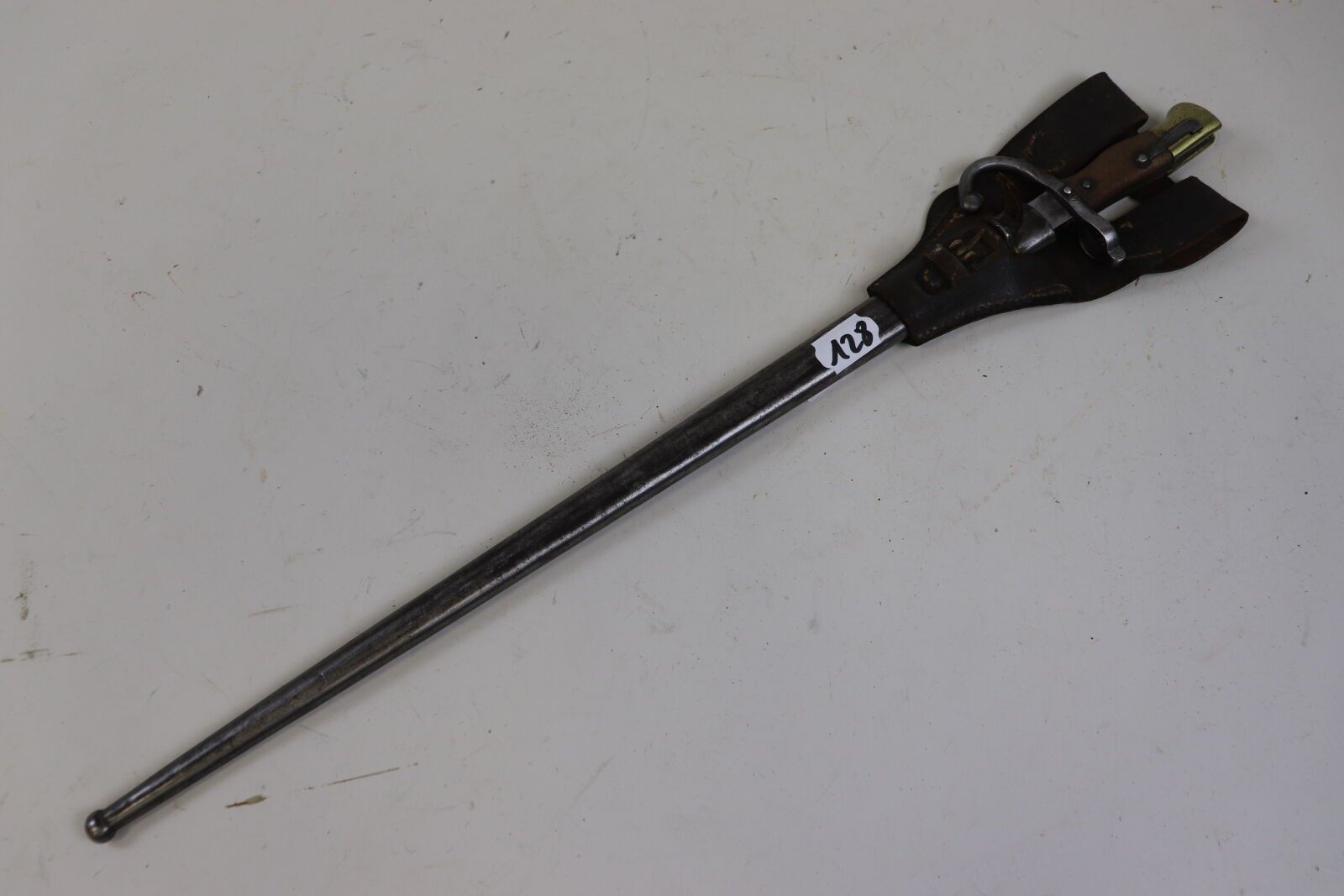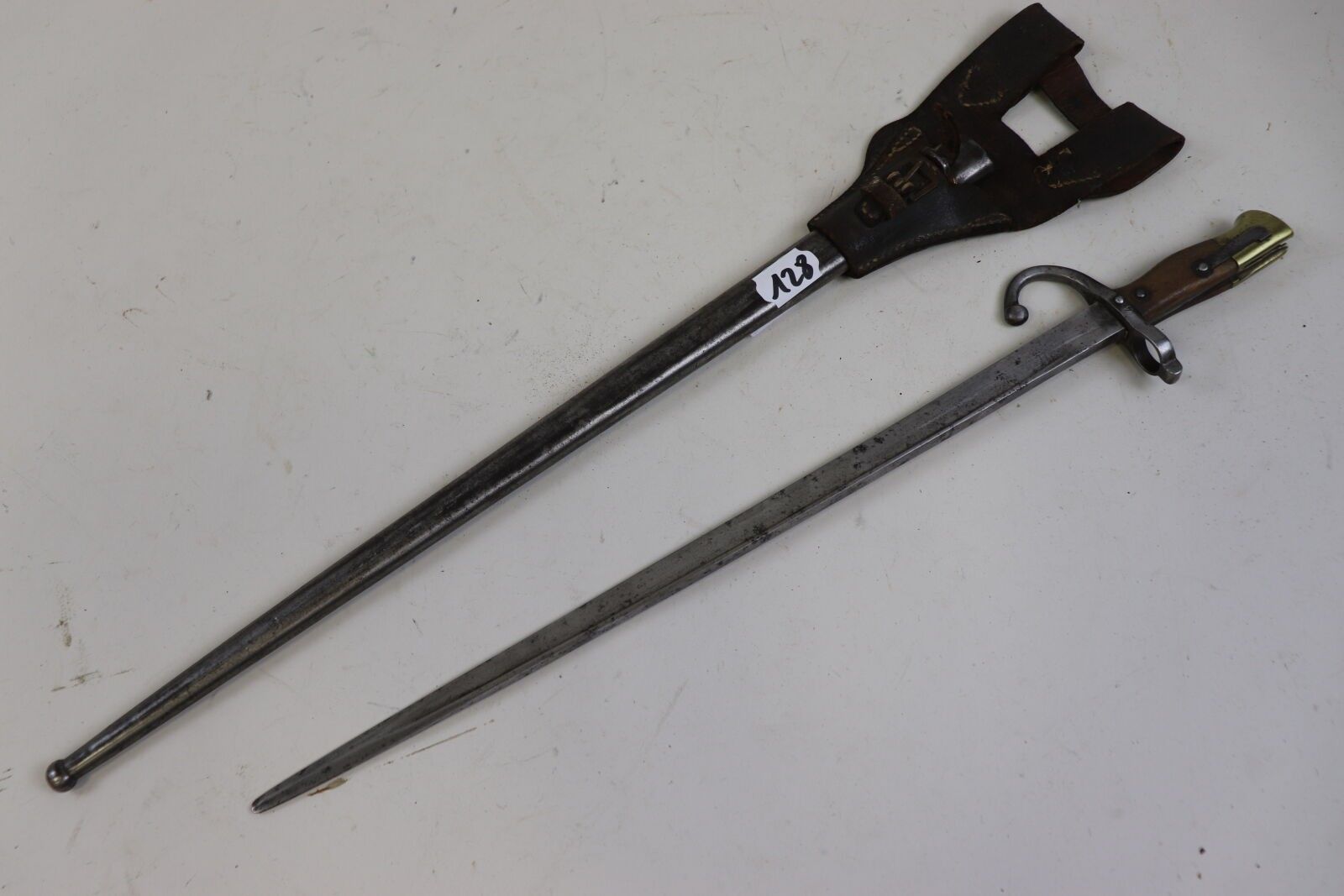 France School Battalion bayonet, model 1874. Iron scabbard. Leather scabbard (oxidation, scabbard lug missing).