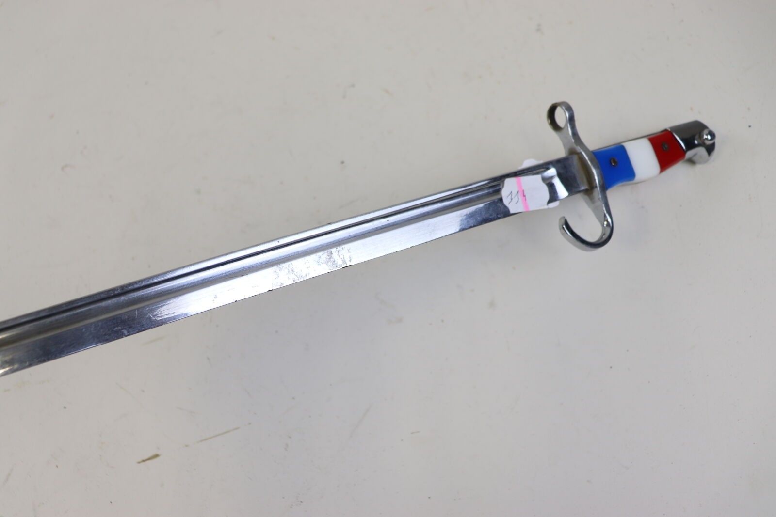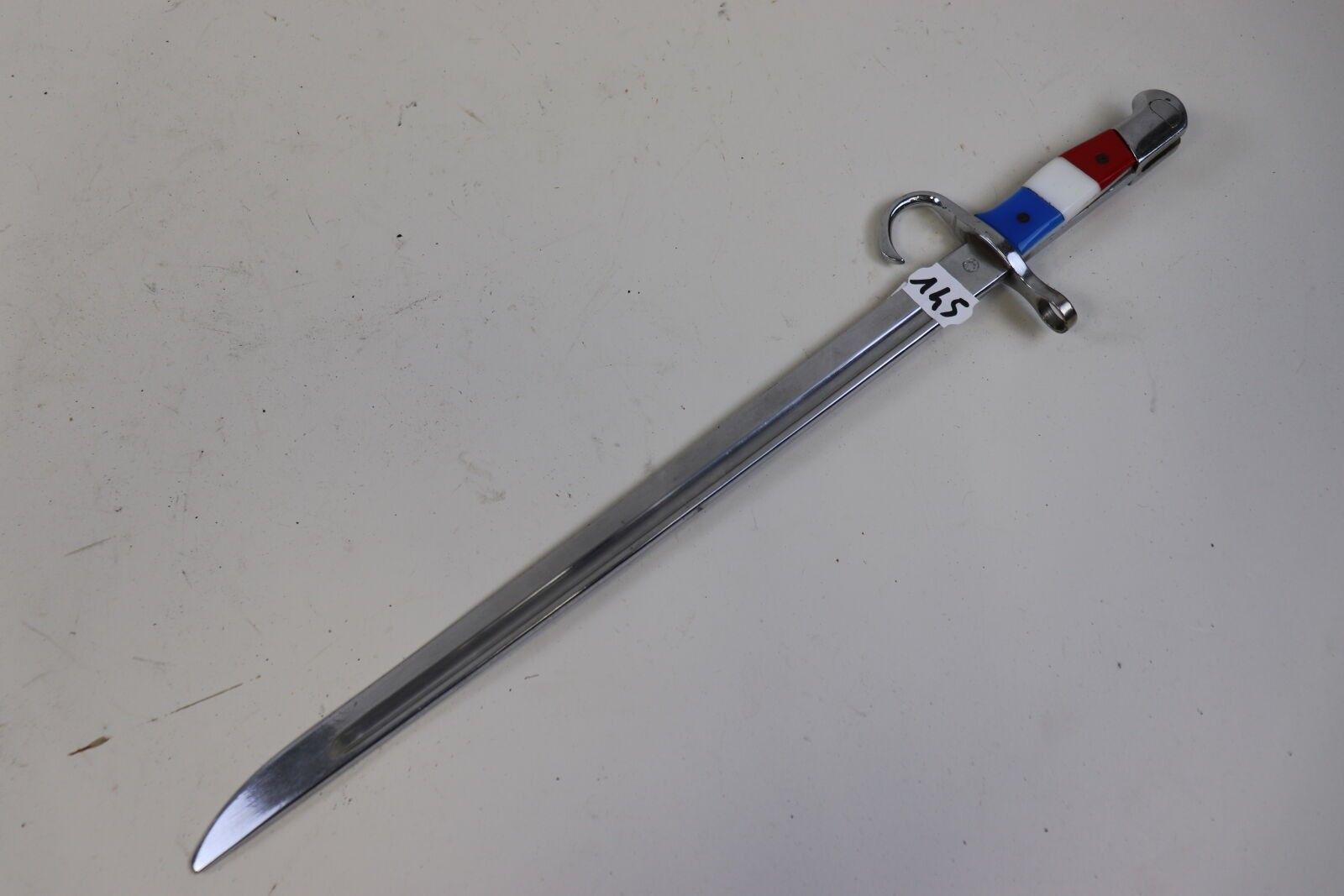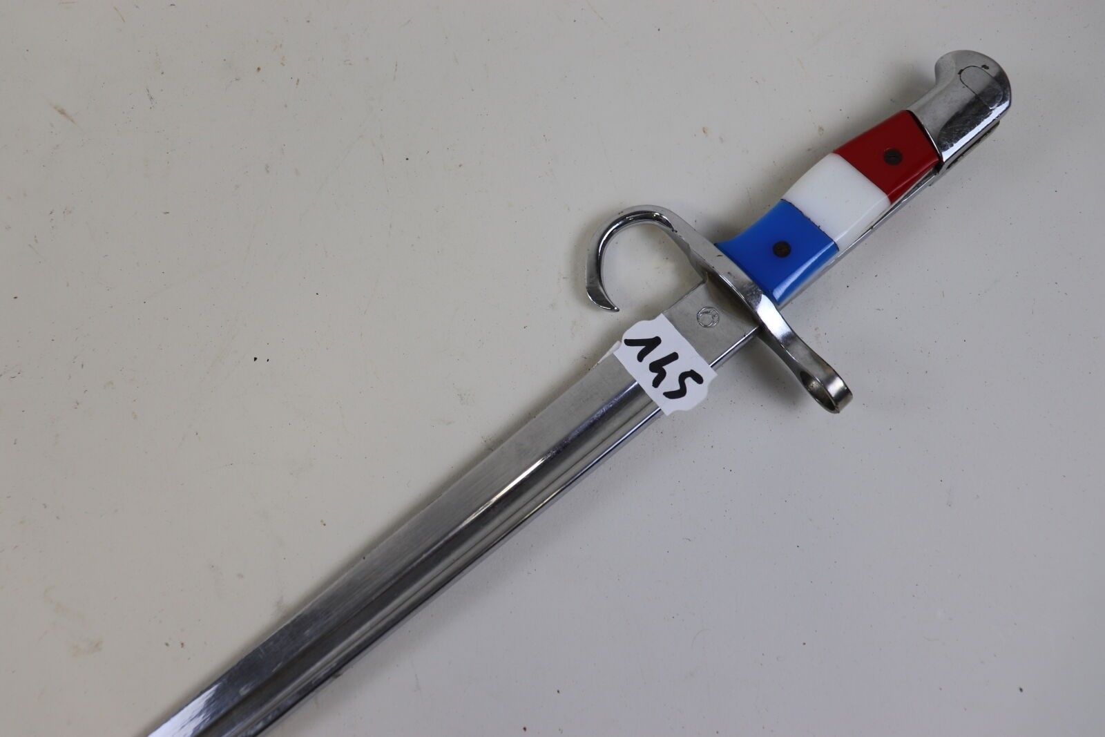 Japan Bayonet, type 30, nickel plated, with tricolour composition plates. ABE SF This bayonet would have been modified for an advertisement in the '70s (?). ABE SF